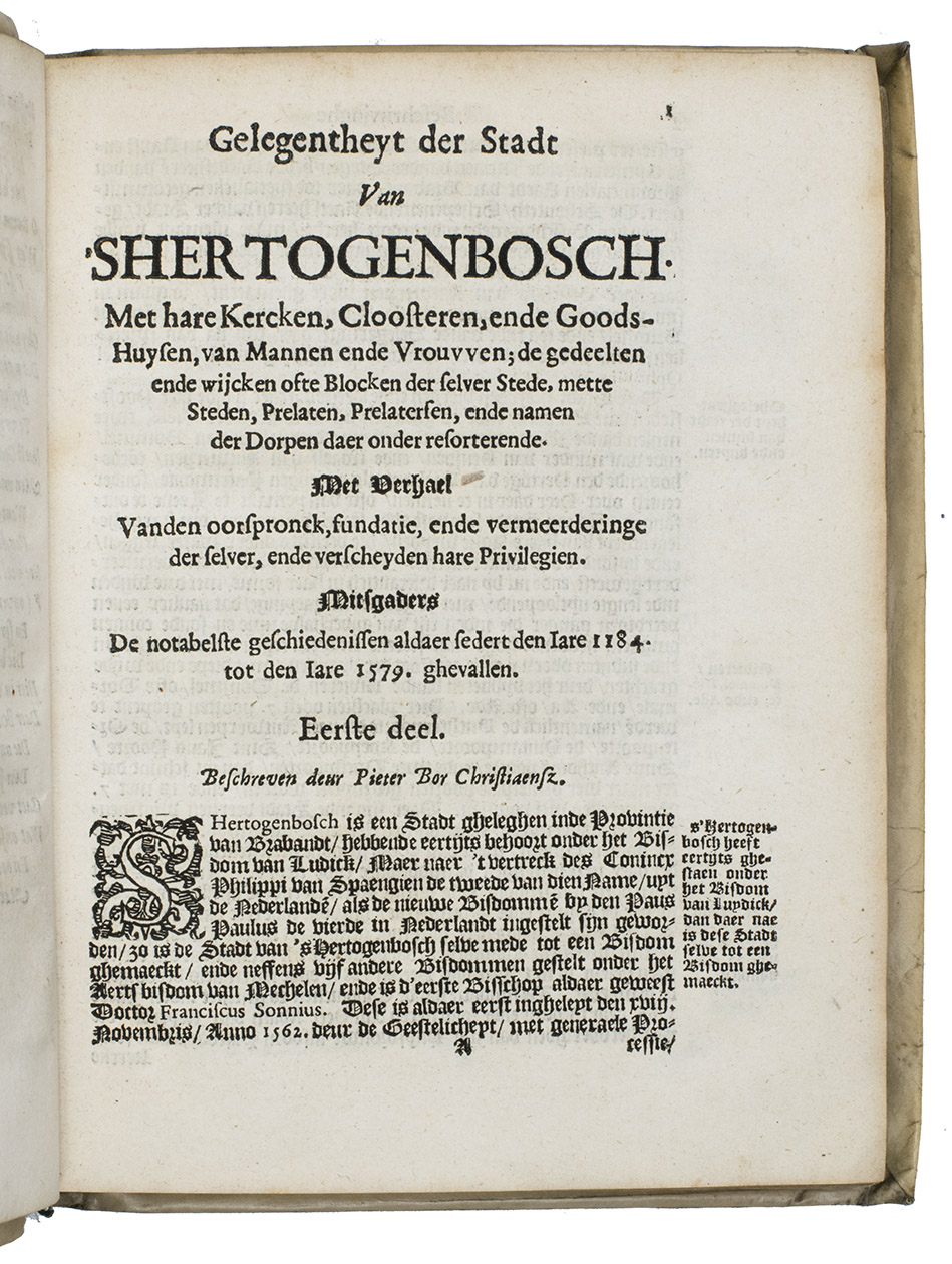 First and only edition of this early 17th-century detailed description of the city 's-Hertogenbosch in the duchy of Brabant by the famous Dutch historian Pieter Christiaenszoon Bor (1559-1635). Bor was a notary in Haarlem, but he dedicated his life to compiling primary sources, doing historical research, and writing the very detailed, precise and reliable history of the Dutch Revolt. That major historical work was Bor's magnum opus, which was first published in 1595 under the following title: Oorspronck, begin ende aenvang der Nederlantscher oorlogen [...] but he kept on revising and expanding the work. Apart from his magnum opus and the present work on 's-Hertogenbosch, Bor wrote one other work on the "origins of the Dutch wars": the cause and first few years from 1555-1567 of the Eighty Years' War (or Dutch War of Independence, 1555-1648).