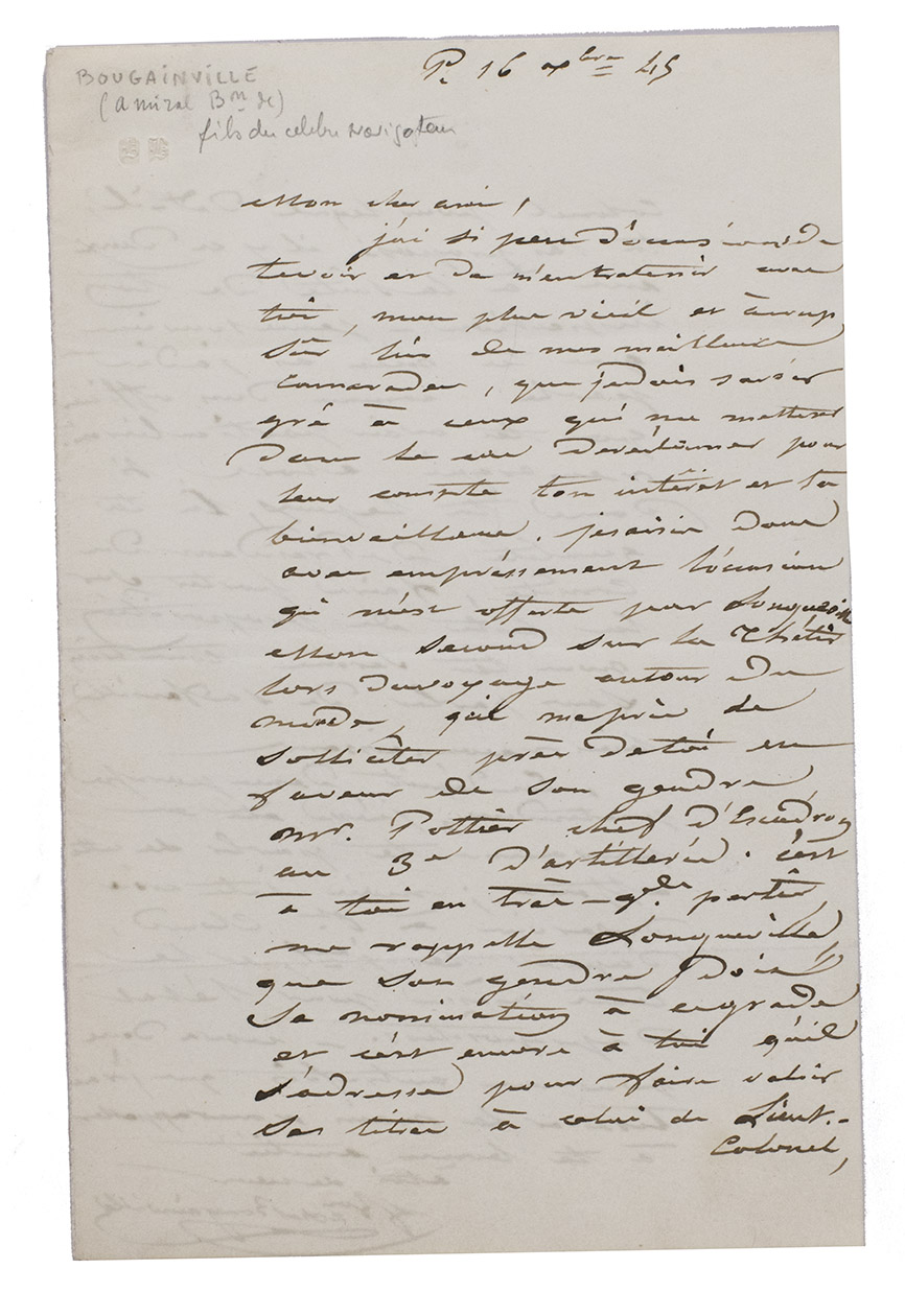Ad 3: Autograph letter signed by Hyacinthe de Bougainville to a "Cher ami". He wrote that he had been presented by the Minister, with some others that he didn't know, to the King as an option for being made a c[ontre] admiral (= Rear Admiral). "I am at the head of the list and if I stick to my titles I will be without worry ...". He invokes his deeds since 1830 and says that he wants to retire "if I am not done justice; the name I bear does not allow me to serve any longer as a stepping stone for others". Three days before, he was told that "le travail" was presented to the King, and indeed his appointment followed the same year.
