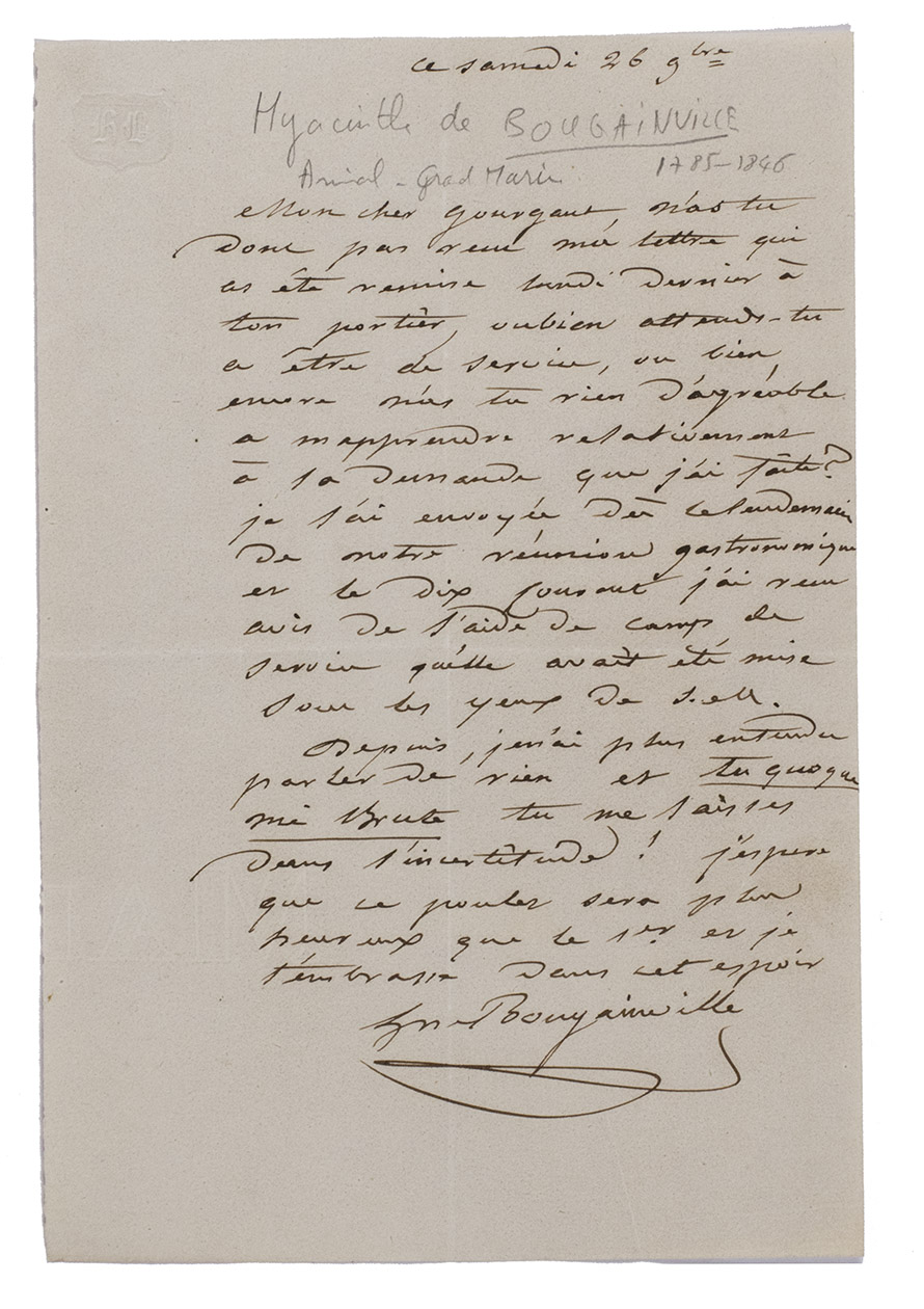 Ad 1: Autograph letter signed by Hyacinthe de Bougainville to Gaspar, baron Gourgaud. Hyacinthe complained that he had heard nothing from him since their last "réunion gastronomique" 16 days earlier.