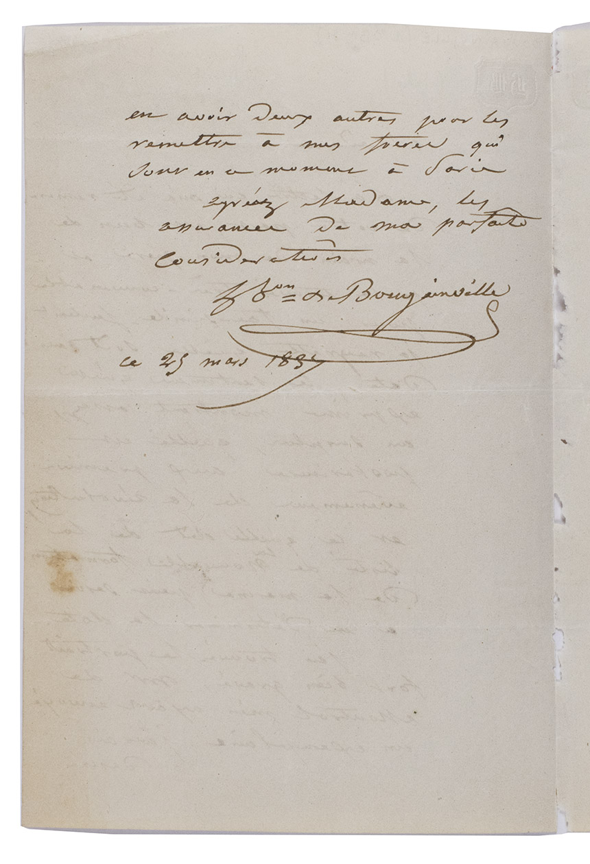 Ad 2: Autograph letter signed by Hyacinthe de Bougainville to Madame Delpeche. She was the widow of François Delpeche, an engraver who made a portrait of Hyacinthe's father Louis-Antoine de Bougainville in 1837.