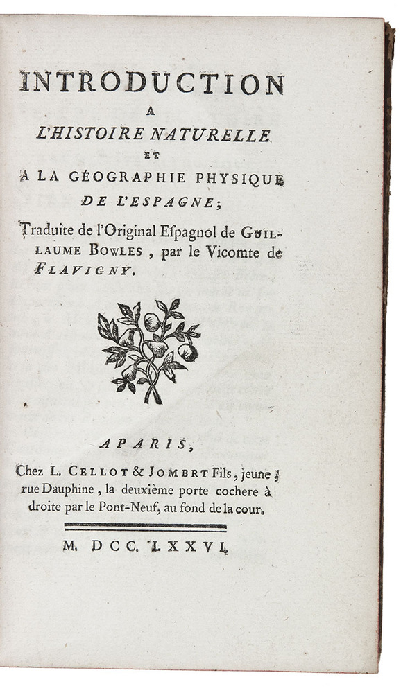 Introduction à l'histoire naturelle et à la géographie physique de l' Espagne; traduit de l'original espagnol de Guillaume Bowles, par le vicomte de Flavigny.