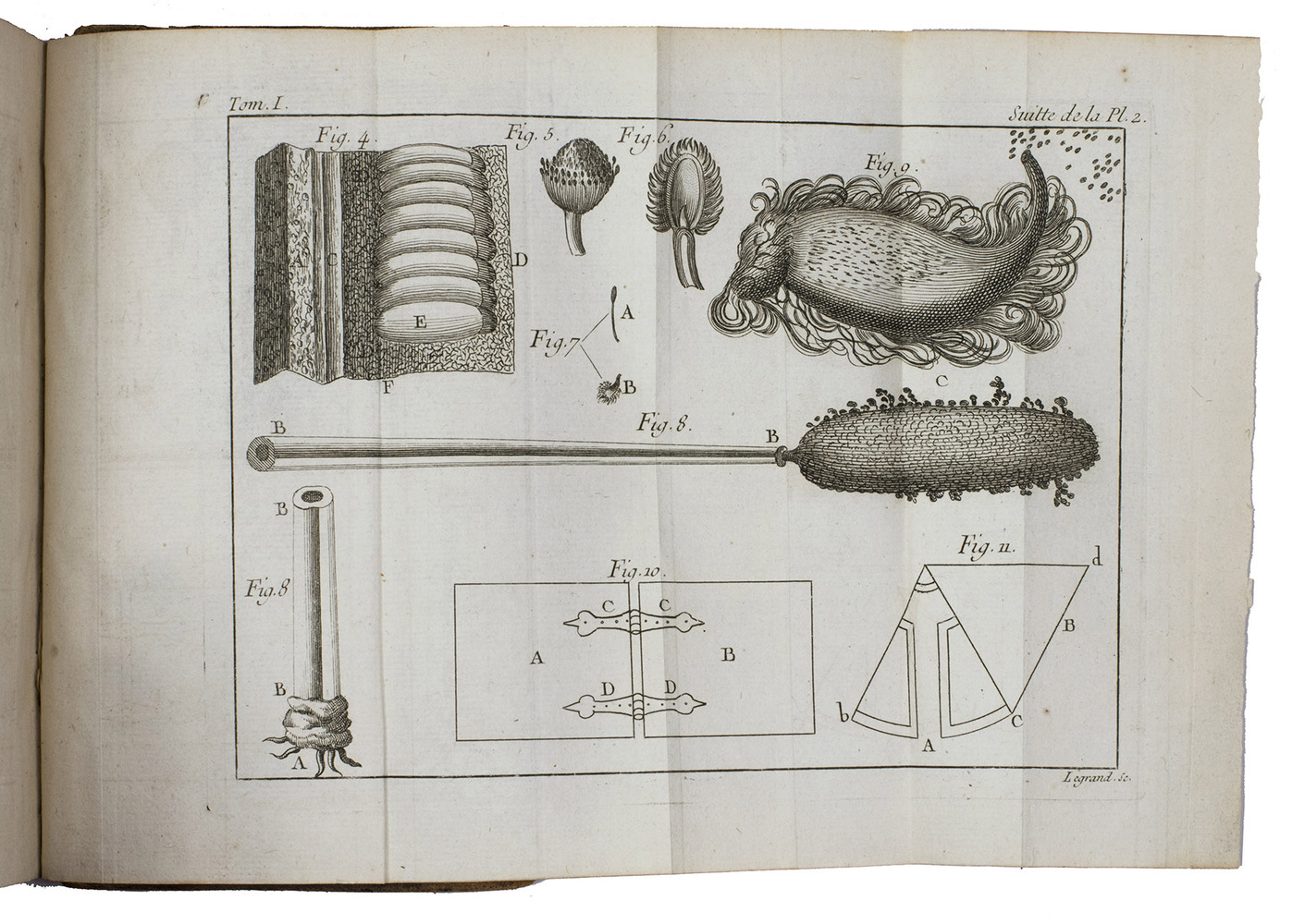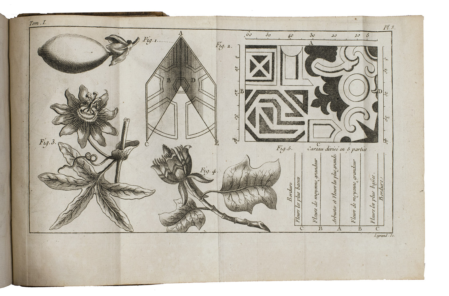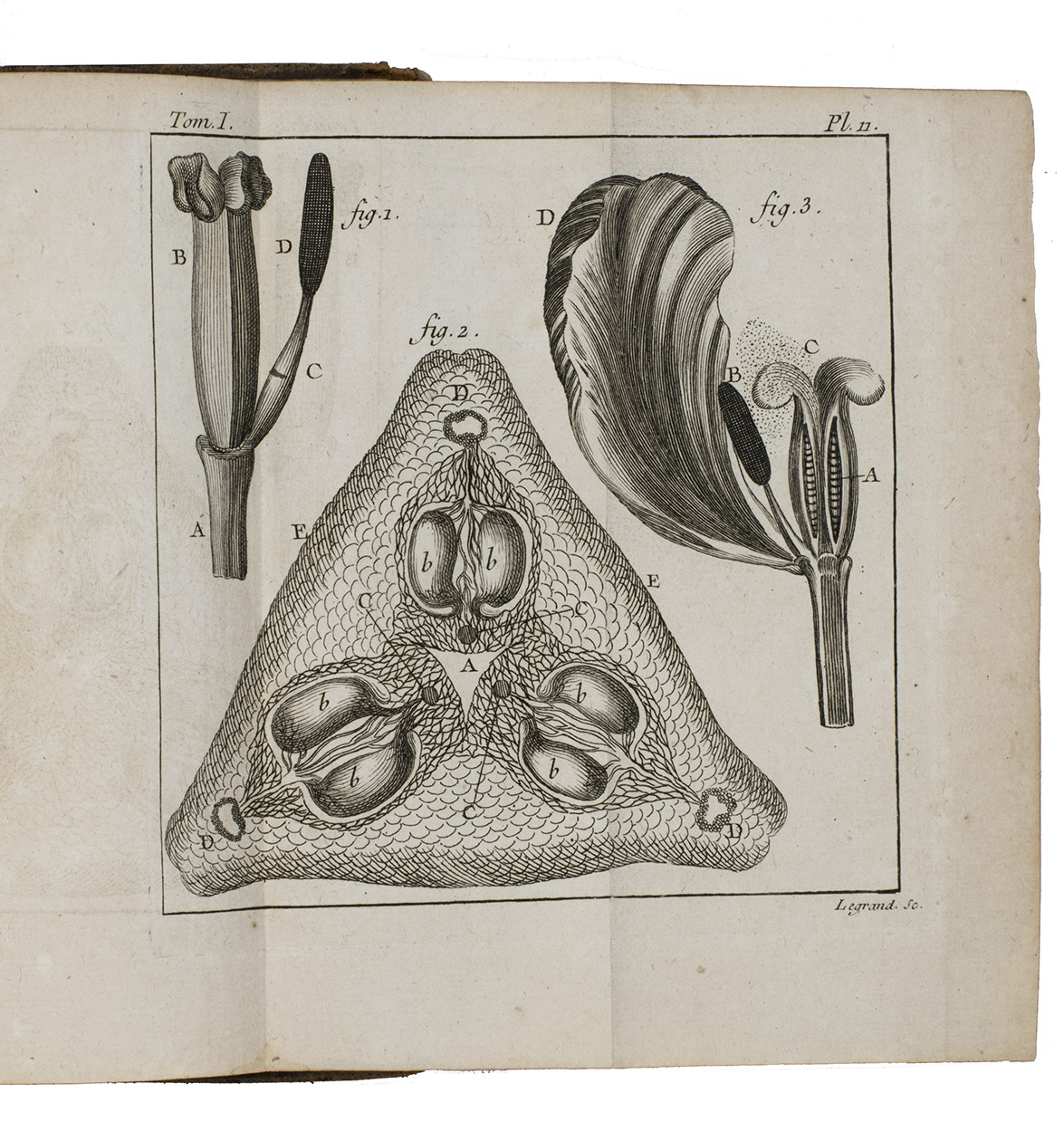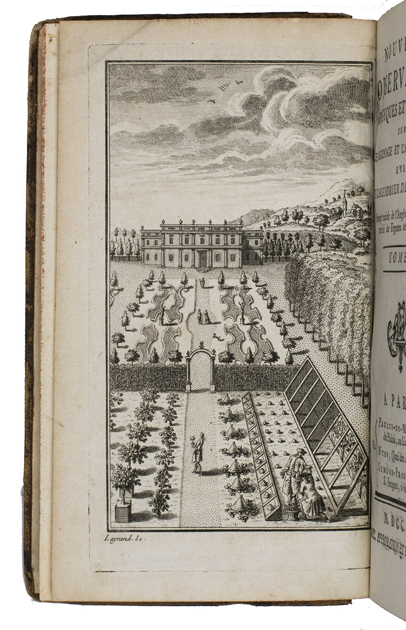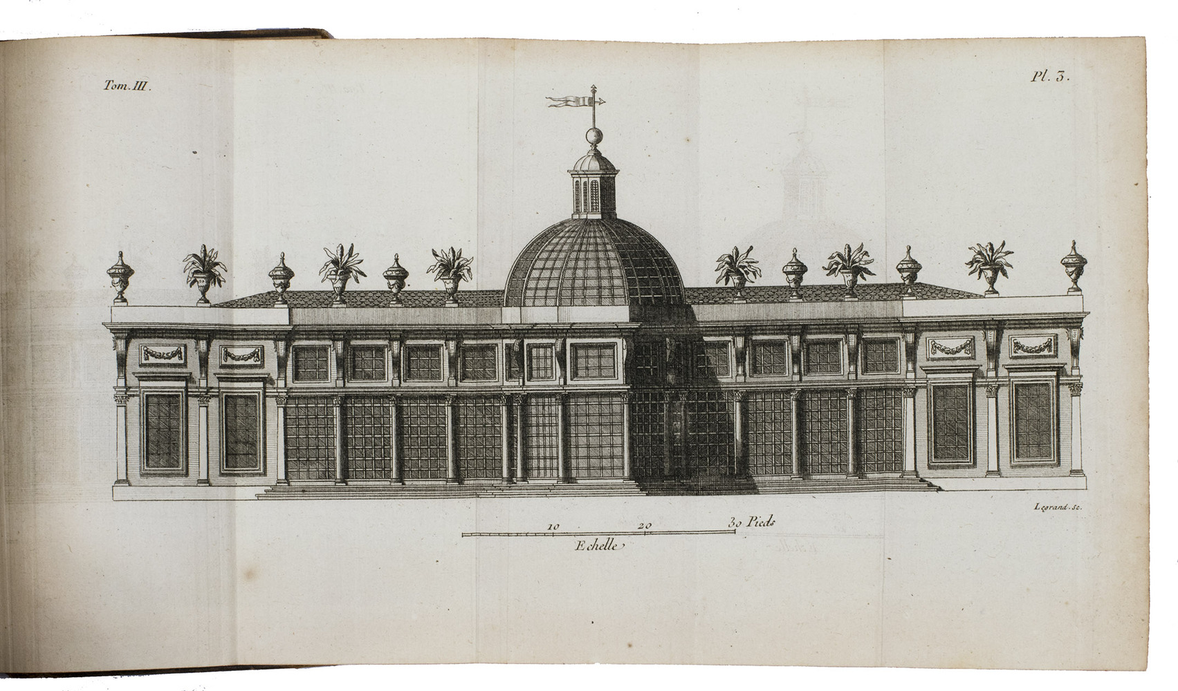 Paris, Pierre-Aug. Paulus du Mesnil, Jean-Luc Nyon, & Siméon-Prosper Hardy (colophons: printing offices of Moreau (vol. II) and Aug. Mart. Lottin (vol. III)), 1756. 3 volumes. 12mo. Engraved frontispiece depicting the gardens of a country estate, and 12 numbered folding engraved plates by Pierre-François Legrand, showing all kinds of flowers, garden lay-outs, insects etc., including 3 very interesting plates of a greenhouse (plan, interior and exterior views) in vol. 3 Contemporary mottled tanned sheepskin. frontispiece plus XXXVI, 358, [2]: [4 blank?], [5], X-XVI, 510, [2 blank]; [2], 12, "442"[=440] pp.
