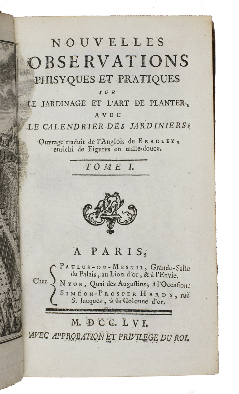 Nouvelles observations physiques et pratiques sur le jardinage et l'art de planter, avec le calendrier des jardiniers. Ouvrage traduit de l'Anglois de Bradley, enrichi de figures en taille-douce.