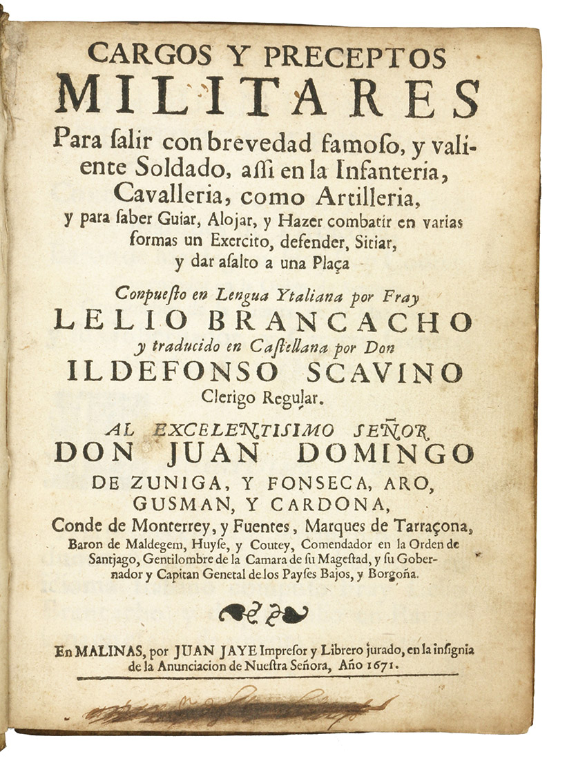 Extremely rare second Spanish edition of the military treatise I carichi militari by the Neapolitan commander of the Habsburg armies in Italy, the Low Countries and Catalonia and aide-de-camp to Albert, Archduke of Austria, first published in Italian at Antwerp in 1610. The first Spanish edition appeared in 1639 and the third in 1710. It describes the duties and functions of soldiers and generals of the infantry, cavalry and artillery, as well as the sovereign's responsibility to ensure order within the military.