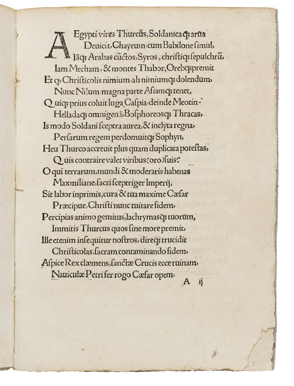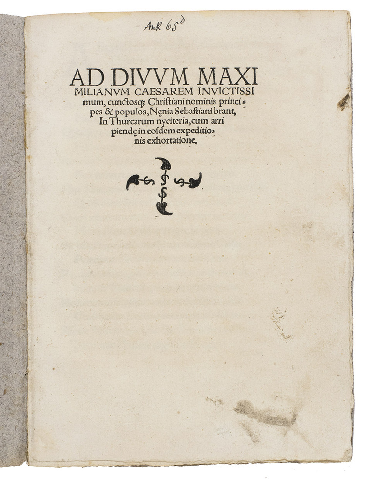 First edition of a 16th-century poem, which expresses outrage at Sultan Selim I (1470-1520) for his territorial expansions, and urges Emperor Maximilian I (1459-1519) to start a crusade against him. The sultan tripled the size of the Ottoman Empire during his reign and made it the preeminent Muslim state of the time. In 1516-1517 Selim conquered the Mamluk Sultanate and was able to add their entire territory to his empire, which included Syria, Palestine, Egypt and parts of the Arabian peninsula. He was not, however, in conflict with Europe.