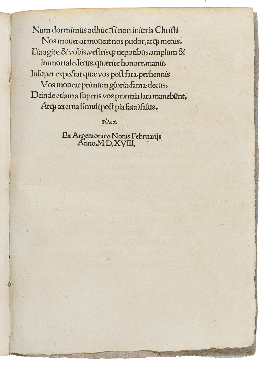 (Colophon:) Strasbourg, [Johann Knoblauch], 9 February 1518. 4to. With a small vignette built up from typographical ornaments on the title-page. 18th-century grey paper wrappers. [1], [1 blank], [5], [1 blank] pp.