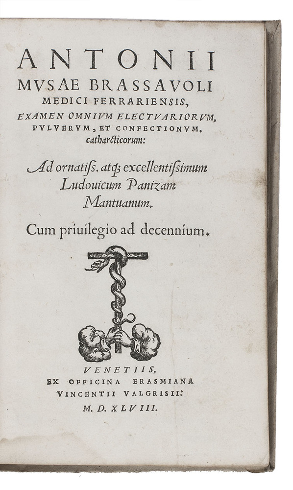 First edition of an important work on various medications, including powders. A second edition appeared one year later, printed in Lyon. It is written in the form of an imaginary dialogue on medicine between the author and senex, an old man. The author used the dialogue form to test or "examine" classical wisdom based on actual experience. He also used this method in his earlier and better known Examen omnium simplicium medicamentorum (1536), which examines classical botanical knowledge. He wrote to other books in the Examen omnium series, in 1538 and 1543, and by the time the present one appeared the three earlier ones were being reprinted almost every year. The Italian botanist and physician Antonio Musa Brasavola (1500-1555) was one of the first Italians, together with Manardi and Mondella, to revolt against the undisputed authority of the dominant medical system of Claudius Galenus. His witty method of examination through conversation allowed him to do so. The present medical work is not as well known as his botanical Examen omnium, but it is just as important, for he appears to be the first to perform a tracheostomy (an incision in the neck to allow air into the windpipe: see Garrison & Morton). Brasavola was a highly esteemed physician who served some of the great leaders of his time, including Pope Paul III, King Francis I of France and King Henry VIII of England.