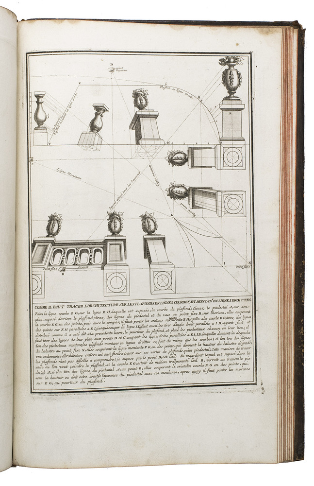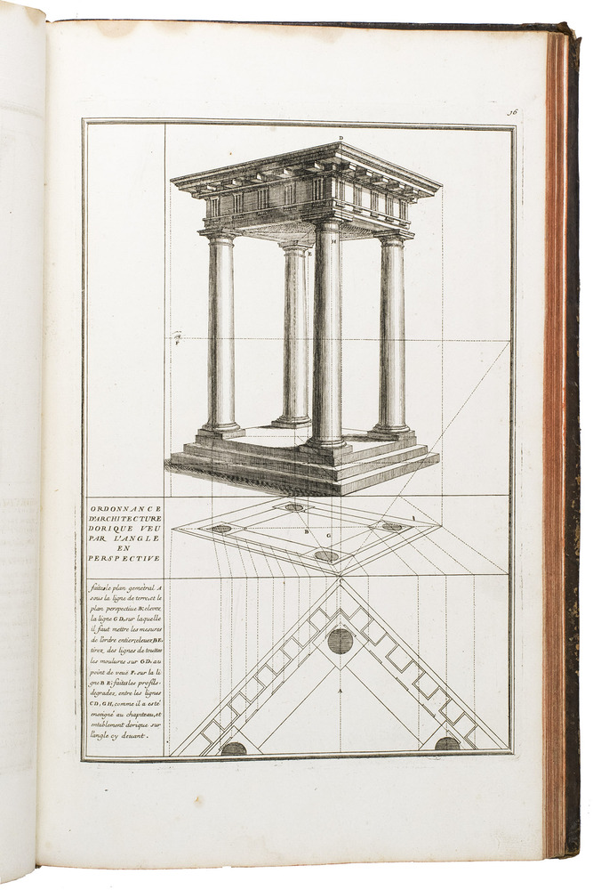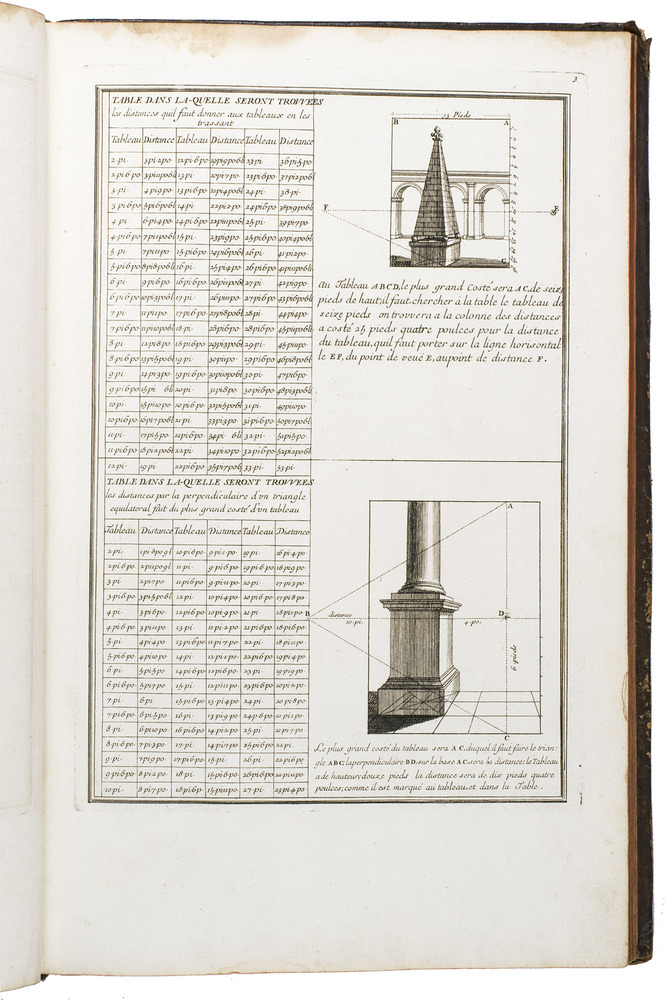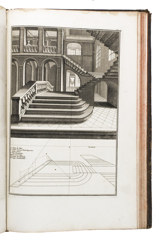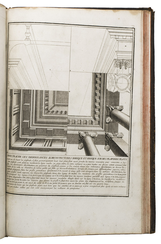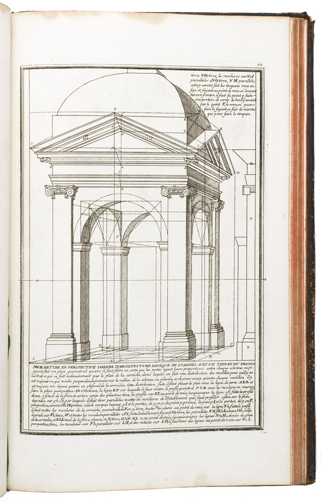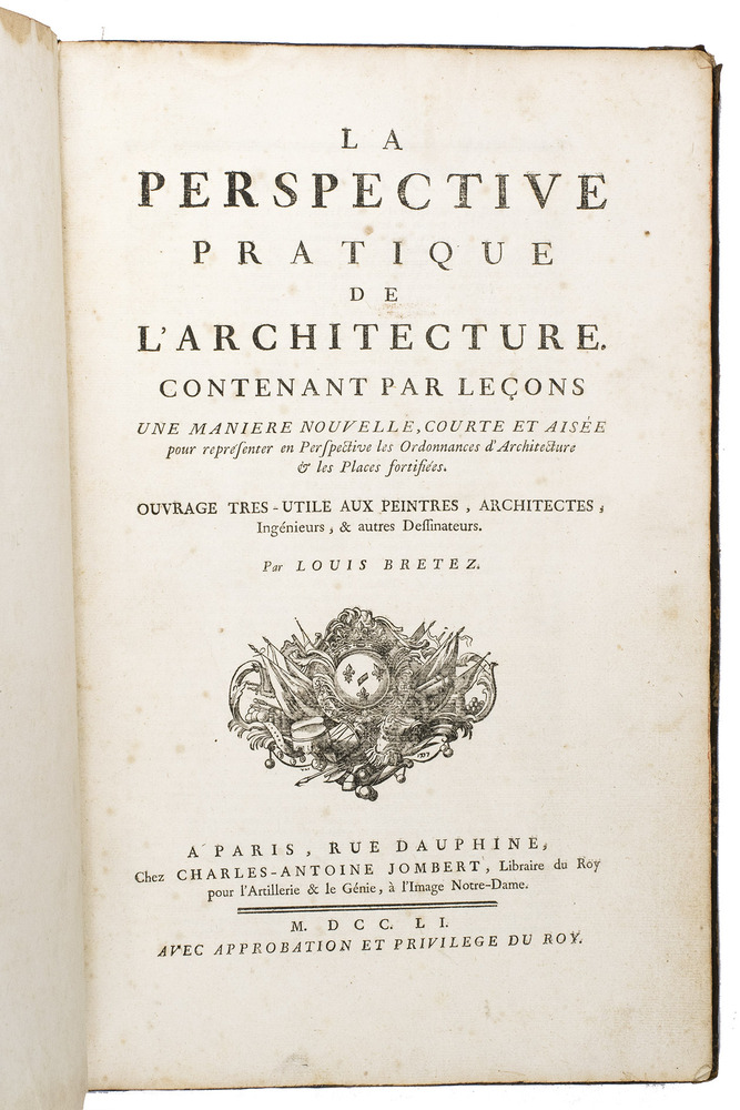 Enlarged edition of an extensive pictorial course in practical perspective for use of artists, architects and professional draughtsmen, with 60 large and beautifully engraved plates. The course starts with the principles of geometry, and then delves into columns, arches, vaulted ceilings, staircases, perspective for the theatre, and military perspective, including fortifications. It was created by architect and cartographer Louis Bretez (d. 1737), who is well known for designing the famous "plan de Turgot", a splendid bird's eye view of Paris. La perspective pratique de l'architecture is his book and was first published in 1706. The present edition is the second, which has been enlarged with five additional plates.
