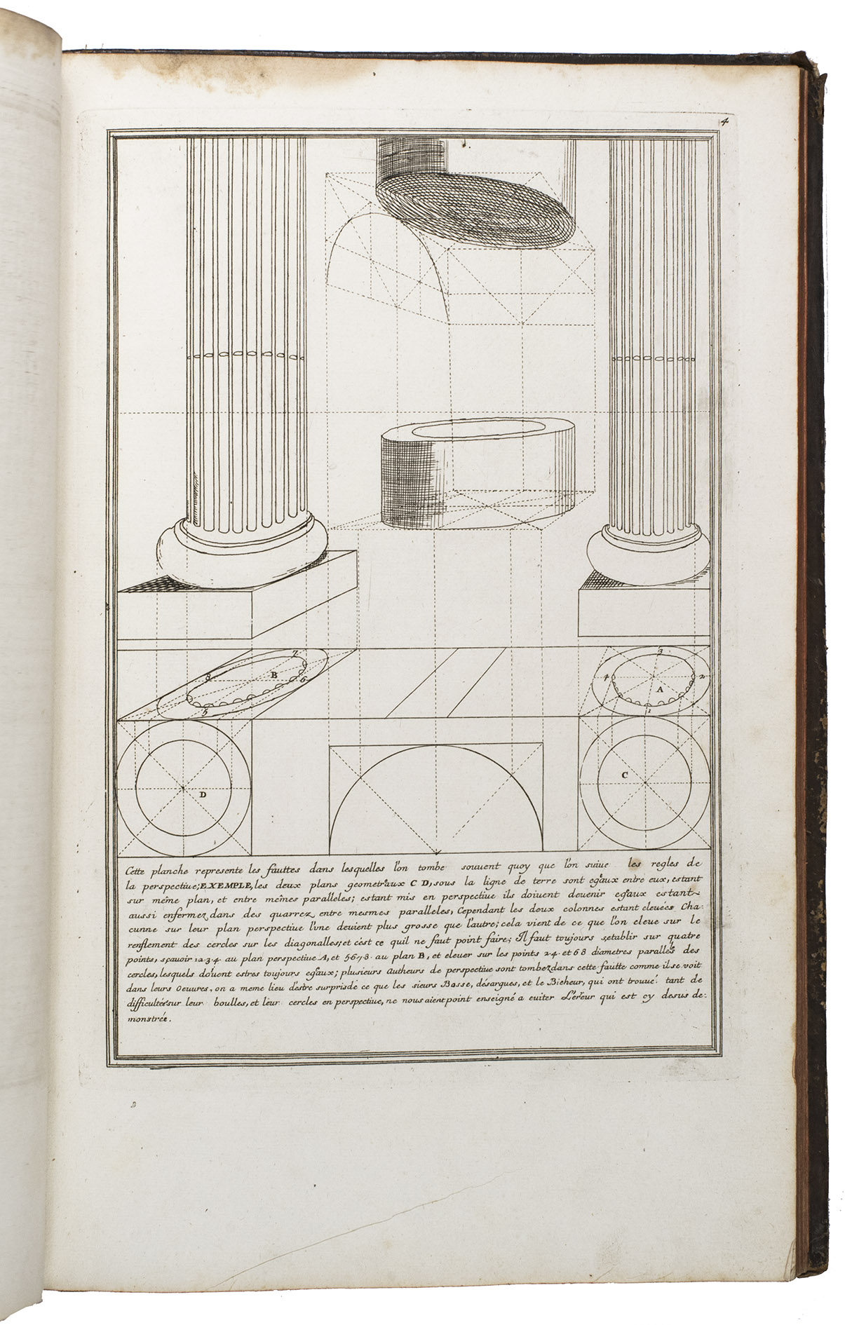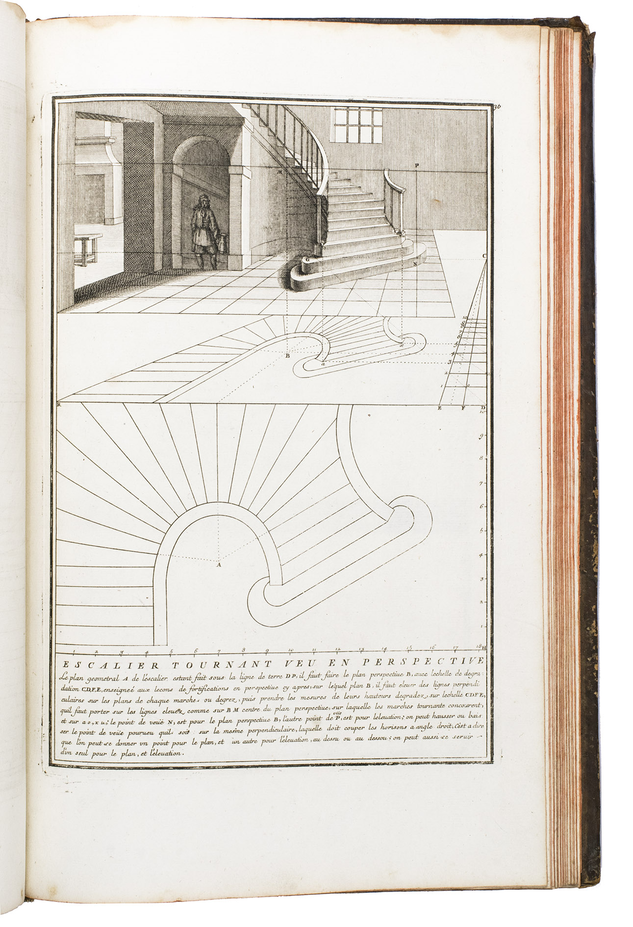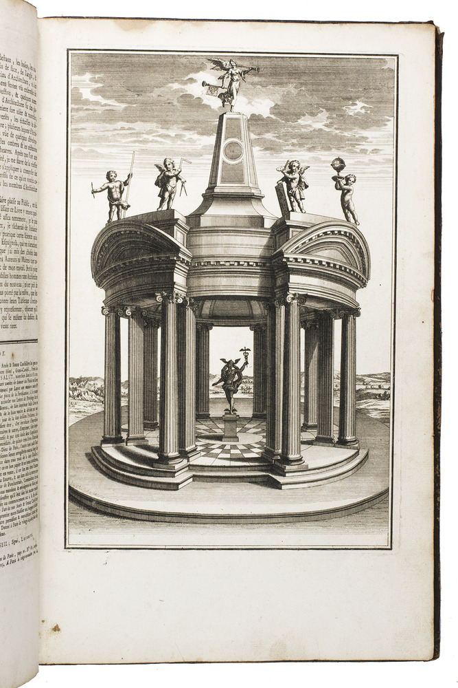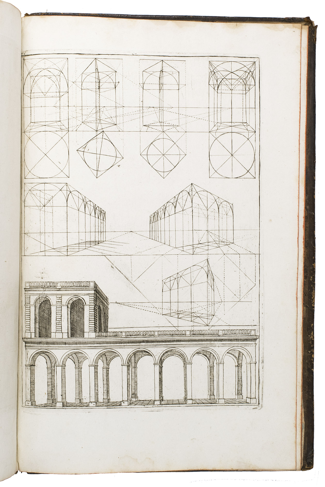Enlarged edition of an extensive pictorial course in practical perspective for use of artists, architects and professional draughtsmen, with 60 large and beautifully engraved plates. The course starts with the principles of geometry, and then delves into columns, arches, vaulted ceilings, staircases, perspective for the theatre, and military perspective, including fortifications. It was created by architect and cartographer Louis Bretez (d. 1737), who is well known for designing the famous "plan de Turgot", a splendid bird's eye view of Paris. La perspective pratique de l'architecture is his book and was first published in 1706. The present edition is the second, which has been enlarged with five additional plates.