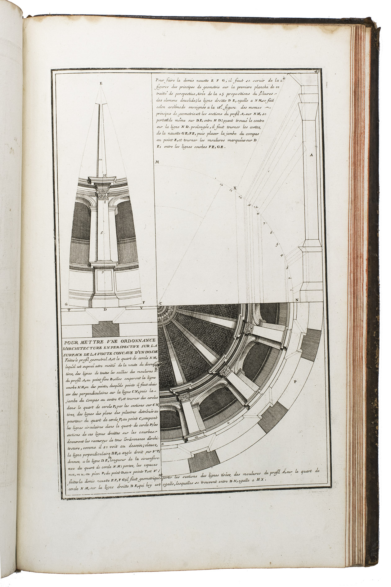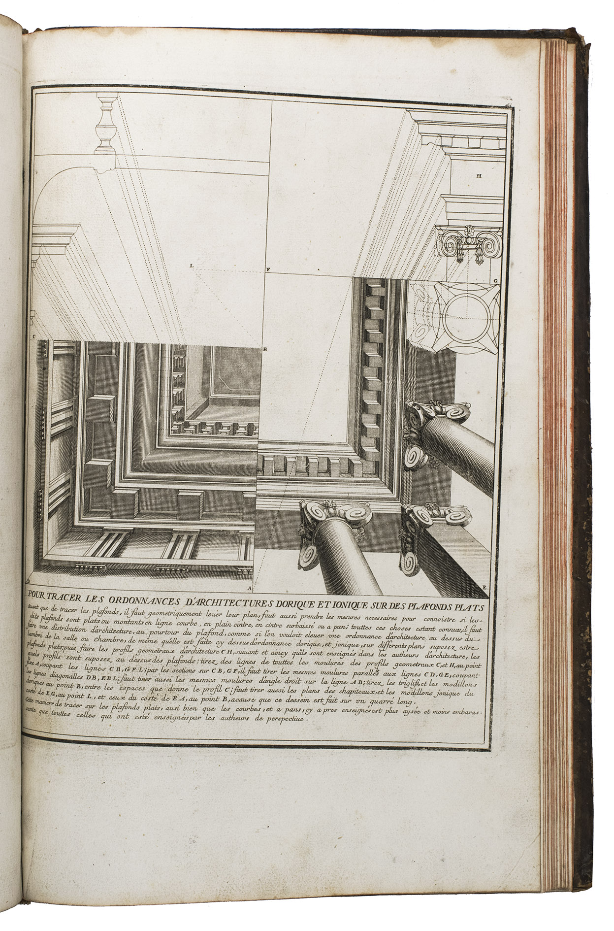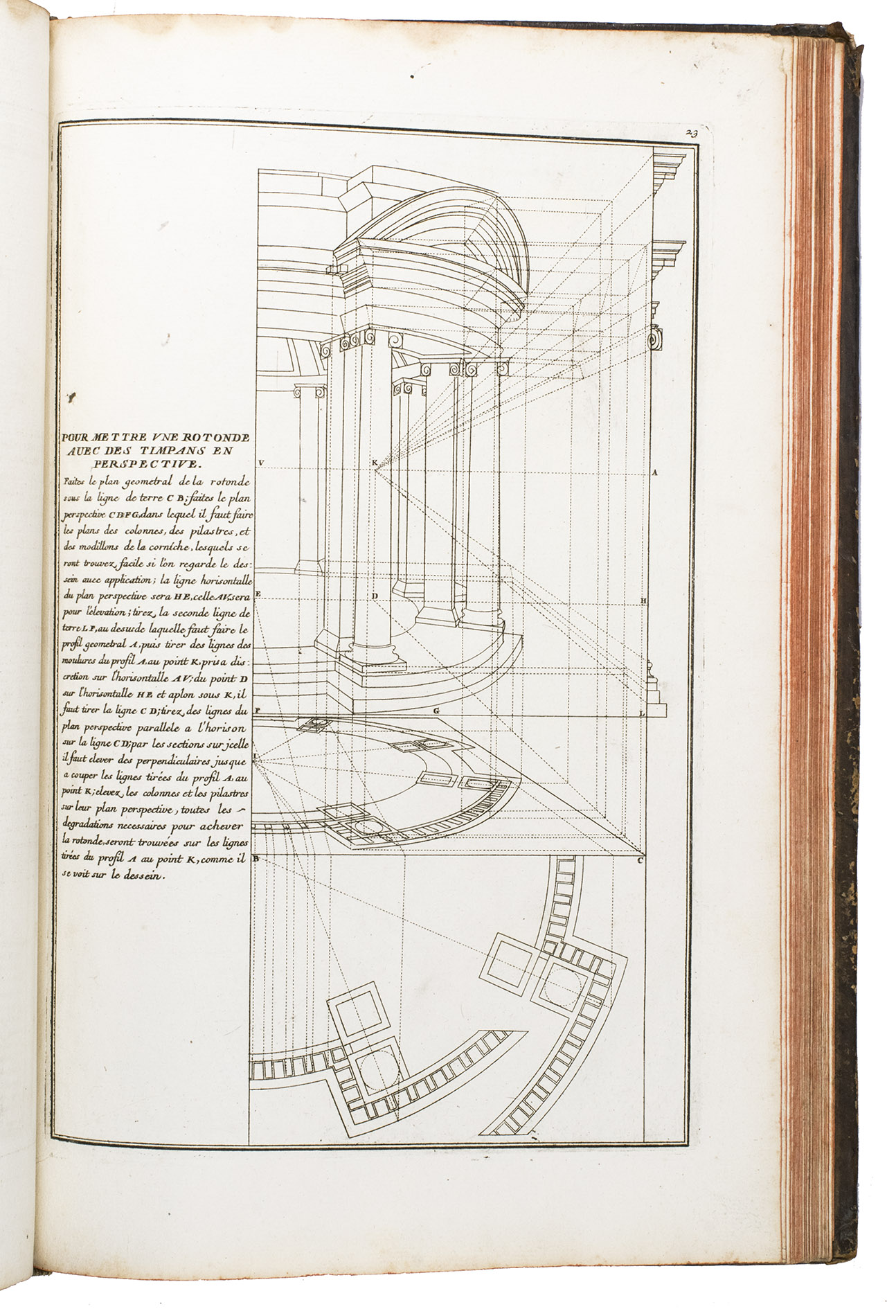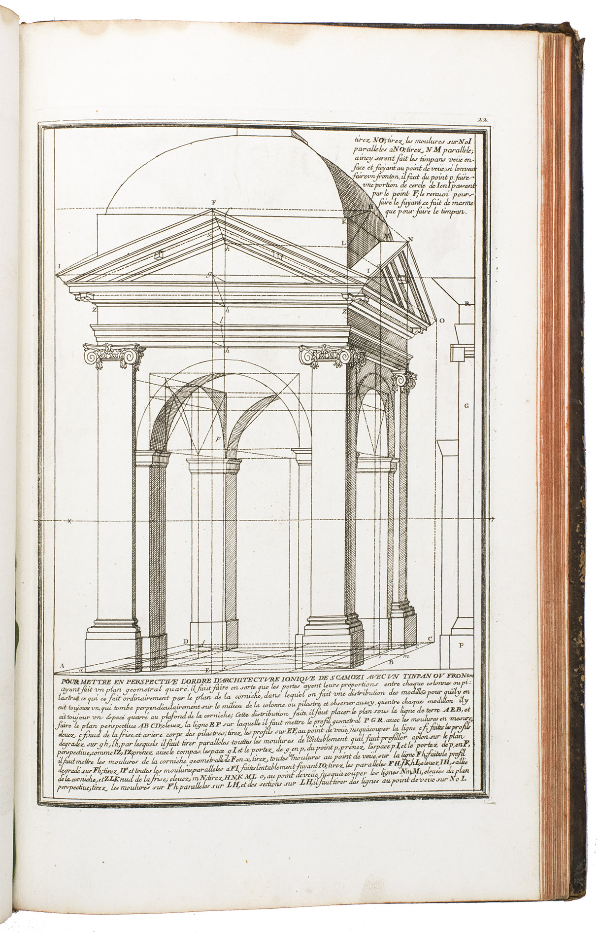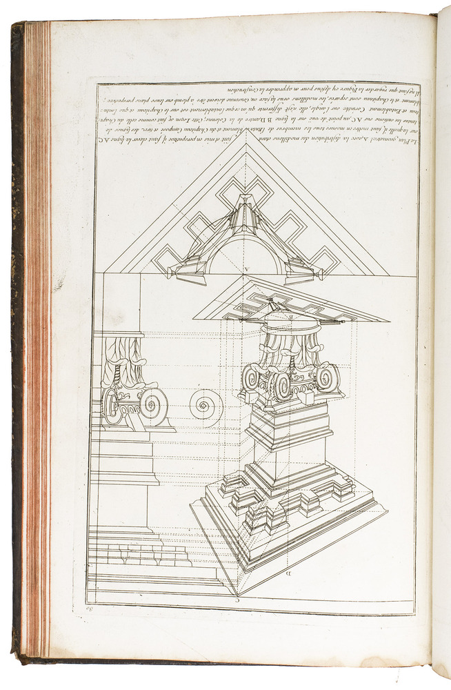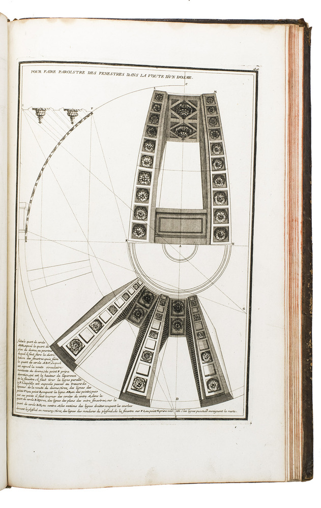 With a bookplate ("De la bibliothèque de M. ... (?)") mounted on the second free flyleaf . The edges and corners of the boards are scuffed, the boards are somewhat rubbed, lacking the title label on the spine, the hinges have weakened, but the structural integrity of the binding is still intact, missing a portion of leather at the head and foot of the spine. The title page is slightly foxed, some of the plates are slightly soiled, the edges of plate 19 are slightly frayed. Otherwise in good condition. Fowler 66 (mentions only 4 additional plates); Vagnetti EIVb3; cf. Berlin Kat. 4727 (other ed.); Kemp, The science of art, p. 227; not in Catalogue of the British architectural library.