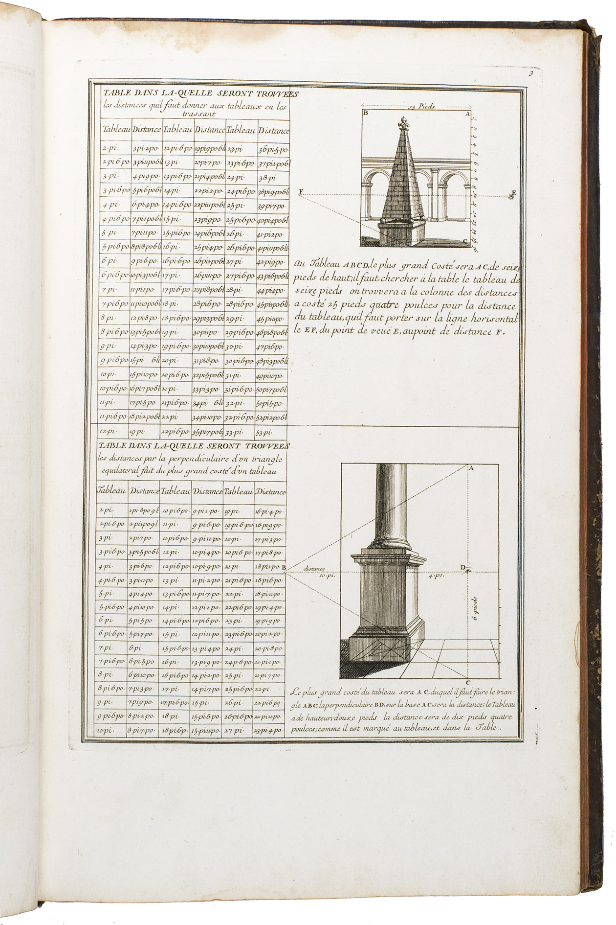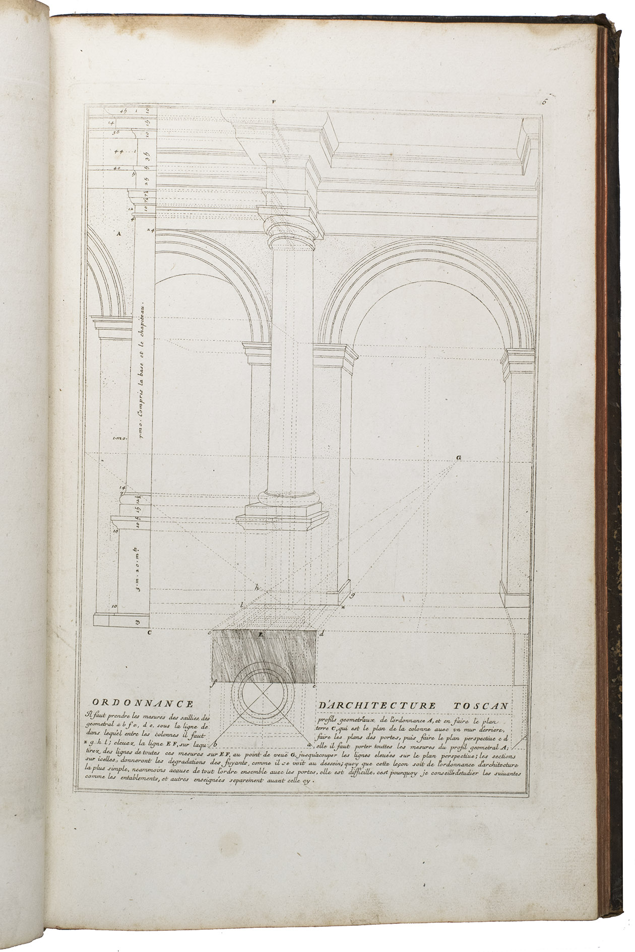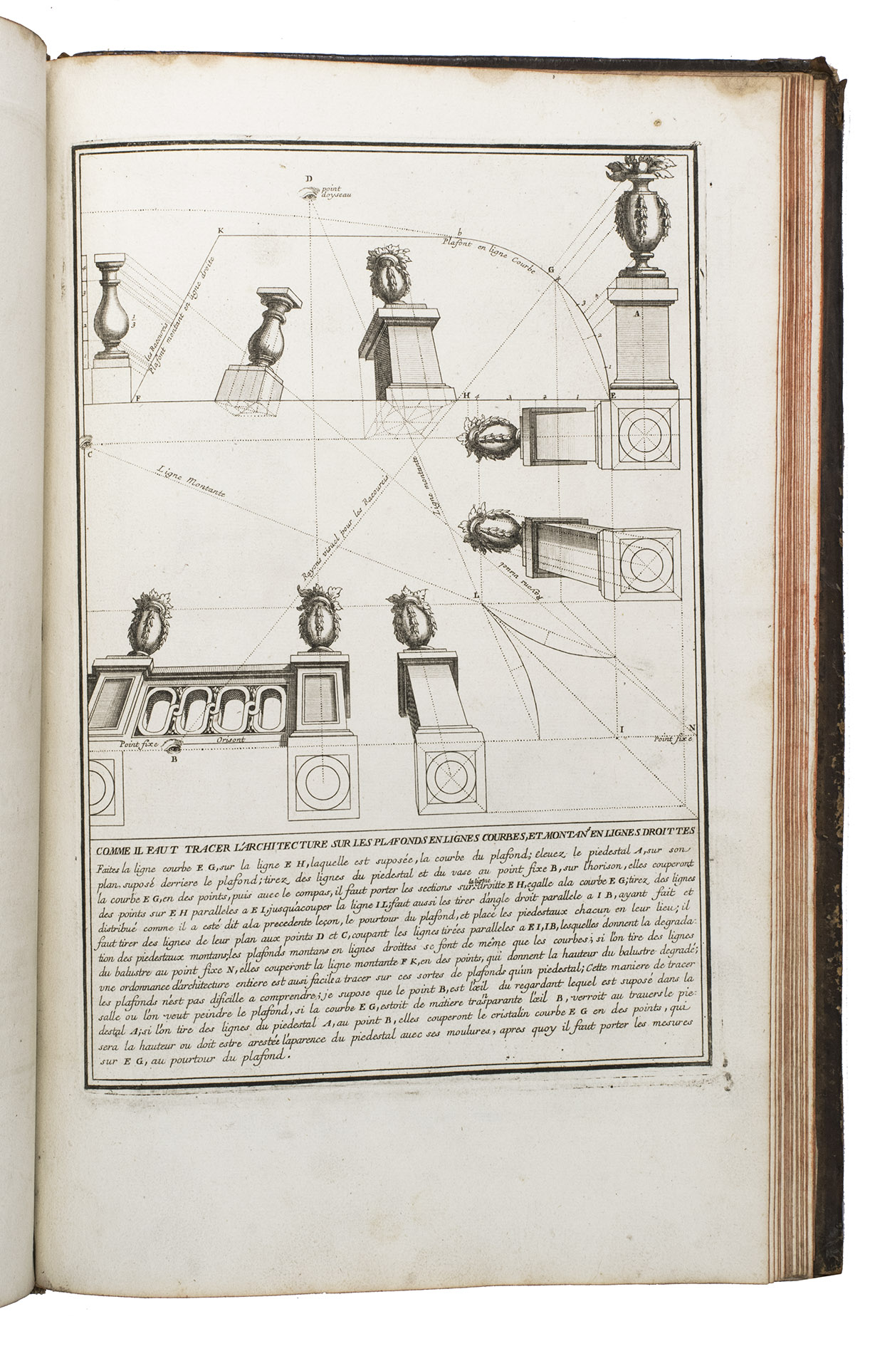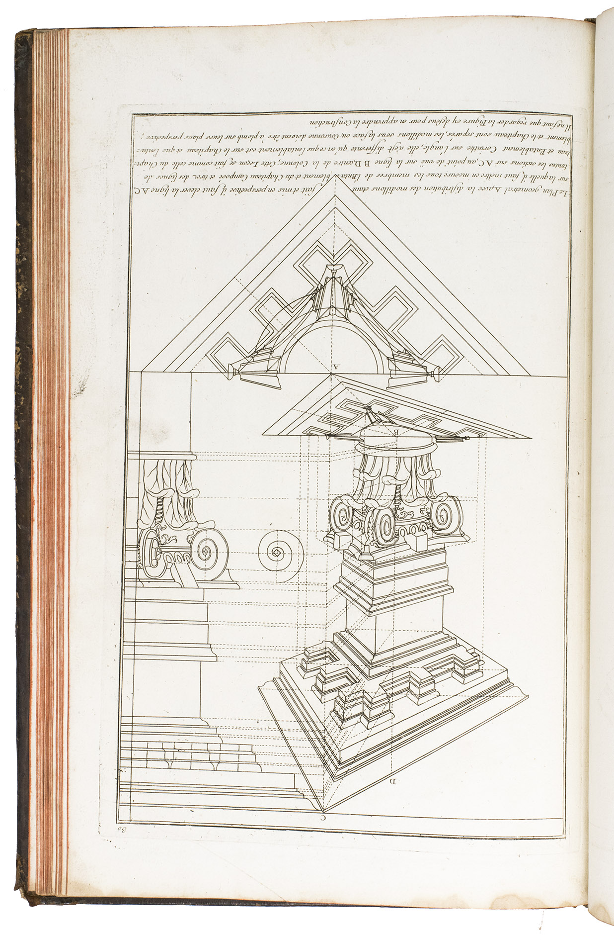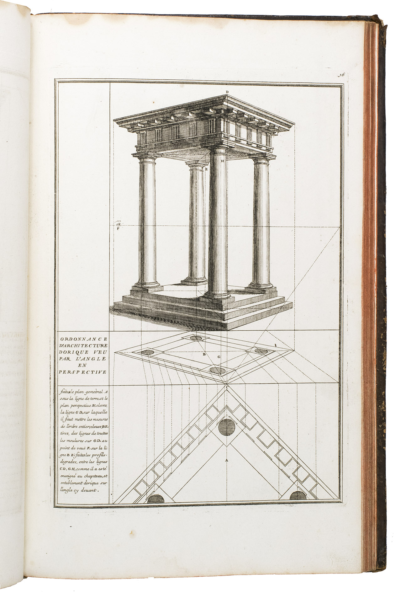 With a bookplate ("De la bibliothèque de M. ... (?)") mounted on the second free flyleaf . The edges and corners of the boards are scuffed, the boards are somewhat rubbed, lacking the title label on the spine, the hinges have weakened, but the structural integrity of the binding is still intact, missing a portion of leather at the head and foot of the spine. The title page is slightly foxed, some of the plates are slightly soiled, the edges of plate 19 are slightly frayed. Otherwise in good condition. Fowler 66 (mentions only 4 additional plates); Vagnetti EIVb3; cf. Berlin Kat. 4727 (other ed.); Kemp, The science of art, p. 227; not in Catalogue of the British architectural library.