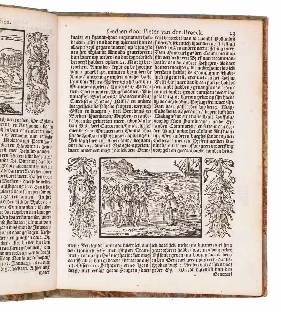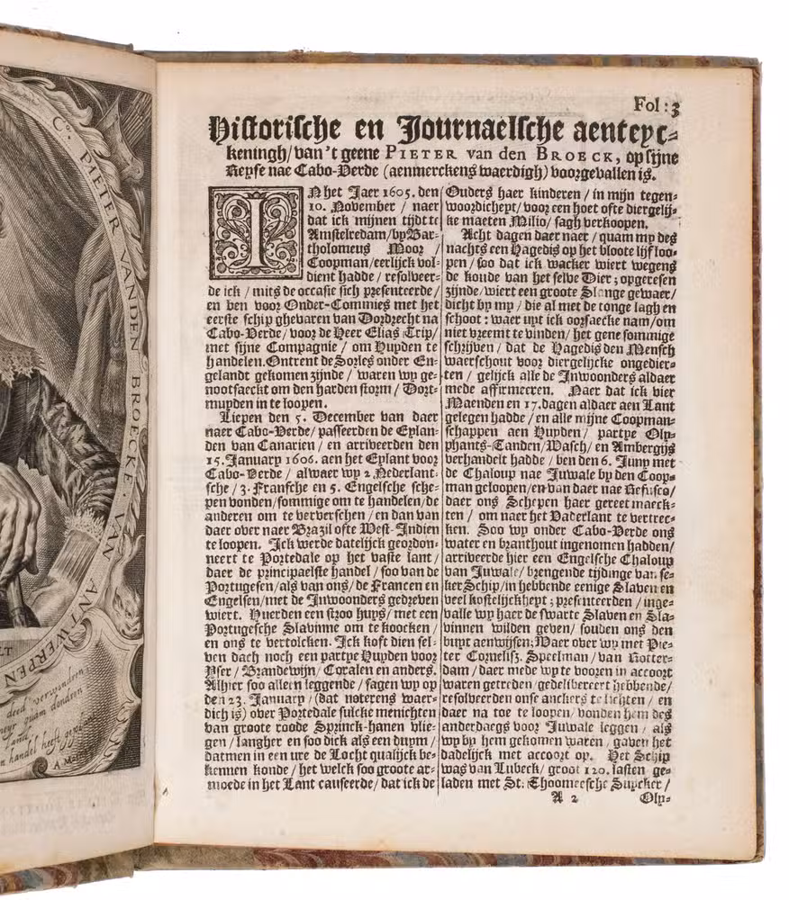 Rare, richly illustrated edition of an important account of five trading voyages to Cape Verde, Angola, Congo, Guinea, and the East Indies. It was one of the first Europeans works to describe the communities in West and Central Africa, and comment extensively on the commercial strategies of Dutch merchants along the African west coast. It also includes a beautiful portrait of the author, engraved after the painted portrait by Frans Hals. The present edition is exceptionally rare, as we have only been able to trace 9 copies in institutions, and none in sales records of the past hundred years.