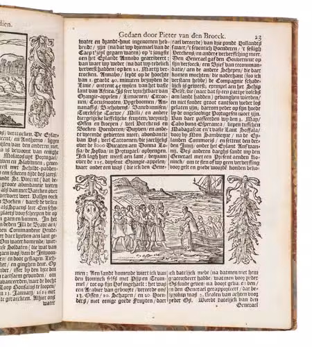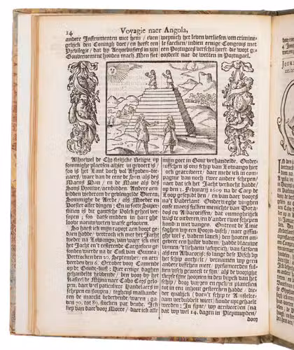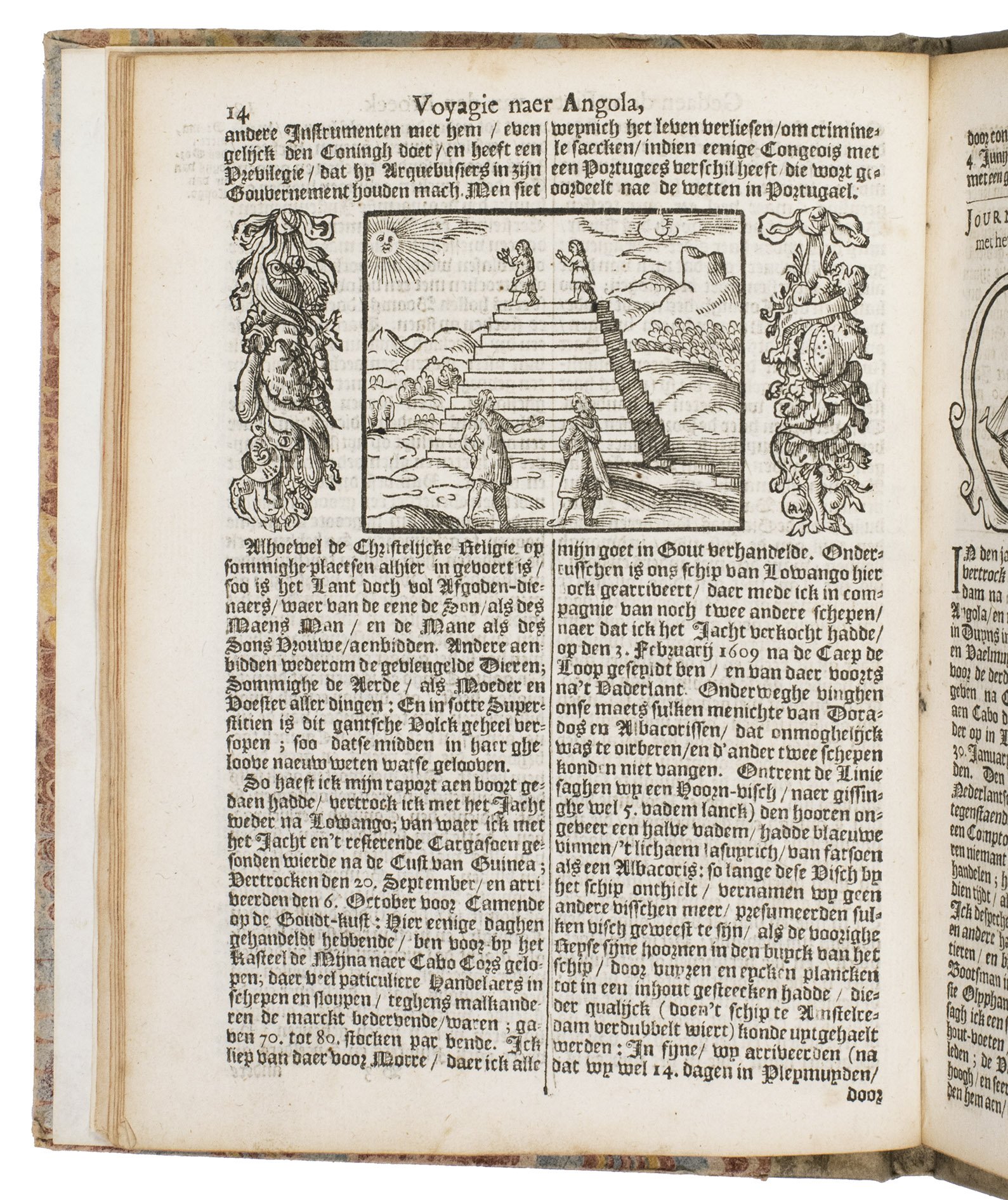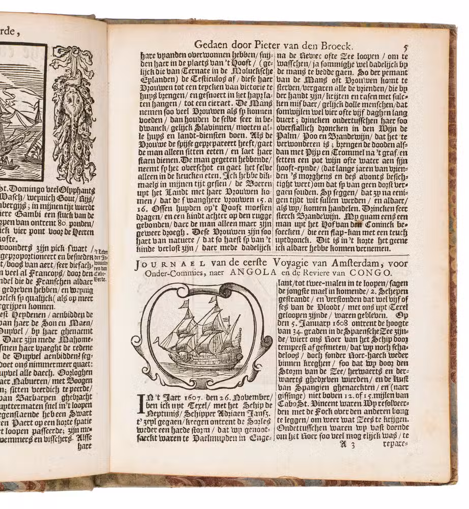 The work is based on the journals of Pieter van den Broecke (1585-1640), a cloth merchant working for the Dutch East India Company (VOC). He was promoted to chief tradesman and admiral due to his successes in West Africa and the Middle East. The present work is an account of his earliest voyages to West Africa, in 1605, 1607, 1609, and 1611, and his longer voyage to, and stay in, the East Indies, from 1613 to 1630. His travelled to Angola three times, also visiting Guinea, the Kingdom of Congo, and the former Kingdom of Loango (part of present day Congo). On his final trading journey to Angola, in 1611, he returned with 65.000 pounds of ivory.