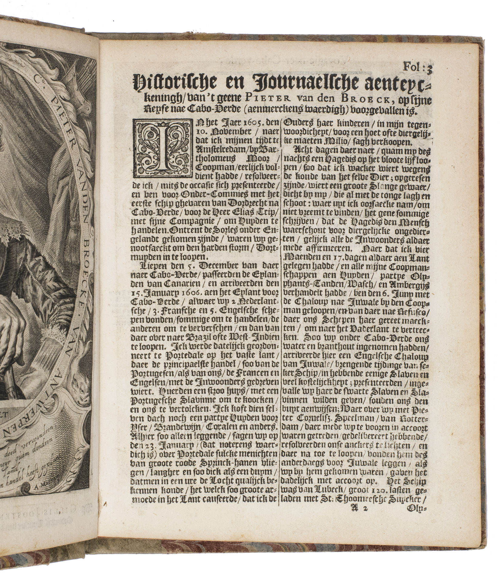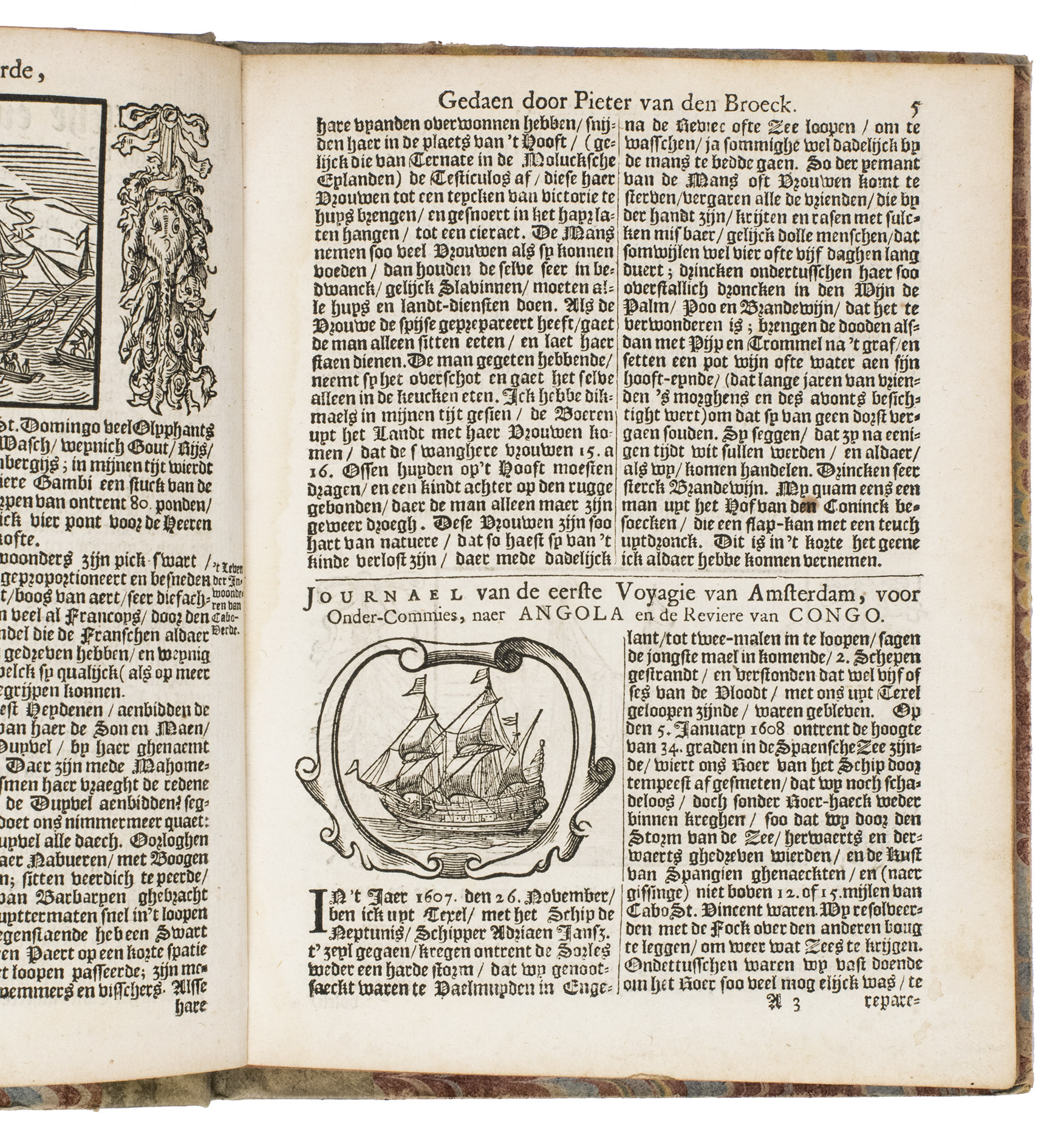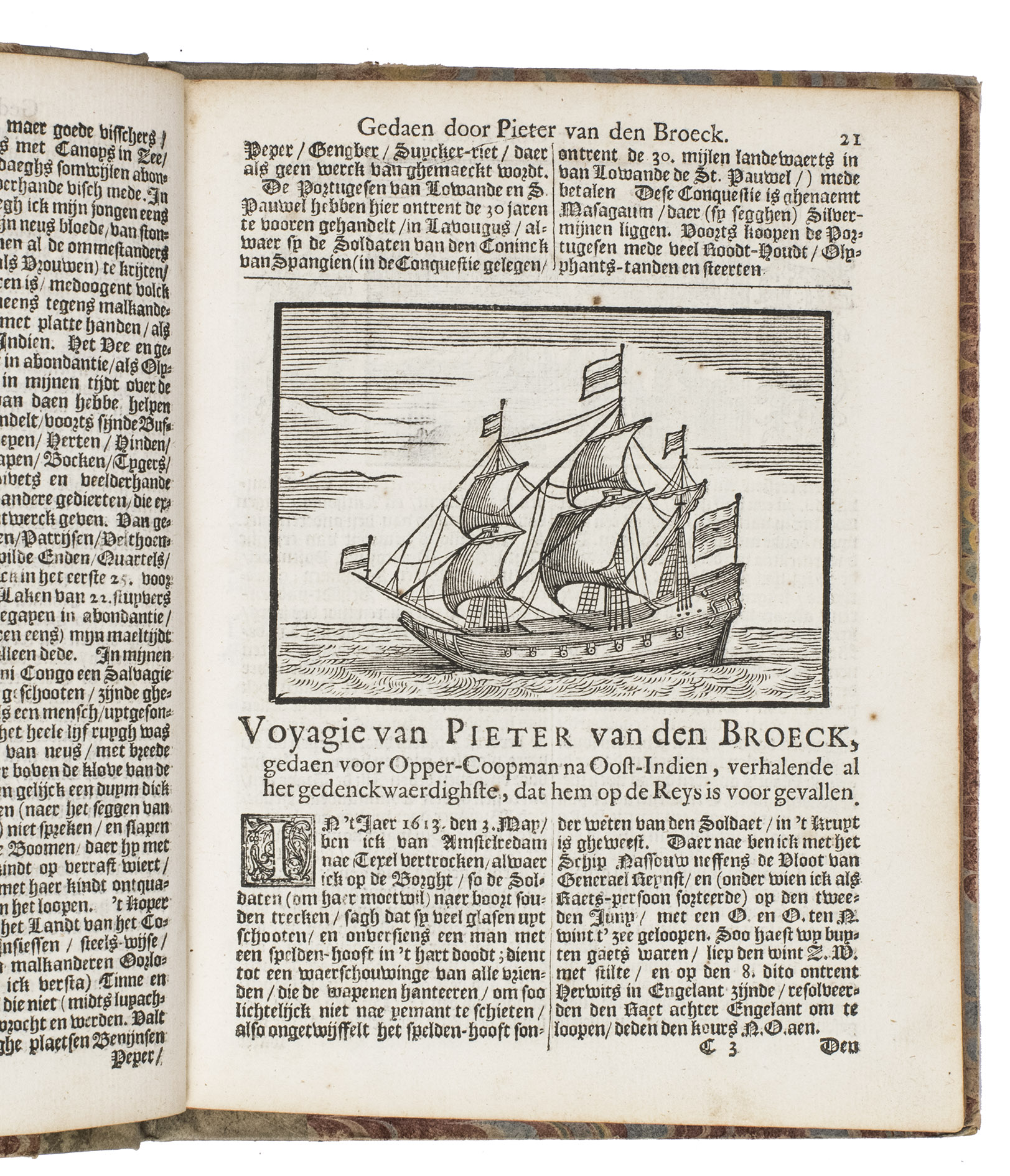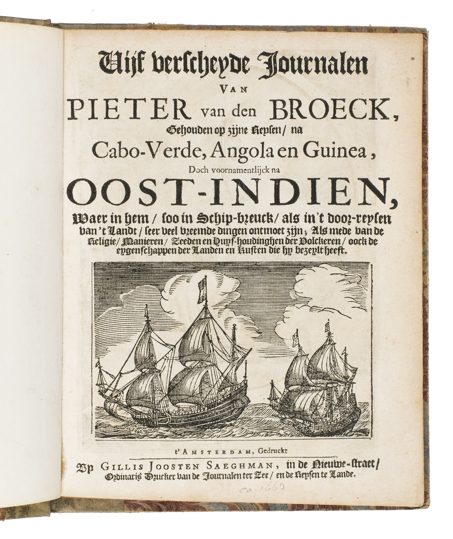 Van den Broecke's journals, which are still kept in the Nationaal Archief in the Hague, were widely read in the 17th century. His travel accounts were first published in 1634 as Korte historiael ende journaelsche aenteyckeninghe, by two different publishers, and as Wonderlijcke historische ende journaelsche aenteyckeningh in 1648 by Joost Hartgers. Hartgers also included it in his compilation of various travel accounts, Oost-Indische voyagien (1648). In the early 1660's, Gilles Joosten Saeghman (1619-1704) republished the classic travel accounts for a new generation. Like Hartgers, he published each of them separately and as part of a compilation, titled Verscheyde Oost-Indische voyagien (1663-1670). The present copy is the rare separate edition.