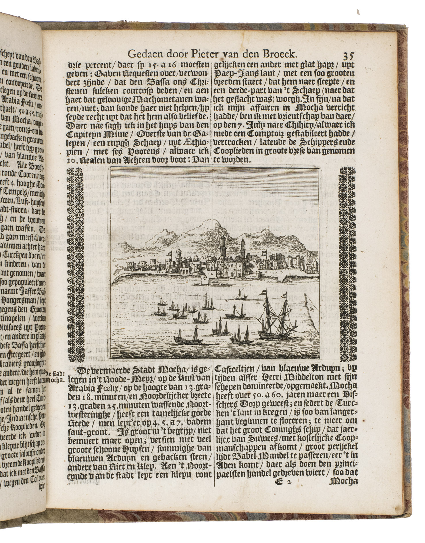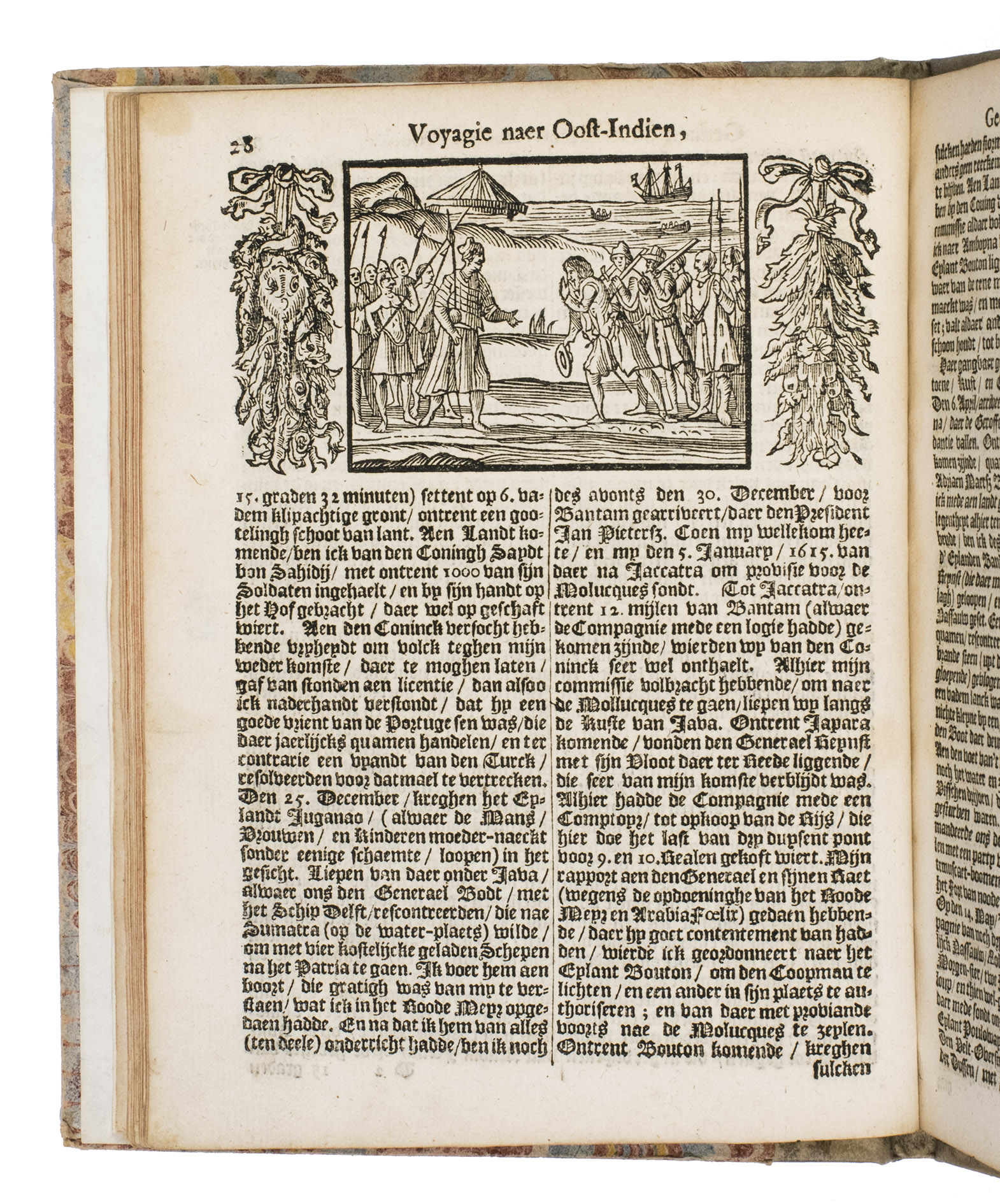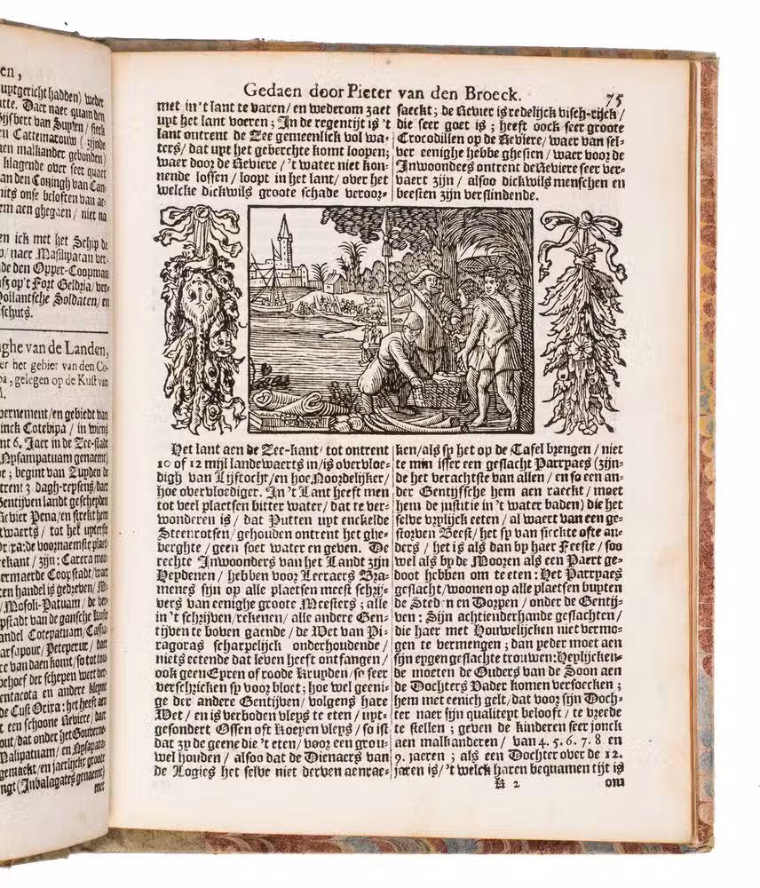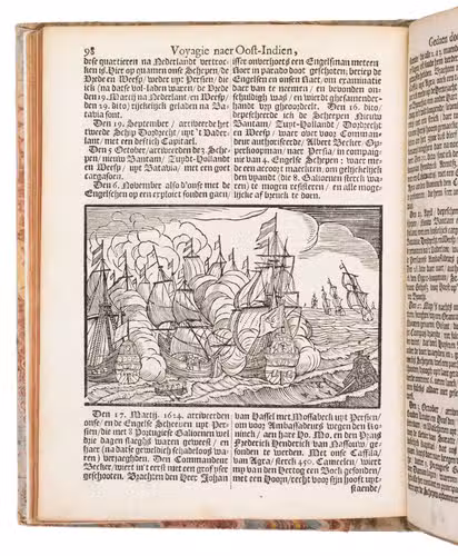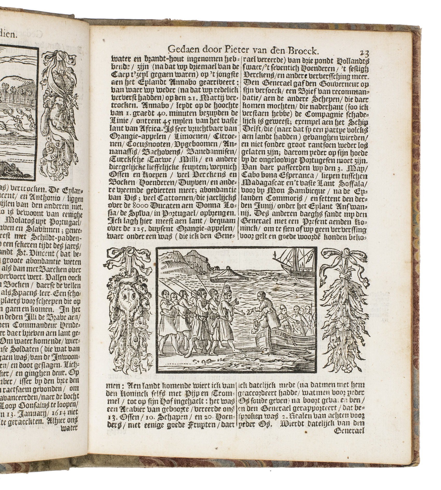 Van den Broecke's journals, which are still kept in the Nationaal Archief in the Hague, were widely read in the 17th century. His travel accounts were first published in 1634 as Korte historiael ende journaelsche aenteyckeninghe, by two different publishers, and as Wonderlijcke historische ende journaelsche aenteyckeningh in 1648 by Joost Hartgers. Hartgers also included it in his compilation of various travel accounts, Oost-Indische voyagien (1648). In the early 1660's, Gilles Joosten Saeghman (1619-1704) republished the classic travel accounts for a new generation. Like Hartgers, he published each of them separately and as part of a compilation, titled Verscheyde Oost-Indische voyagien (1663-1670). The present copy is the rare separate edition.