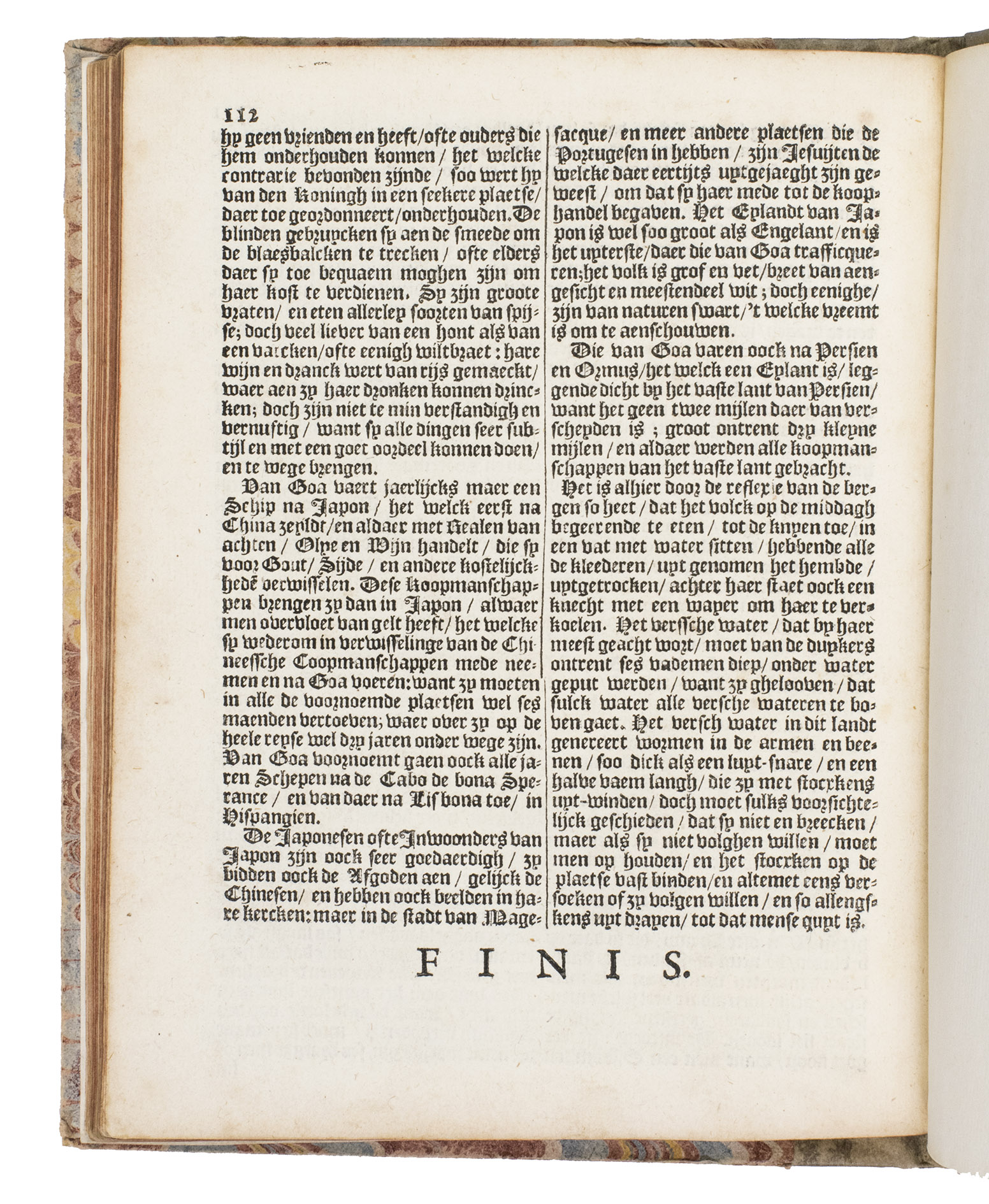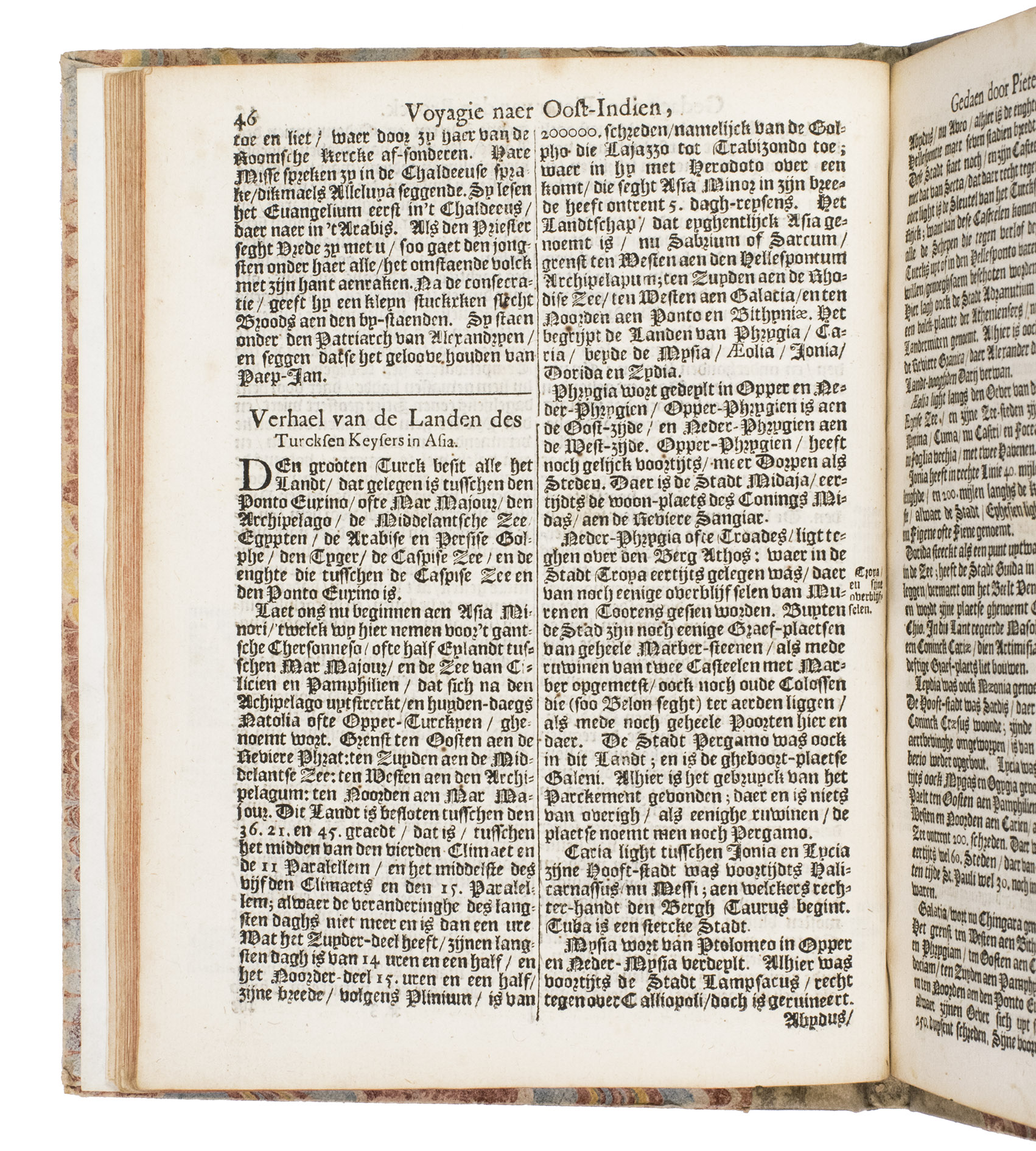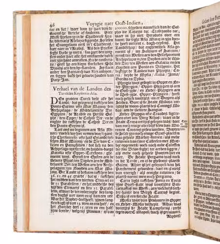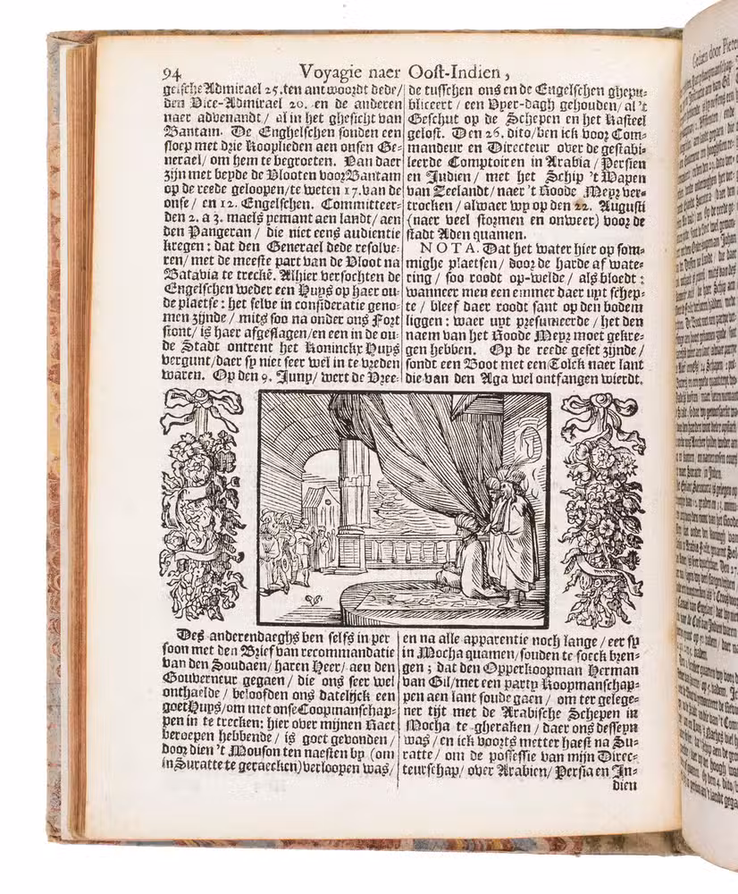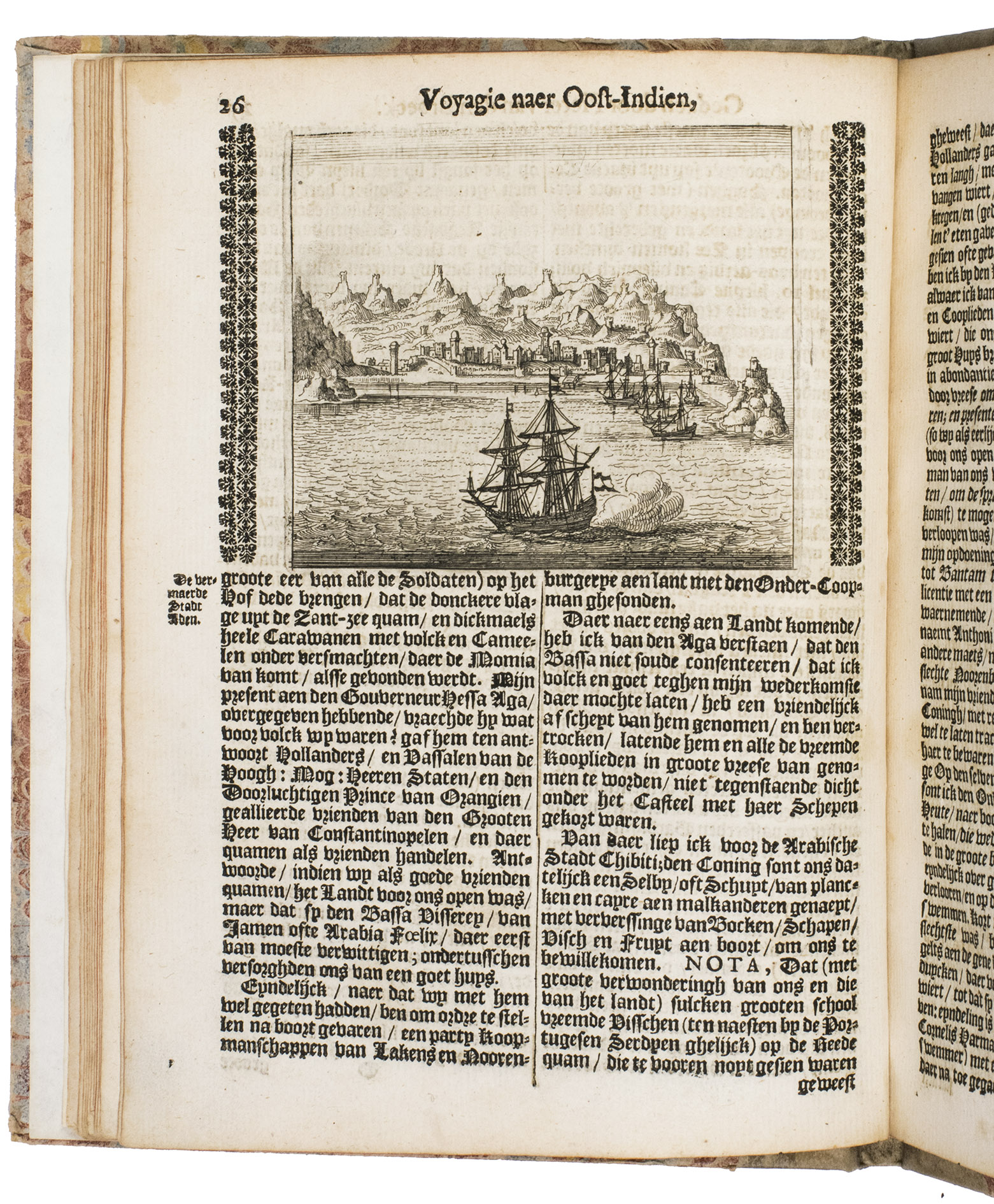 Van den Broecke's journals, which are still kept in the Nationaal Archief in the Hague, were widely read in the 17th century. His travel accounts were first published in 1634 as Korte historiael ende journaelsche aenteyckeninghe, by two different publishers, and as Wonderlijcke historische ende journaelsche aenteyckeningh in 1648 by Joost Hartgers. Hartgers also included it in his compilation of various travel accounts, Oost-Indische voyagien (1648). In the early 1660's, Gilles Joosten Saeghman (1619-1704) republished the classic travel accounts for a new generation. Like Hartgers, he published each of them separately and as part of a compilation, titled Verscheyde Oost-Indische voyagien (1663-1670). The present copy is the rare separate edition.