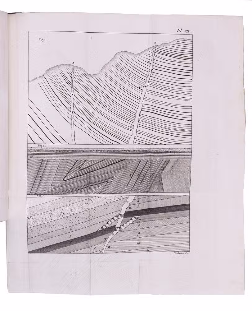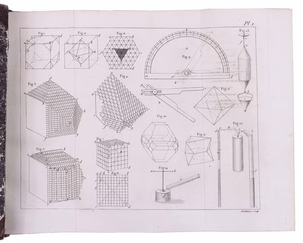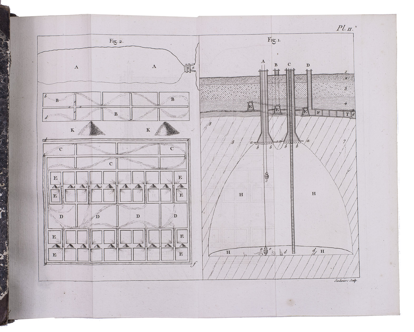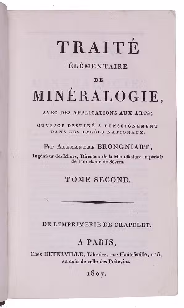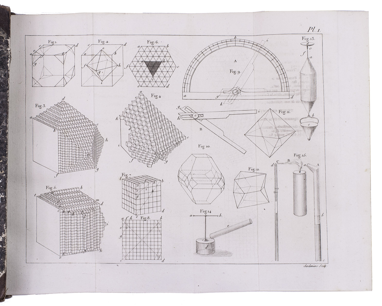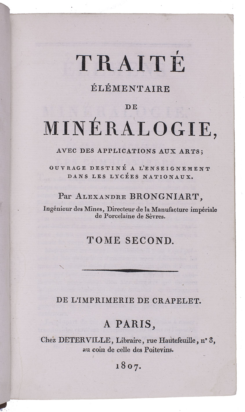 First edition of a work on mineralogy by the French geologist and mineralogist Alexandre Brongniart (1770-1847), intended as a textbook for the mineralogical courses given by Brongniart and René Just Haüy at the Faculté des Sciences and the Muséum d'Histoire Naturelle. "For this purpose, the author created a simple classification system based primarily on physical properties, but also influenced by Haüy's crystallographic theories. Brongniart insisted that studying how minerals occurred as well as their properties would lead to a better understanding of their origin" (Schuh). The engraved plates depict crystals and mining instruments and mechanisms.