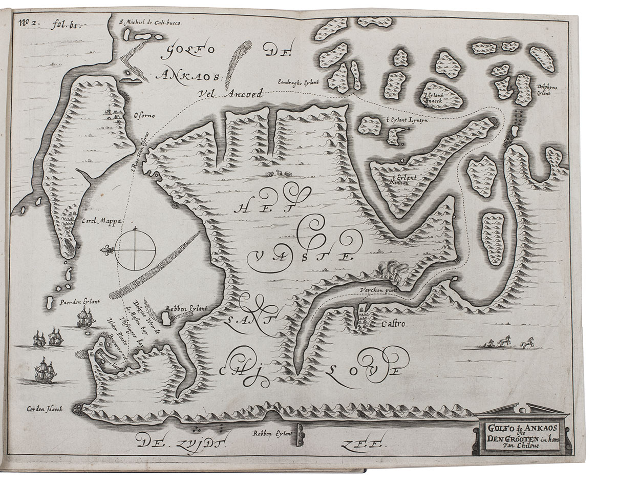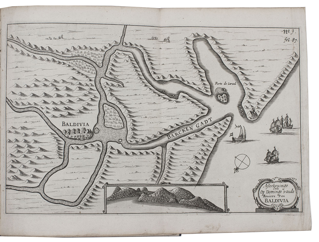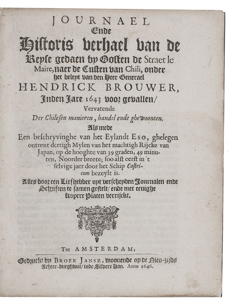 First edition of the account of the charting voyage by Maerten Gerritsz. Vries (1589-1646) to the north of Japan, together with the popular account of a Dutch West India Company voyage to Chile under Hendrik Brouwer (1581-1643). Brouwer, one of the directors of the Dutch West India Company, acted as the commander of a fleet of six ships, specially sent to the western coast of South America to activate the trade between the Dutch and the natives. During this voyage, which resulted in the first place in a better knowledge of that coast, Brouwer died at Chiloe and was buried at Valdivia in August 1643. Appended to that journal is the very important account of a charting voyage to Japan. That same year (1643) Maerten Gerritsz. Vries, got "instructions from Governor Van Diemen ... to examine the countries to the north of Japan and to assess their economic and trading potential, particularly with regard to mineral wealth" (Howgego). He visited Hokkaido (Yezo) and Sakhalin, discovered the islands Iturup and Urup and gave his name to the strait between those islands. La Pérouse considered him one of the most eminent seafarers of his time.