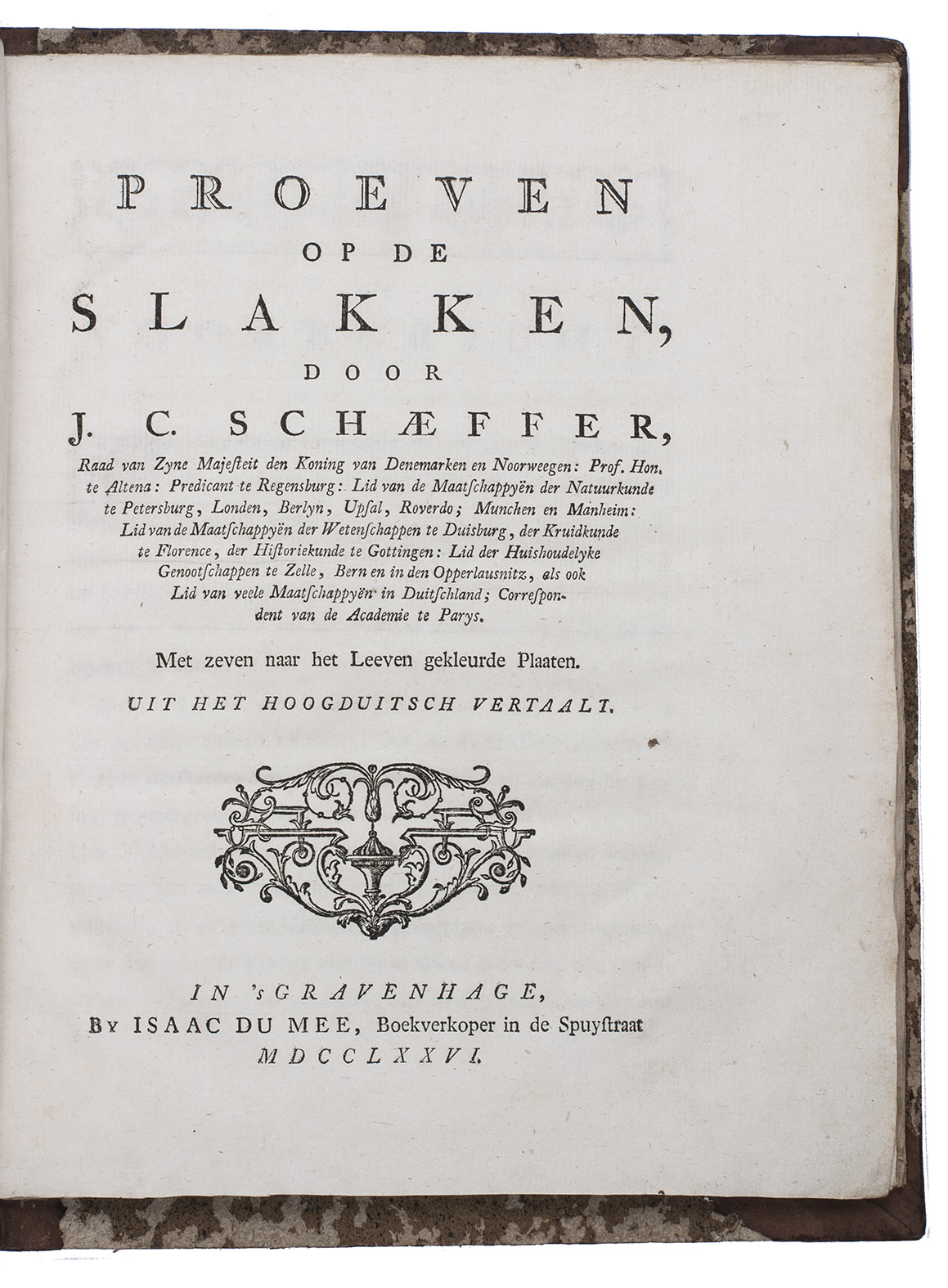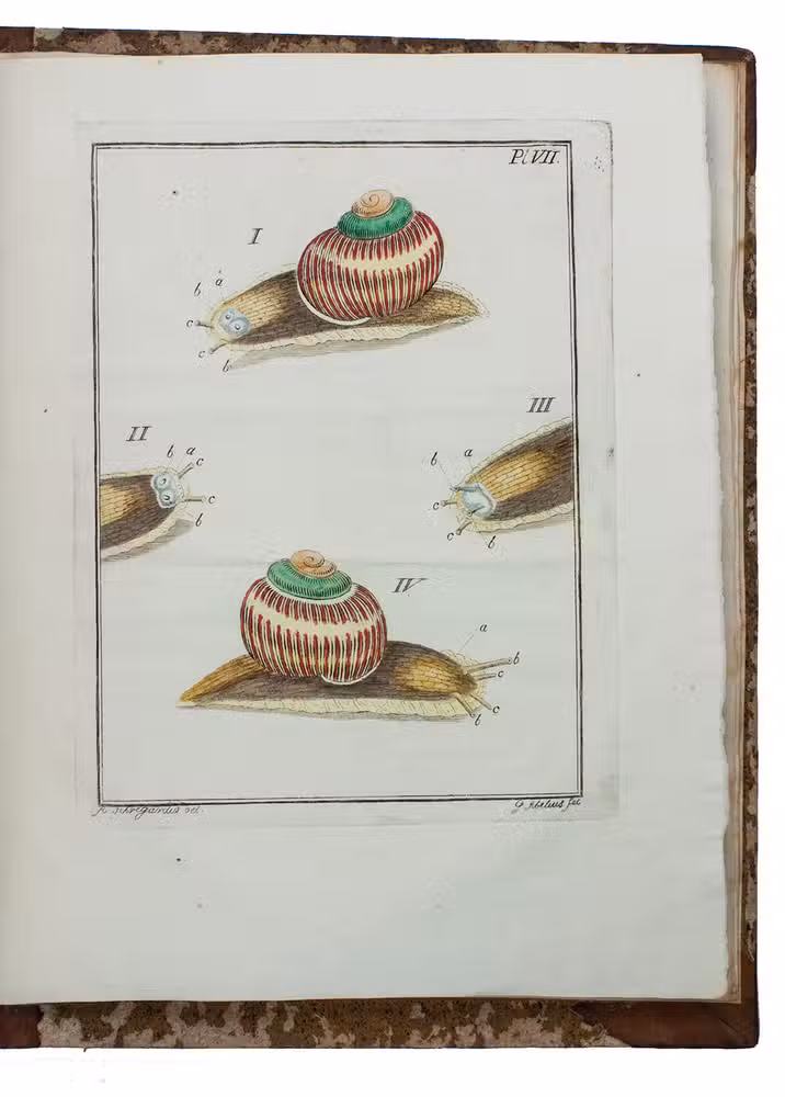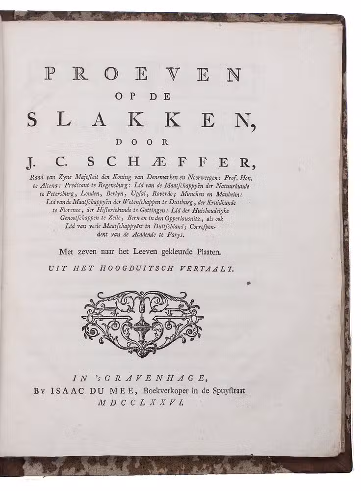 With: (2) SCHÄFFER, Jacob Christian. Proeven op de slakken. ... Met zeven naar het leeven gekleurde plaaten. Uit het Hoogduitsch vertaalt.