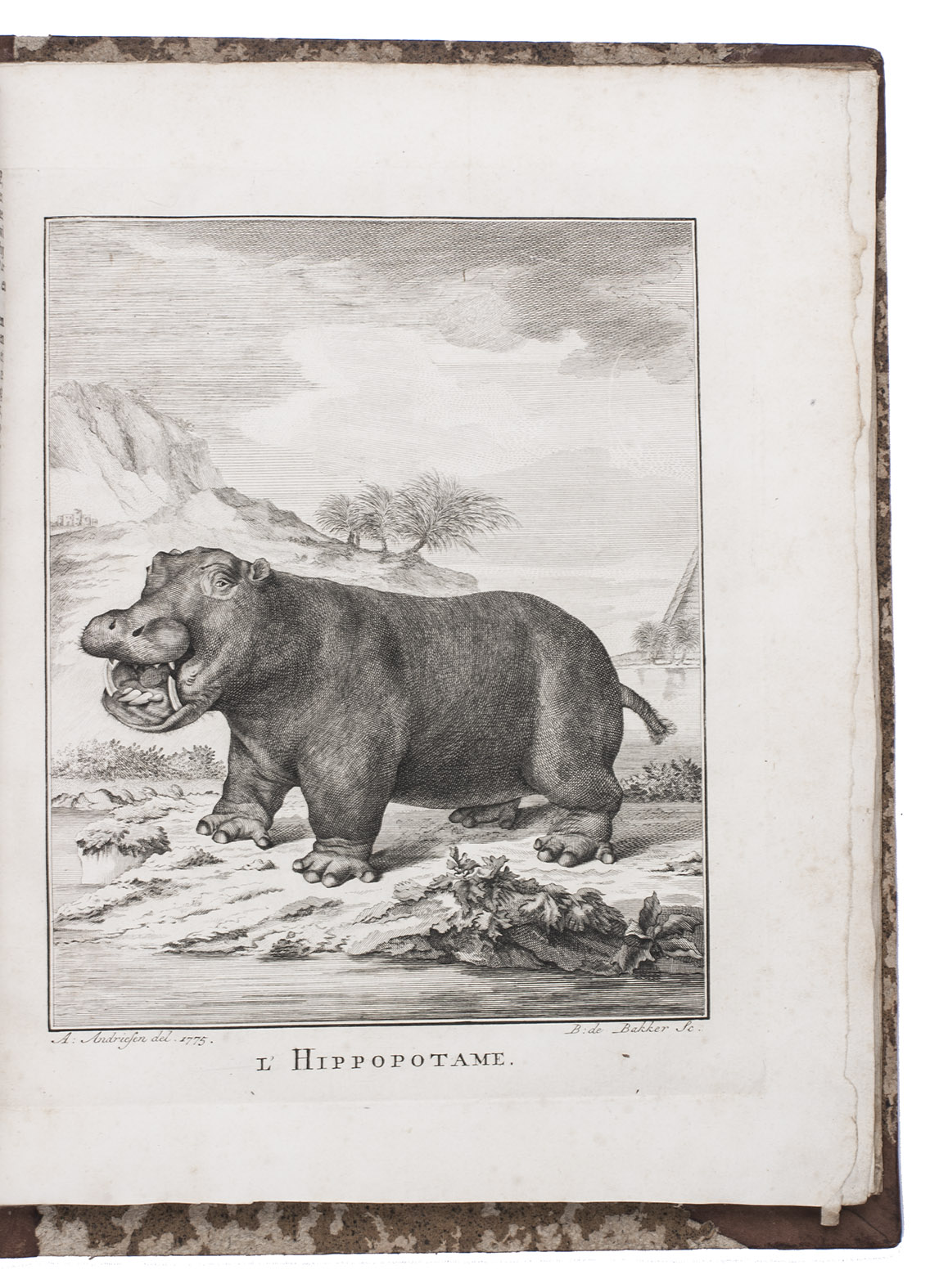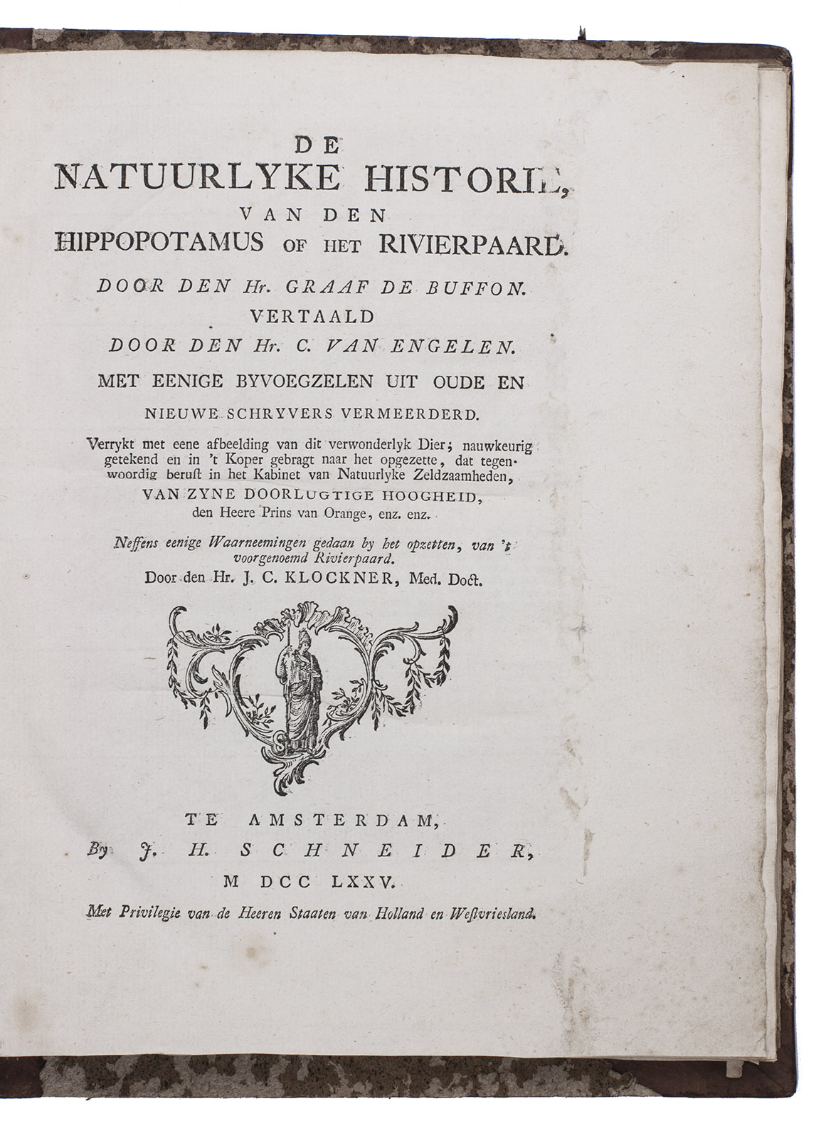 Amsterdam, J.H. Schneider, 1775. With an engraved plate of a hippopotamus by Barent de Bakker after Andreas Andriesen.