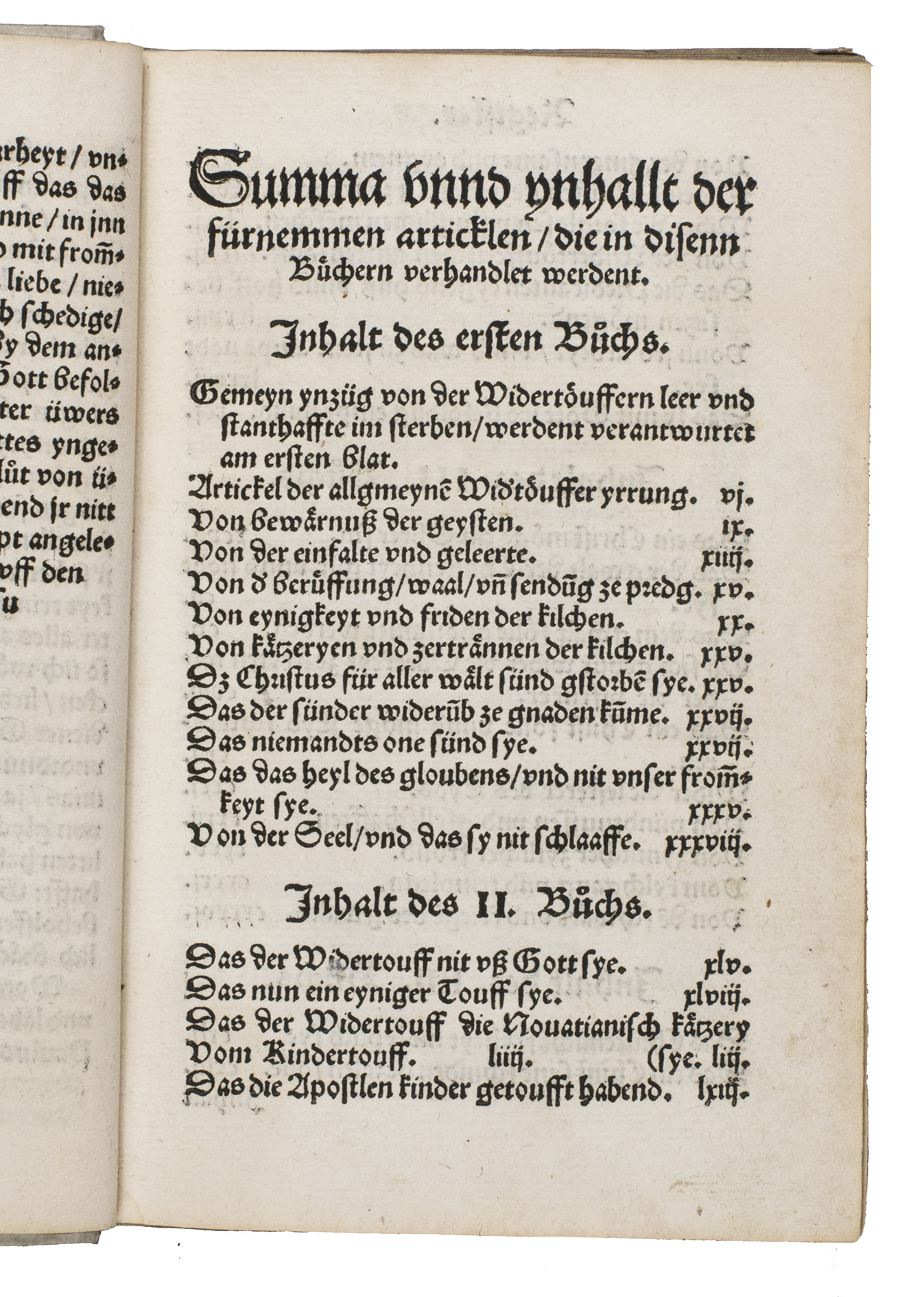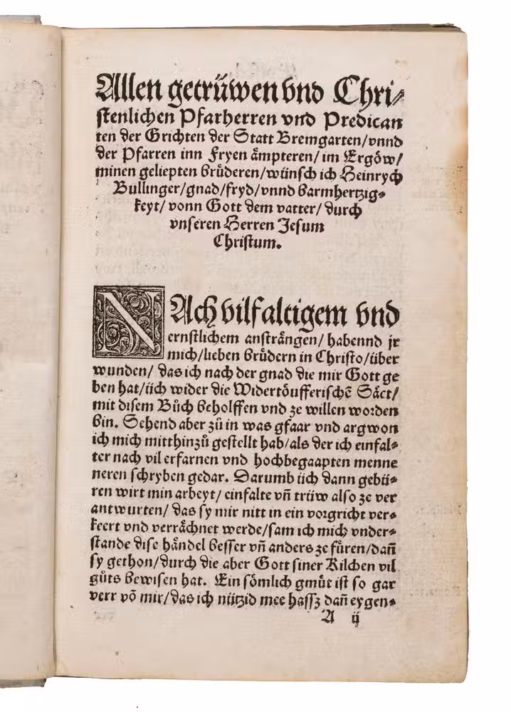 First edition of one of the most important and influential anti-Anabaptist works of the Swiss Reformation. Written and completed at Bremgarten in late 1530 and published in Zurich in 1531, this work marks Heinrich Bullingers (1504-1575) first major intervention in what would become a lifelong campaign against the Anabaptist movement. Cast deliberately in the popular dialogue form, the text stages a disputation between Simon, representing the Anabaptist position, and Jojada, the orthodox Reformed interlocutor, allowing Bullinger to present and systematically refute what he regarded as the movements most dangerous errors.