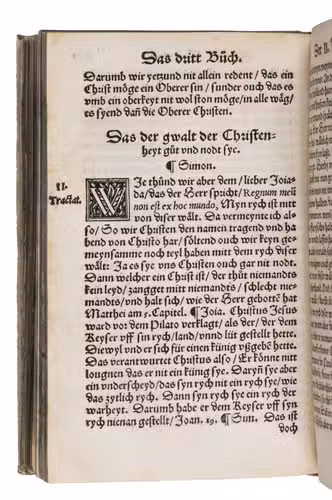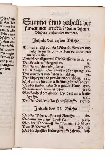 With a bookplate on the front pastedown from the Bucknell Library of the Crozer Theological Seminary, a Baptist seminary located in Upland, Pennsylvania. Some occasional staining and browning throughout. Otherwise in very good condition. Shirky, "Determining the Impact of the Anabaptists", West Virginia University Historical Review, vol. 1, 1, (2020), pp. 36-52; USTC 703147 (9 copies); VD 16 B 9758.