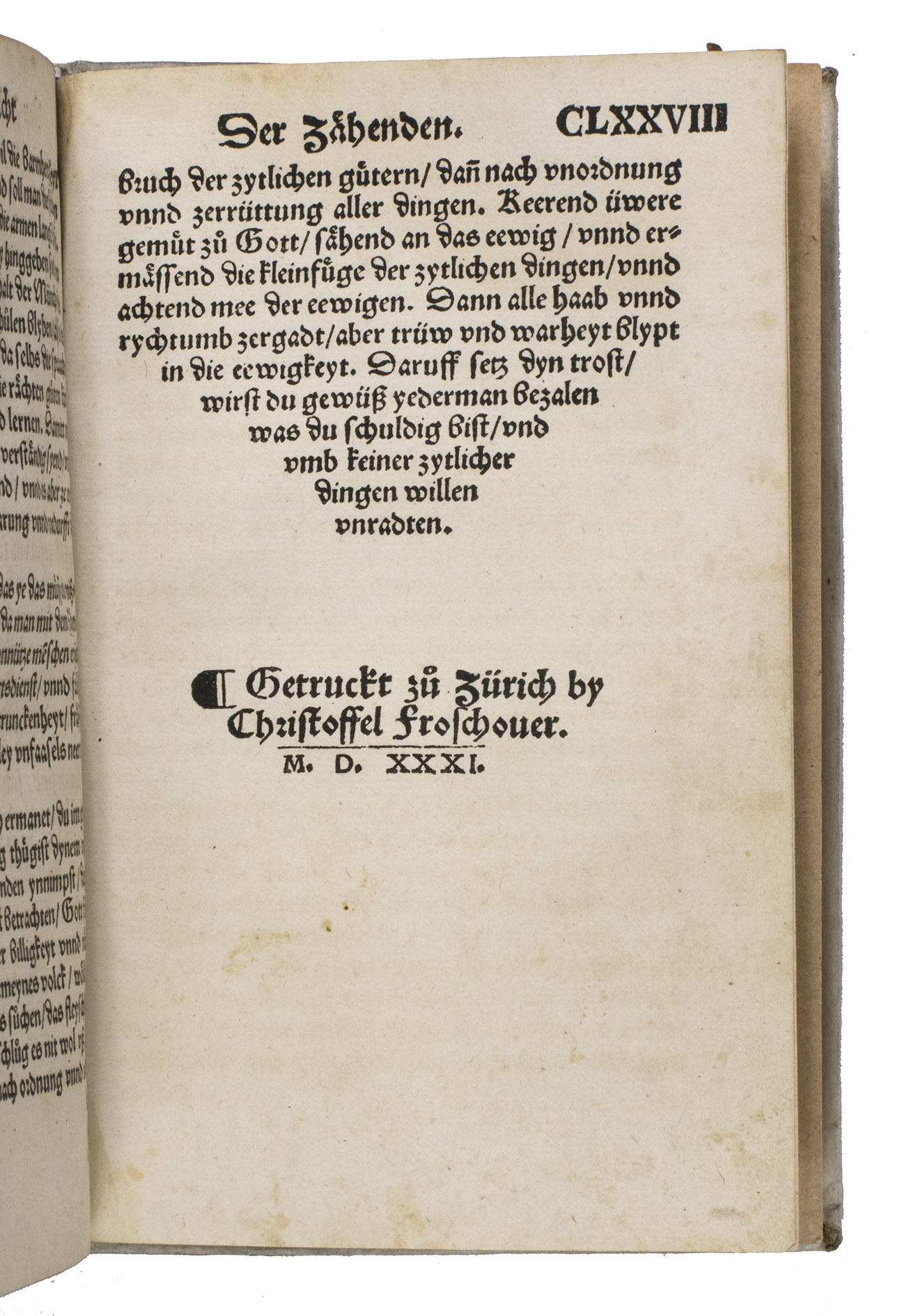 (Colophon:) Zürich, Christoph Froschauer, 1531. 3 parts in 1 volume. 8vo (14.6 x 9.5 cm). With woodcut decorated initials throughout. 19th-century vellum. [8], CLXXVIII ll.
