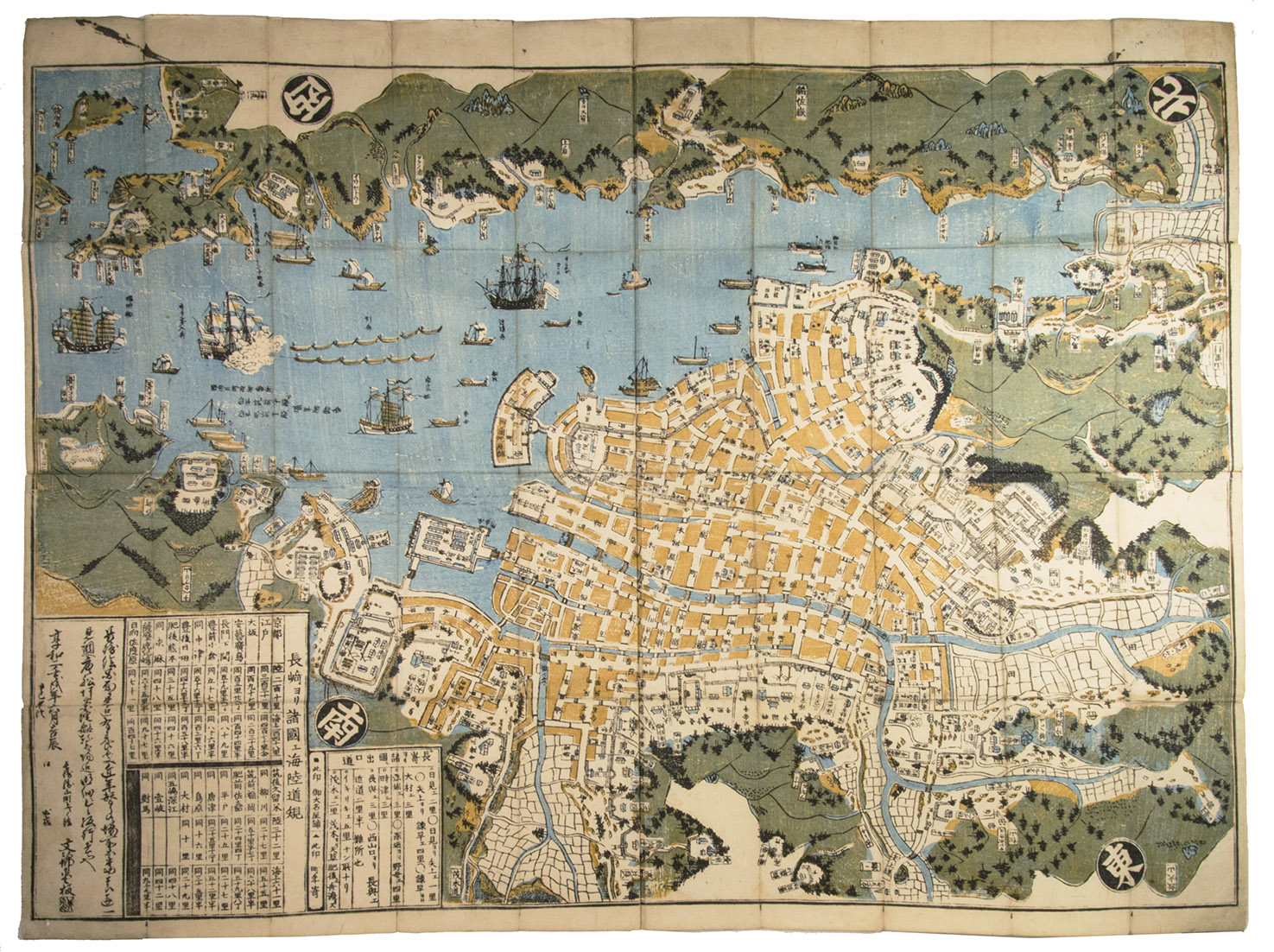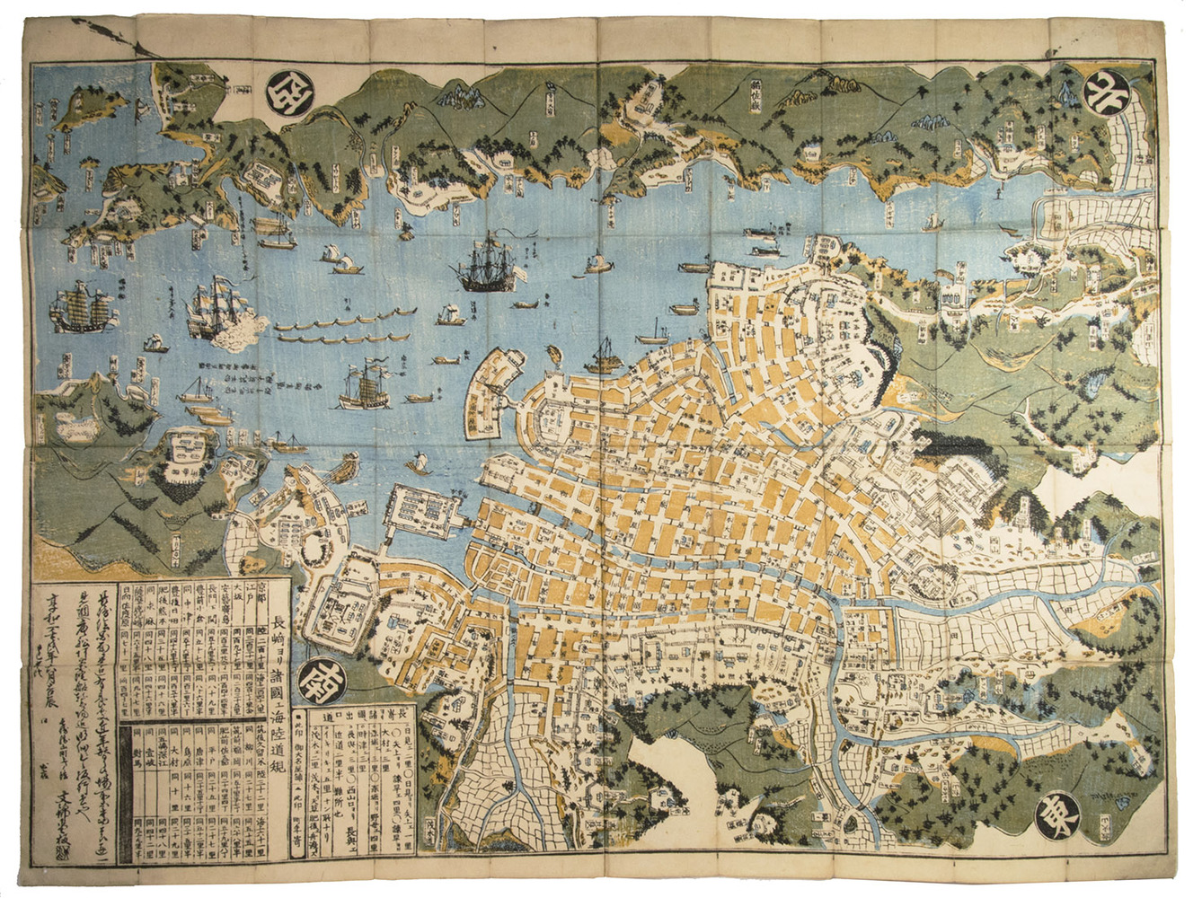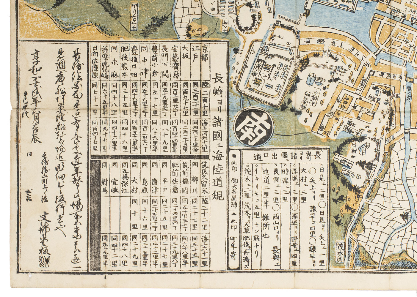 Fine and rare large woodcut map, printed in three colours, of the harbour of Nagasaki, with mountainous landscape in the background and Chinese junks and two Dutch vessels standing out in the harbour, one of the Dutch ships being towed by Japanese oared craft to the Dutch trading post on the artificial island Deshima, left of the centre of the map. The names of the streets, temples and government offices at Nagasaki are all indicated. The two inserts with Japanese characters give the distances between Nagasaki and neighbouring domains as well as distances (by land and by sea) between Nagasaki and important cities throughout Japan.