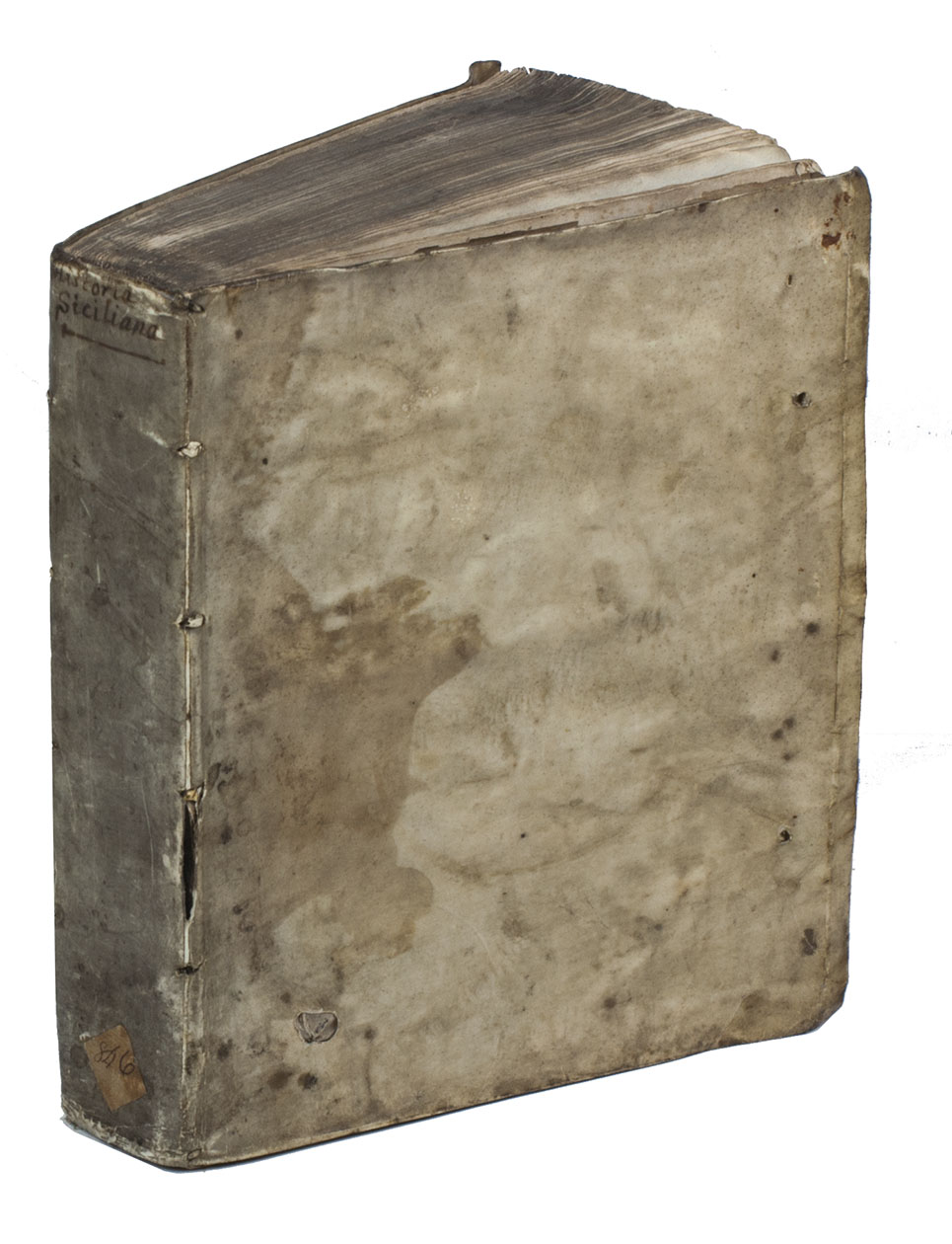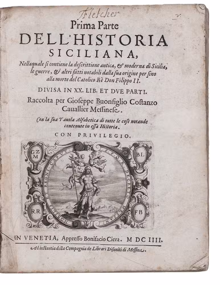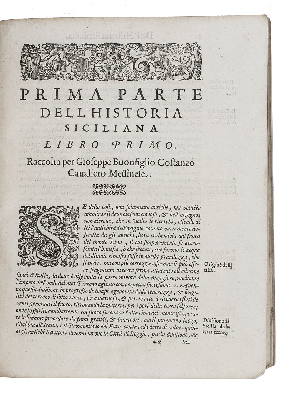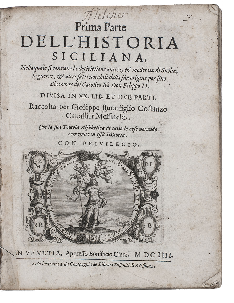 First edition of Buonfiglio's history of Sicily, with the text divided into two parts, each with ten numbered "libri", giving an elaborate description of his native island, its origins, the scenery, geological conditions and illustrious inhabitants. He comments on early descriptions of Sicily, the place of Sicily in mythology and in classical antiquity, its general, political and military history from the Middle Ages to the 16th century. It includes an oration on the death of King Philip II and a description of the miraculous events in Messina during the famine. A third part (not included) was published in 1613, and a second edition in two volumes appeared in 1738-1739. A drop-title on 2B3r (p. [389]) signals the beginning of the second part of the text, so the two "parts" could not be issued separately.