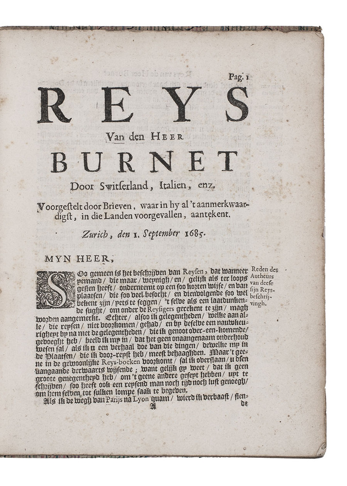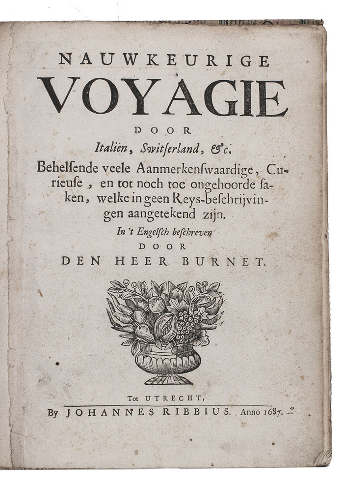 First edition of the Dutch translation of a work on travels through Europe, undertaken and written by Gilbert Burnet (1643-1715). Burnet was a Scottish historian, philosopher, and later Bishop of Salisbury. In 1685 Burnet left Great-Brittain to travel Europe, where he visited the Netherlands, France, Germany, Italy and Switzerland. During his stay in the Netherlands, Burnet got exiled from England by King James II, after writing a pamphlet advising the Dutch prince William and his wife Mary not to support James for the repeal of the Test Act. The text is written in the form of letters, starting in Zurich, to Milan, Florence, Rome, and ending in Nijmegen, where he noted everything that "seemed most remarkable" and was unheard of in any other travelogue.