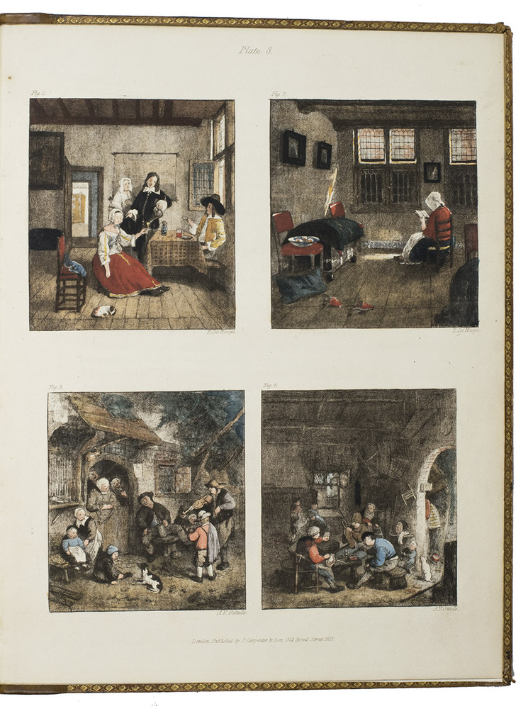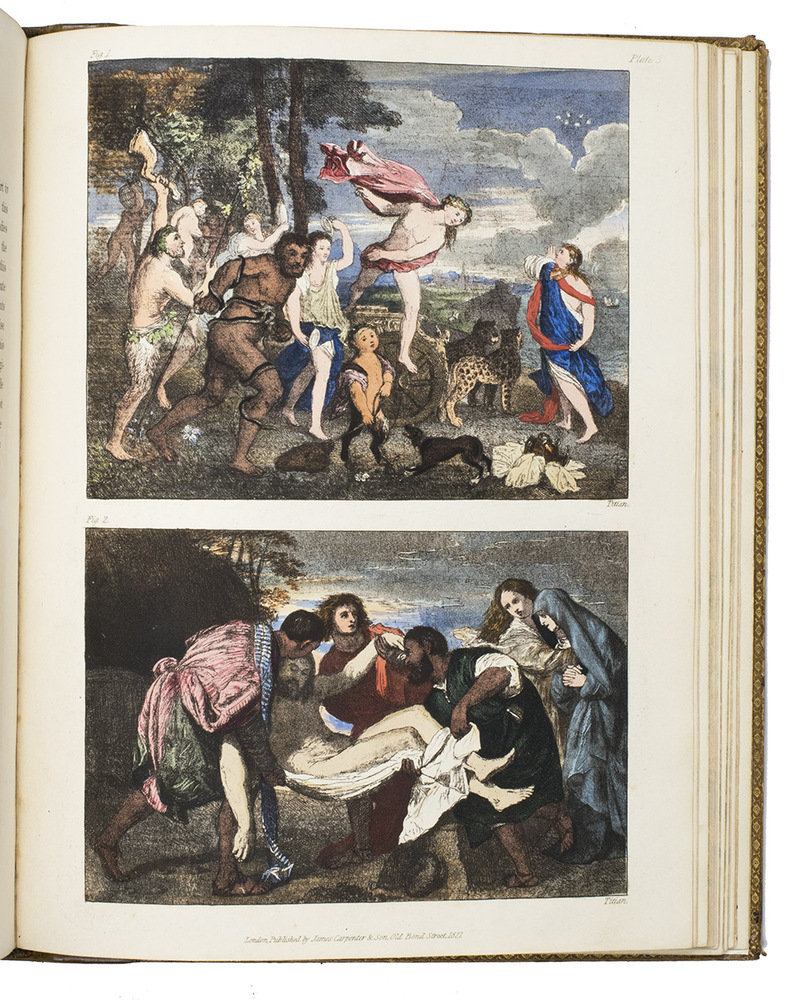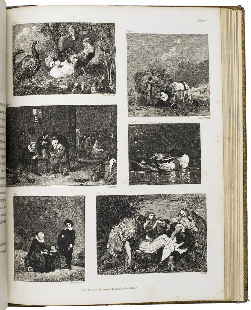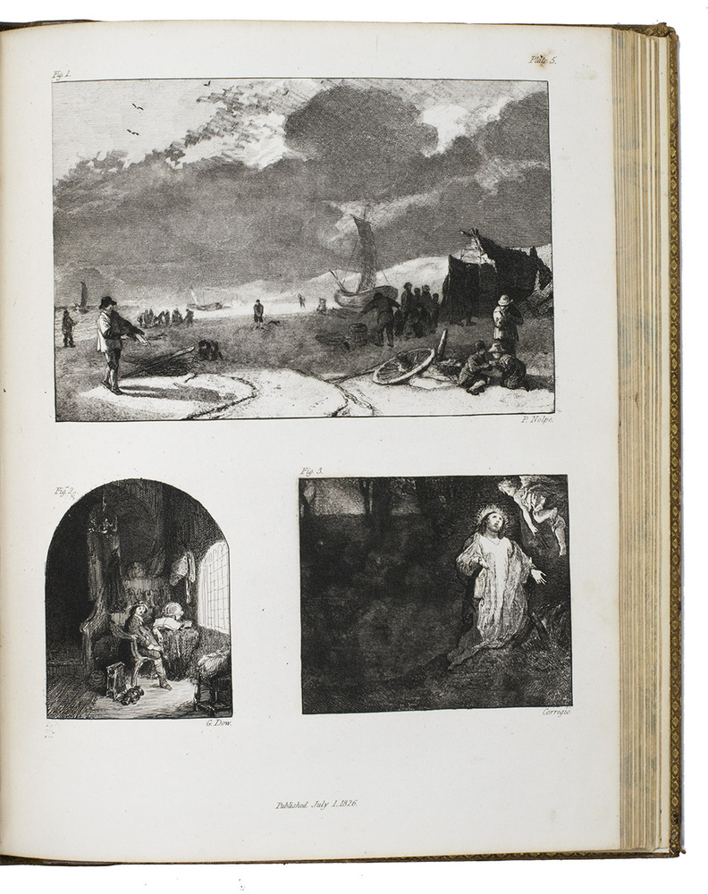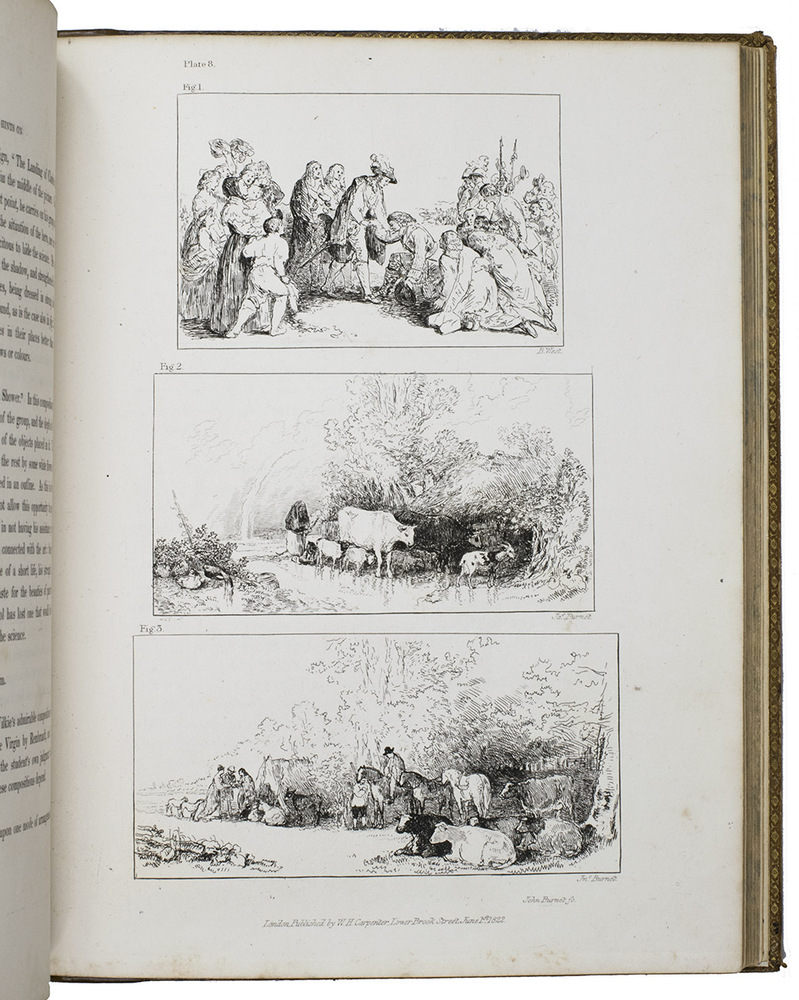 London, James Carpenter, 1826-1827. 3 parts in 1 volume. 4to. With 25 full-page partly handcoloured etched and aquatint plates with 105 reproductions by Burnet of famous paintings. Contemporary calf, covers blind-tooled in a checkered pattern, marbled edges. [4], 31, [1 blank]; VI, 45; V-IX, [3], 64 pp.
