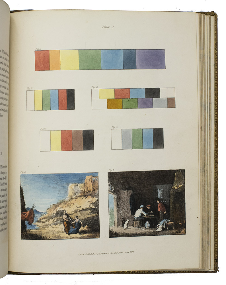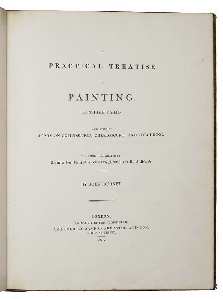 First edition of the collected works on the art of painting by the Scottish artist John Burnet (1784-1868), illustrated by himself. It is divided into three parts: on composition, chiaroscuro (light and shadow), and colour.Minor foxing. New spine and endpapers, boards somewhat soiled. In very good condition. Abbey, Life, 100; Dict. of Nat. Biography III, 407. Graesse I, 578.