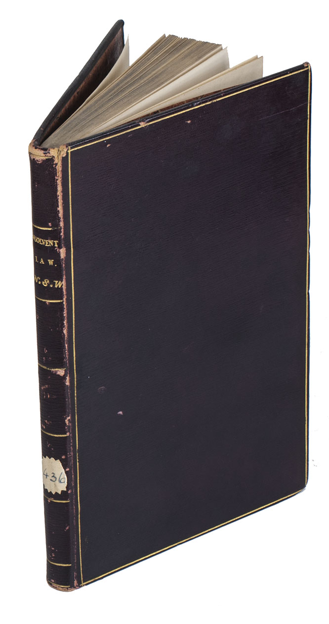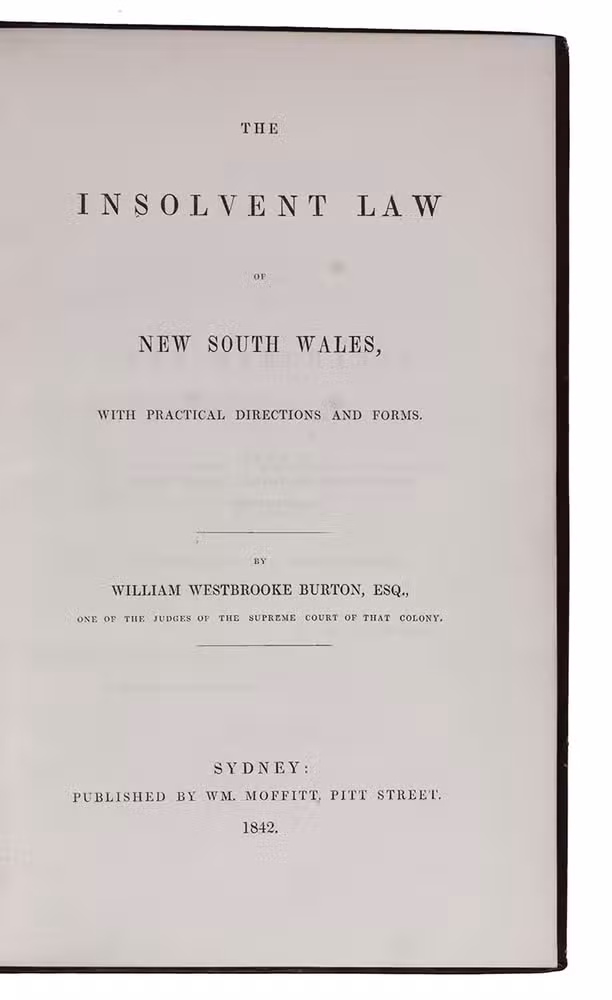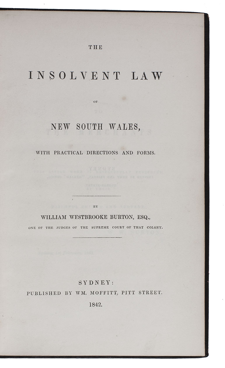 Rare first and only edition of the first Australian treatise on bankruptcy. While in Australia, Burton attempted to ameliorate the harsh treatment of convicts at Norfold Island, where he was sent in 1834 "to try some convicts who had mutinied". Many were sentenced to death, but as no clergy were on the island, Burton reprieved them until their cases could go before the executive council. He endeavoured also with some success to improve the miserable condition of the convicts.