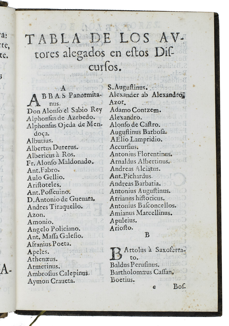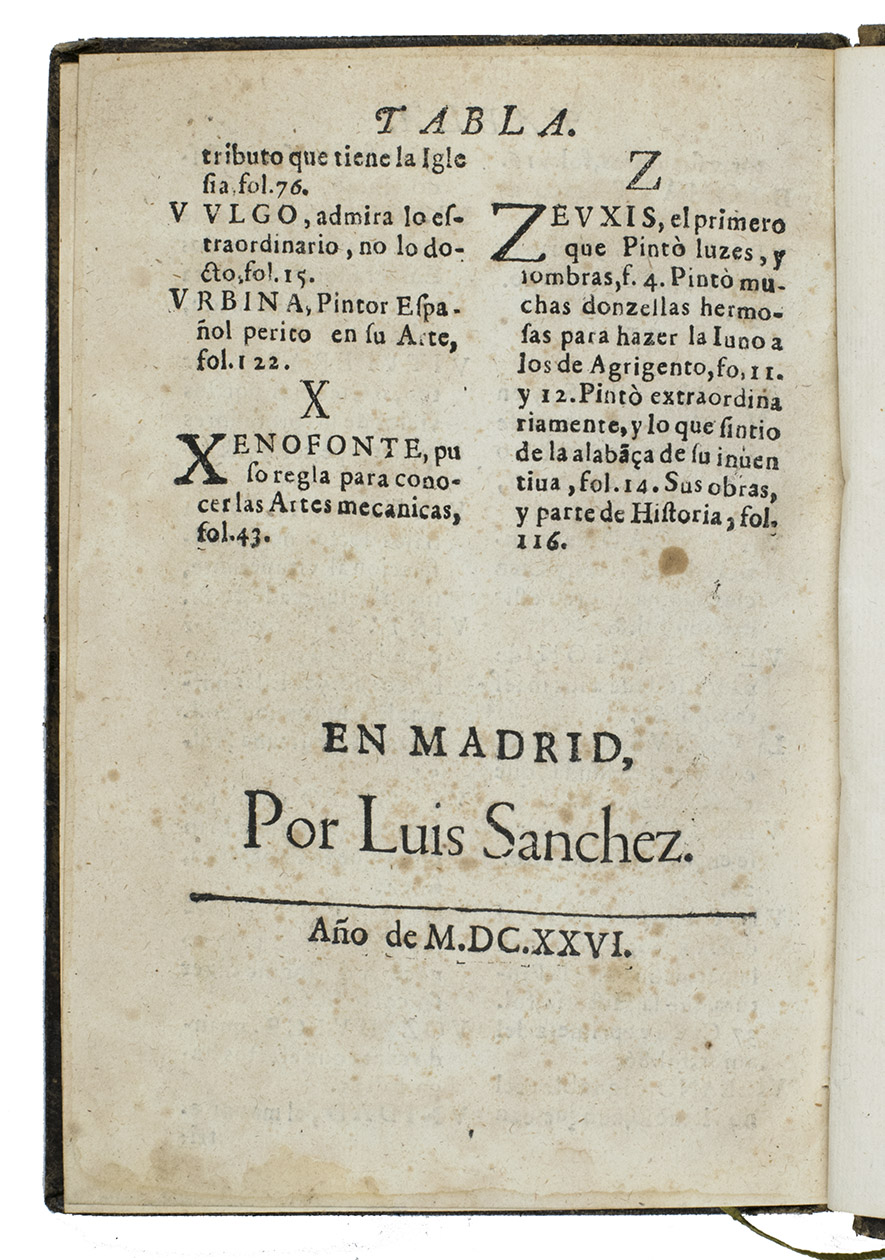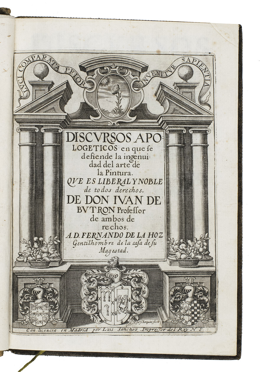 First edition, in the original Spanish, of an important treatise on the value and quality of the art of painting, containing many interesting observations and remarks on the fine arts and its relation to other liberal arts, such as dialectics, rhetoric and arithmetic, presented in 14 discourses. Juan Alonso de Butron, a jurist born in Najera dedicated his work to his mentor Don Fernando de la Hoz, "Gentilhombre de la Casa de su Magestad", dated 1 October 1626. After the dedication, prologue, a laudatory poem by Joseph de Valdivielso, a list of the authors mentioned, a summary of the discourses and other preliminaries, the main text occupies 123 pages followed by an index of 36 pp. The beautiful frontispiece was engraved by Jan Schorkens (1595-1630?), a Dutch engraver who travelled to Madrid around 1618 to work mainly for the printers and publishers there and remained apparently to his death.