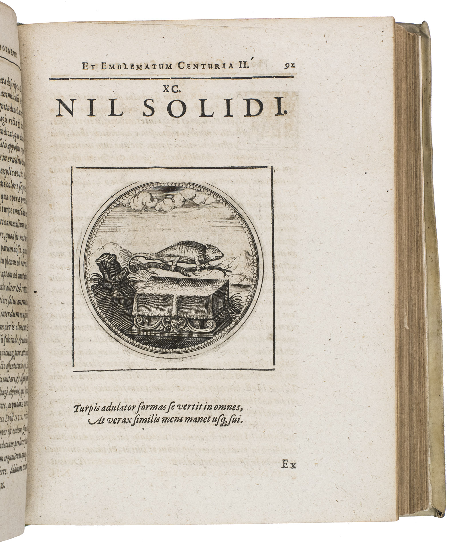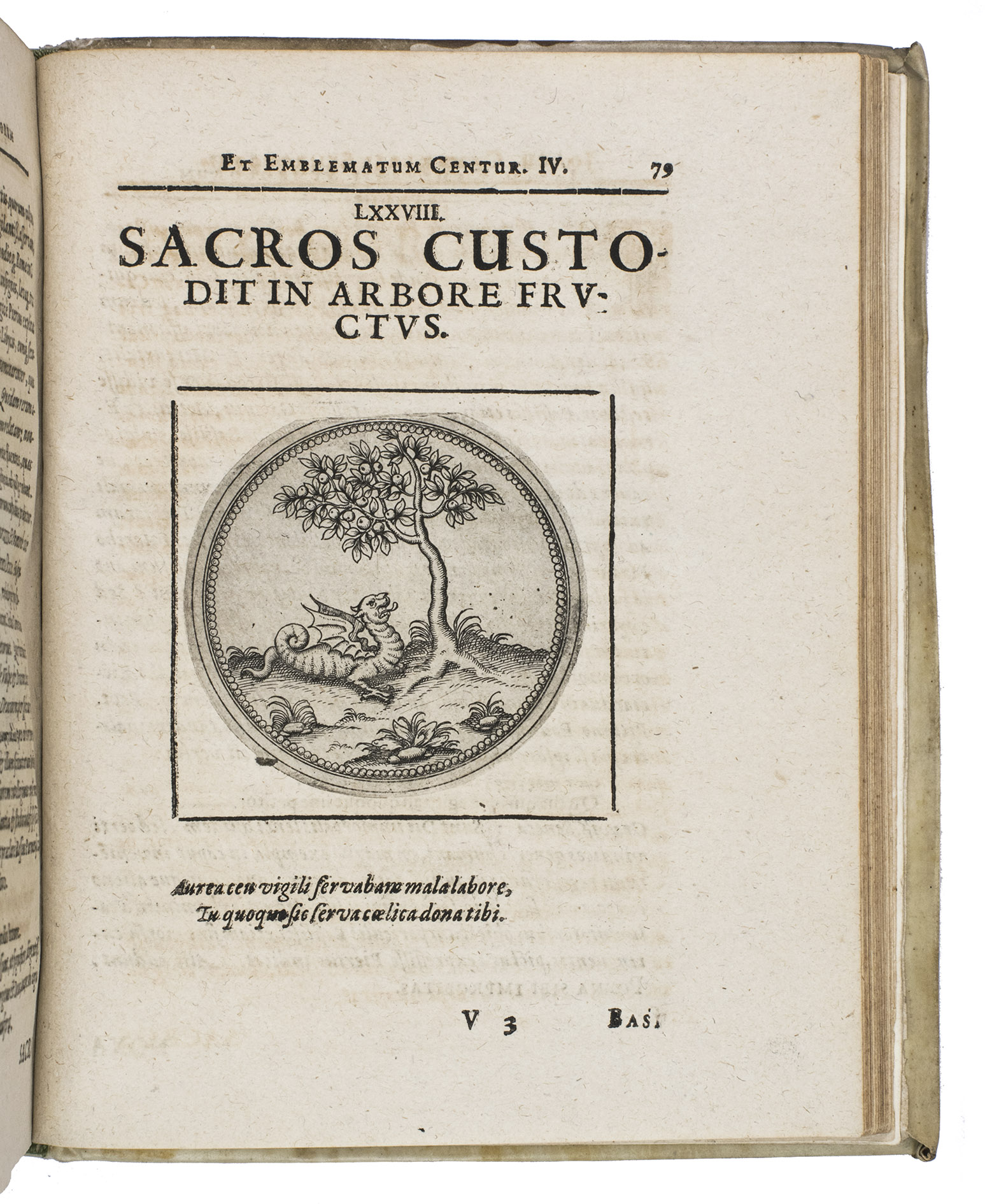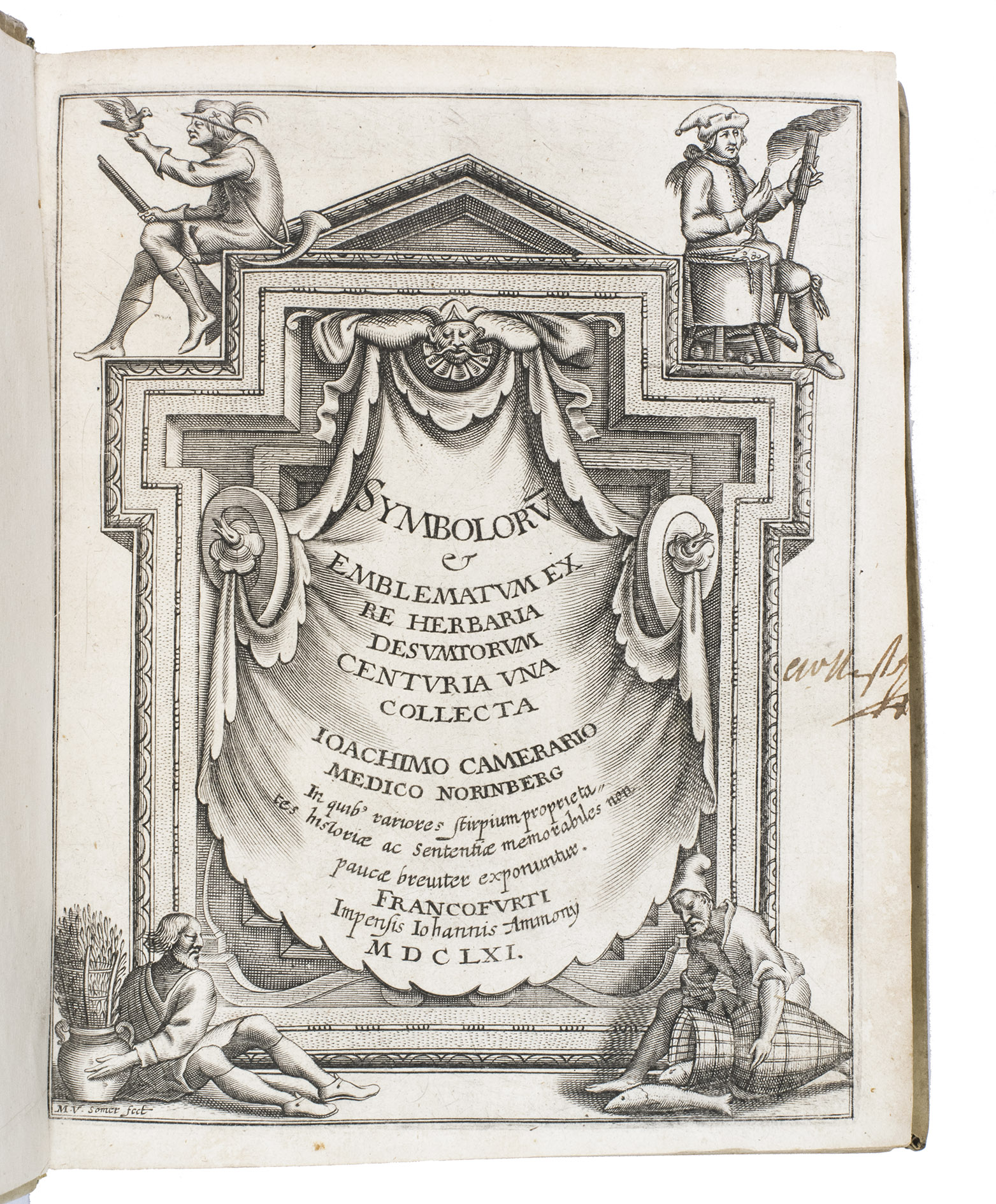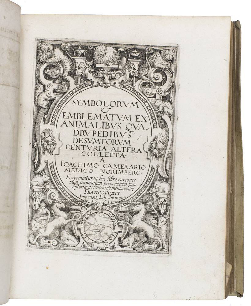 With a large armorial bookplate mounted on the front pastedown, and an illegible manuscript inscription on the engraved title page of ad 1. The binding is slightly (dust) soiled and shows a few (ink) stains, 6 leaves with marginal repair to paper, some minor browning to the top edge, slightly affecting the head margin throughout but never affecting text or emblem, some occasional light foxing and browning. Otherwise in good condition. Adams C448; Faber du Faur, 668; Folger IV, p. 350; Henkel & Schöne, Emblemata, pp. xxxviii-xxxix; Hunt, 181; Krivatsy, 2066; Landwehr, German emblem books, 167 (ad 3) and 169 (ads 1 & 2); Manning, The Emblem, p. 120; Nissen BBI 312; Nissen ZBI 792 & 793; Praz, pp. 295-296; USTC 2567143 (ad 1, 6 copies), 2567135 (ad 2, 4 copies), 2635767 (ad 3, 3 copies); 2808385 (ad 4, 2 copies); VD17 23:278138E (general), VD17 23:278133S (ad 1, 7 copies), VD17 1:078865L (ad 2, 5 copies), VD17 23:27837X (ad 3, 4 copies); Wenning, Joachim II. Camerarius. Eine Studie über sein Leben; cf. ad 4 not in VD17 or in Landwehr, German emblem books.