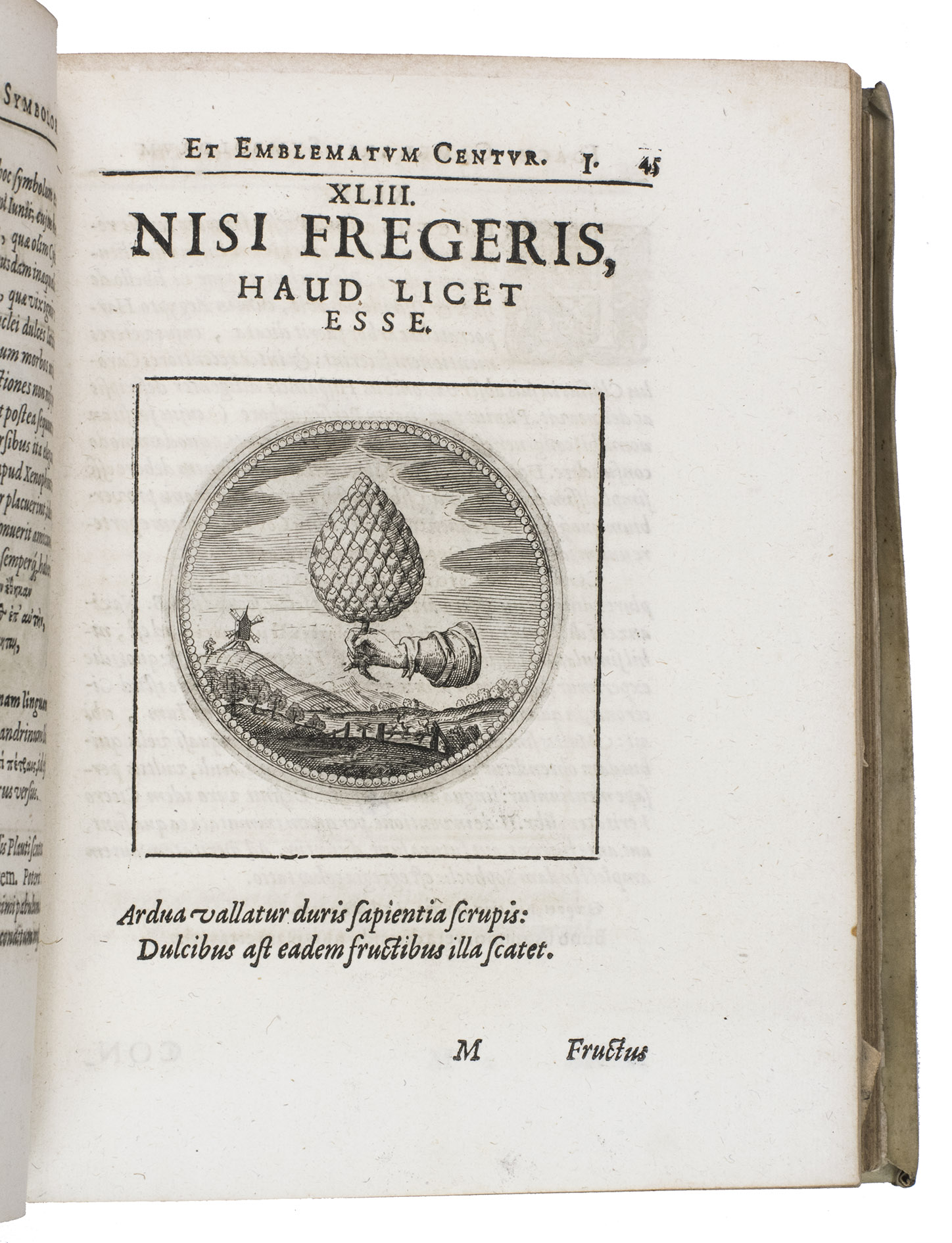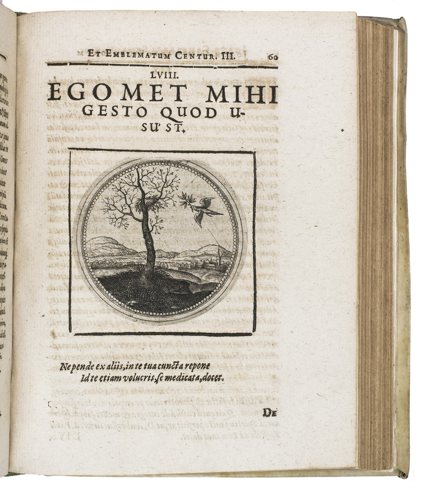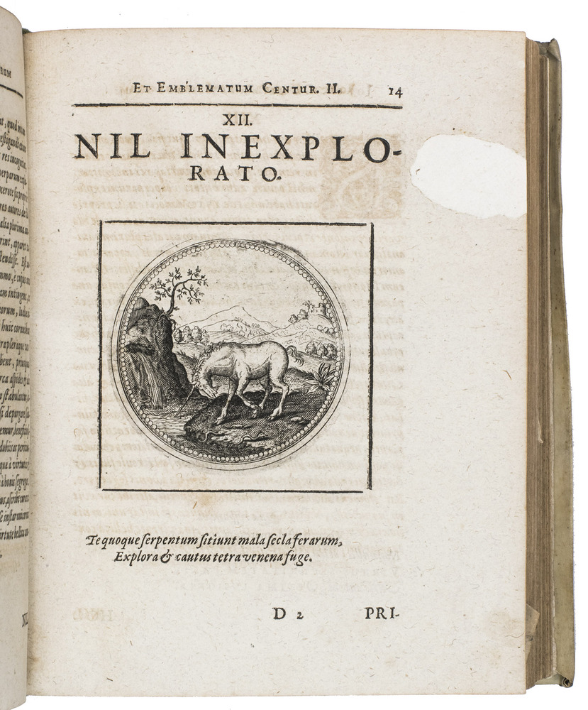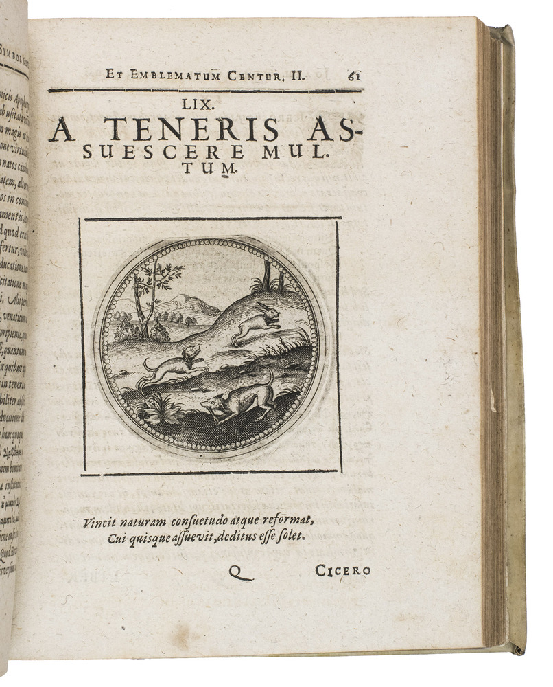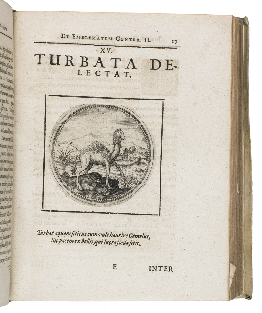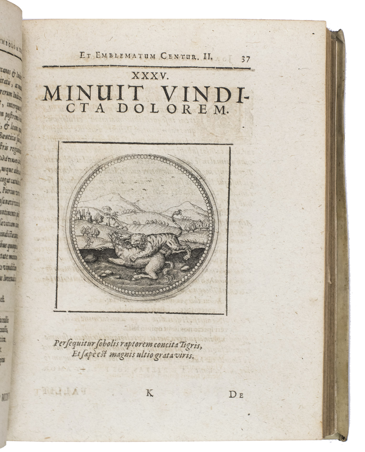With a large armorial bookplate mounted on the front pastedown, and an illegible manuscript inscription on the engraved title page of ad 1. The binding is slightly (dust) soiled and shows a few (ink) stains, 6 leaves with marginal repair to paper, some minor browning to the top edge, slightly affecting the head margin throughout but never affecting text or emblem, some occasional light foxing and browning. Otherwise in good condition. Adams C448; Faber du Faur, 668; Folger IV, p. 350; Henkel & Schöne, Emblemata, pp. xxxviii-xxxix; Hunt, 181; Krivatsy, 2066; Landwehr, German emblem books, 167 (ad 3) and 169 (ads 1 & 2); Manning, The Emblem, p. 120; Nissen BBI 312; Nissen ZBI 792 & 793; Praz, pp. 295-296; USTC 2567143 (ad 1, 6 copies), 2567135 (ad 2, 4 copies), 2635767 (ad 3, 3 copies); 2808385 (ad 4, 2 copies); VD17 23:278138E (general), VD17 23:278133S (ad 1, 7 copies), VD17 1:078865L (ad 2, 5 copies), VD17 23:27837X (ad 3, 4 copies); Wenning, Joachim II. Camerarius. Eine Studie über sein Leben; cf. ad 4 not in VD17 or in Landwehr, German emblem books.