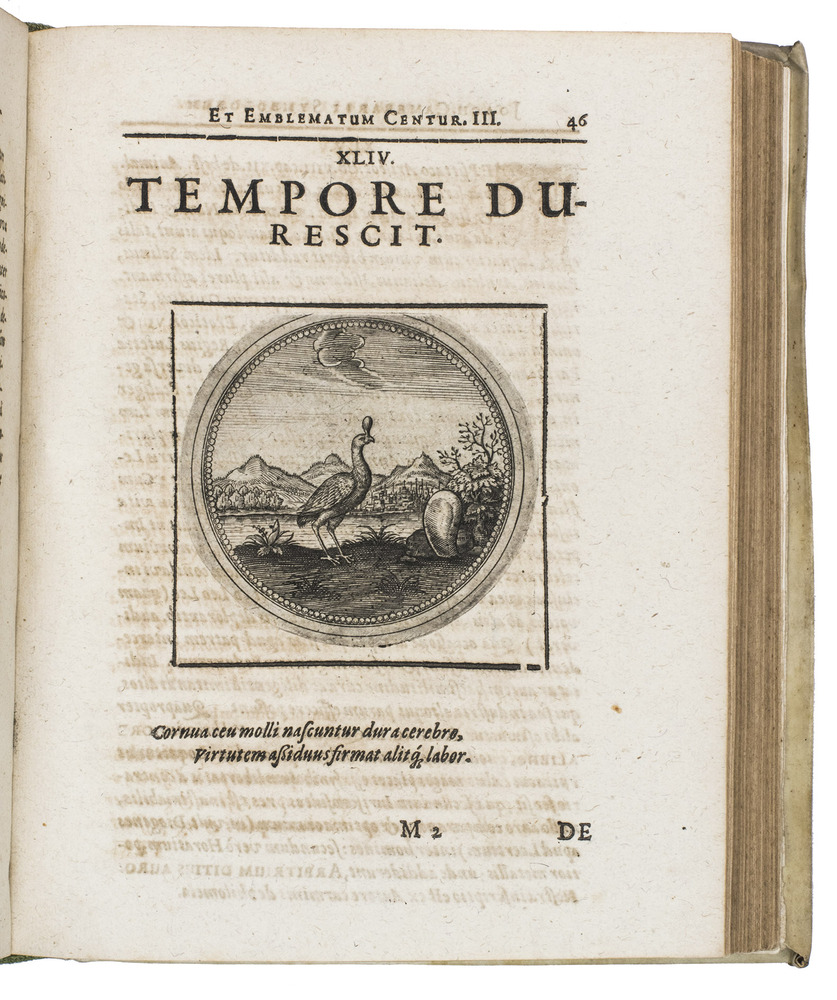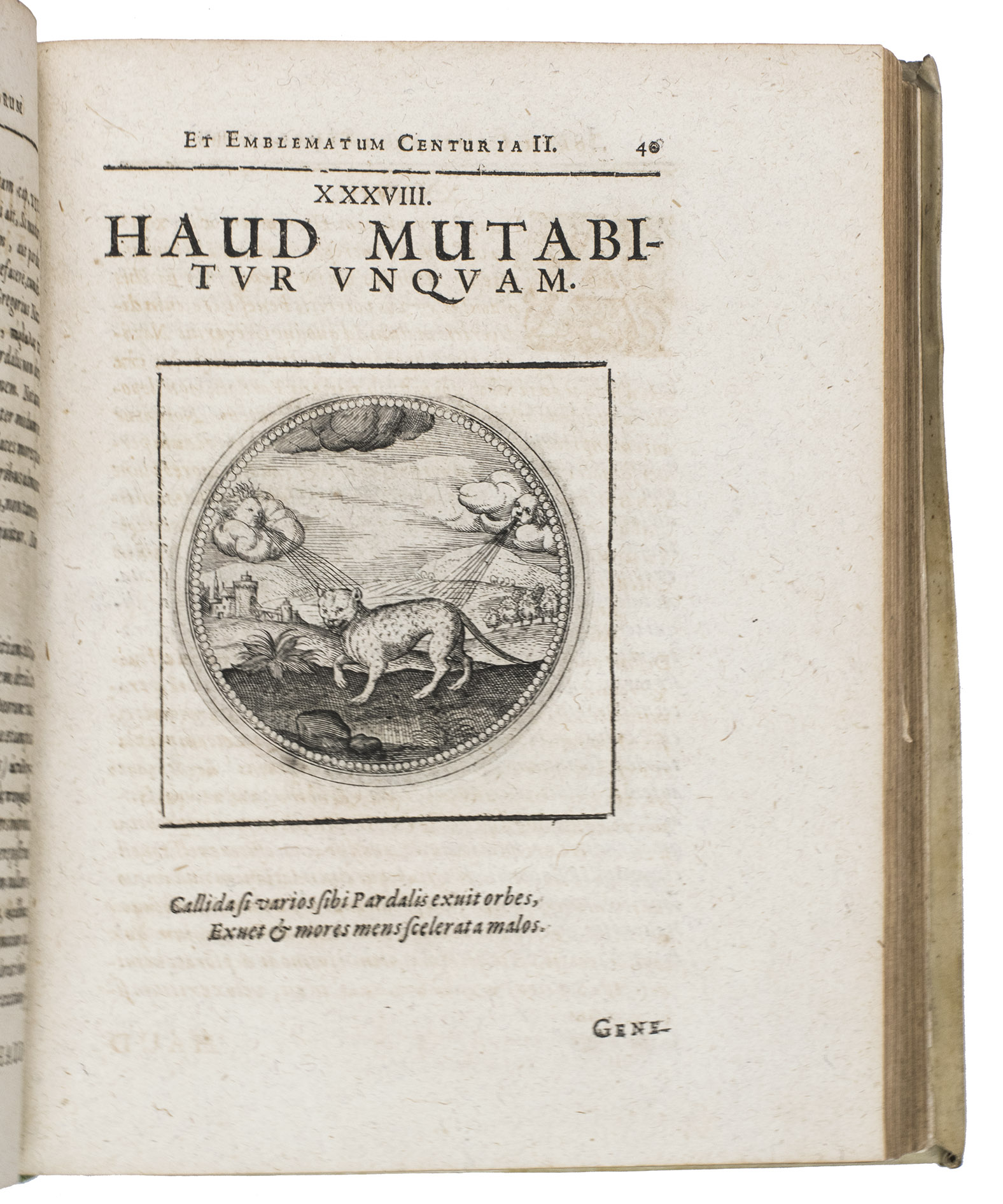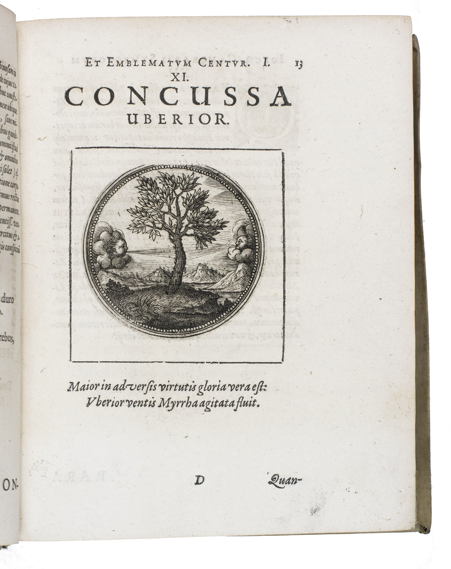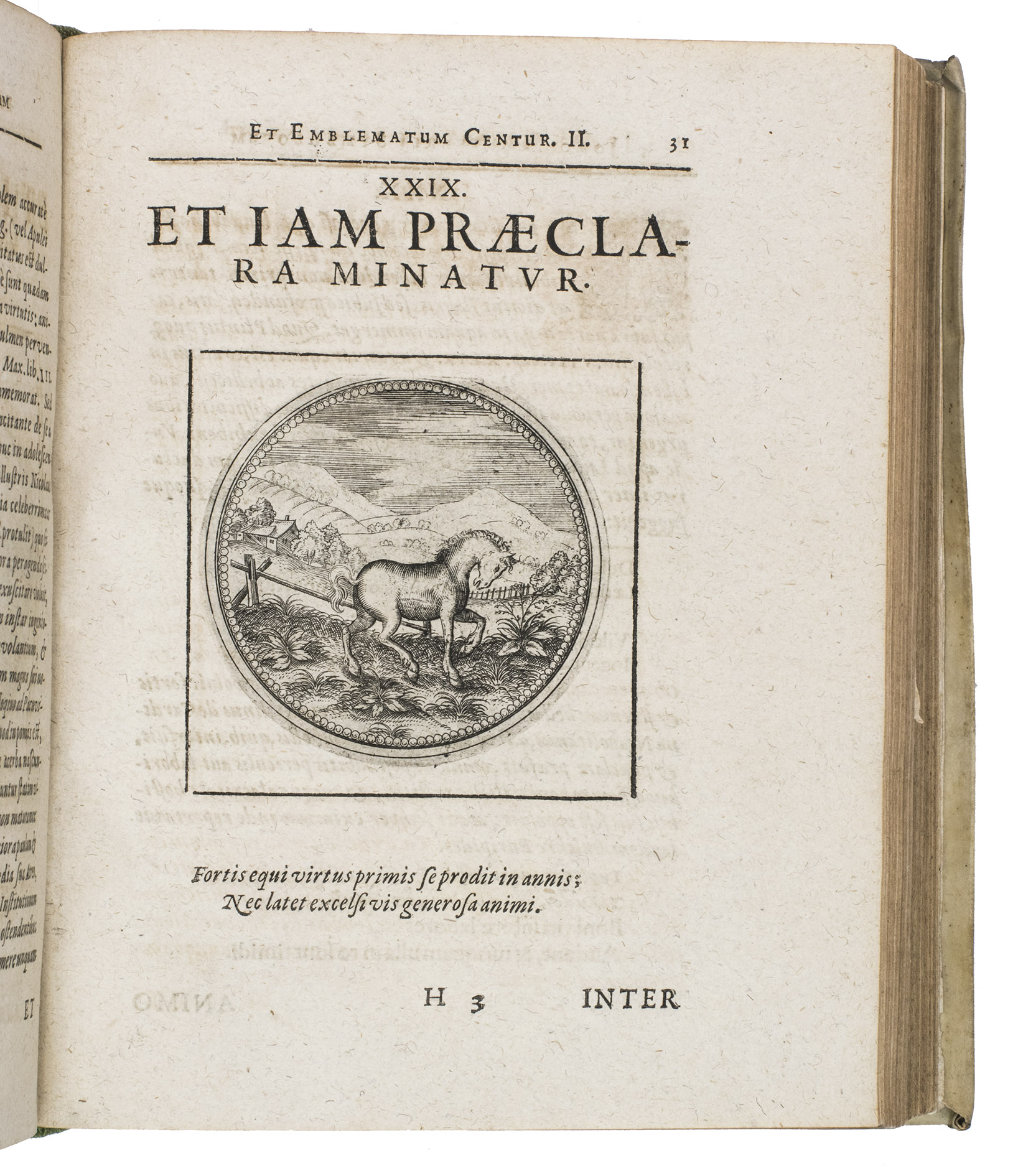 With a large armorial bookplate mounted on the front pastedown, and an illegible manuscript inscription on the engraved title page of ad 1. The binding is slightly (dust) soiled and shows a few (ink) stains, 6 leaves with marginal repair to paper, some minor browning to the top edge, slightly affecting the head margin throughout but never affecting text or emblem, some occasional light foxing and browning. Otherwise in good condition. Adams C448; Faber du Faur, 668; Folger IV, p. 350; Henkel & Schöne, Emblemata, pp. xxxviii-xxxix; Hunt, 181; Krivatsy, 2066; Landwehr, German emblem books, 167 (ad 3) and 169 (ads 1 & 2); Manning, The Emblem, p. 120; Nissen BBI 312; Nissen ZBI 792 & 793; Praz, pp. 295-296; USTC 2567143 (ad 1, 6 copies), 2567135 (ad 2, 4 copies), 2635767 (ad 3, 3 copies); 2808385 (ad 4, 2 copies); VD17 23:278138E (general), VD17 23:278133S (ad 1, 7 copies), VD17 1:078865L (ad 2, 5 copies), VD17 23:27837X (ad 3, 4 copies); Wenning, Joachim II. Camerarius. Eine Studie über sein Leben; cf. ad 4 not in VD17 or in Landwehr, German emblem books.