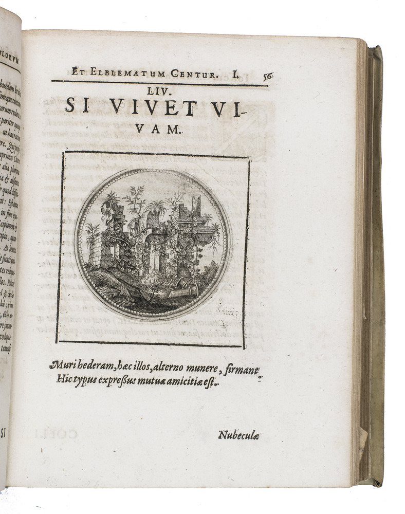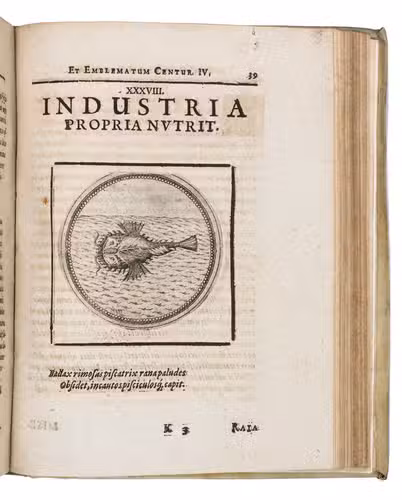 This work by Camerarius was the first to treat the subject of natural history in emblematic form. Each emblem has its own title above and a short motto beneath the illustration, an extensive explanation can be found on the facing page, these explanations are influenced by Renaissance hieroglyph studies, Camerarius knowledge of nature based on Plinius and other classical scholars, the author's own experience as a botanist, and on contemporary authors like Conrad Gesner and others.