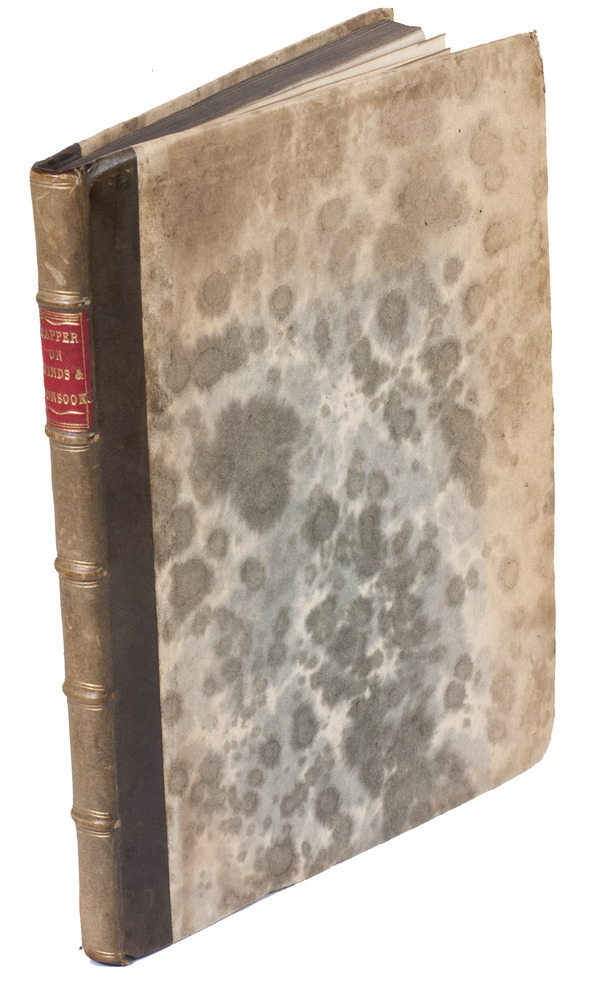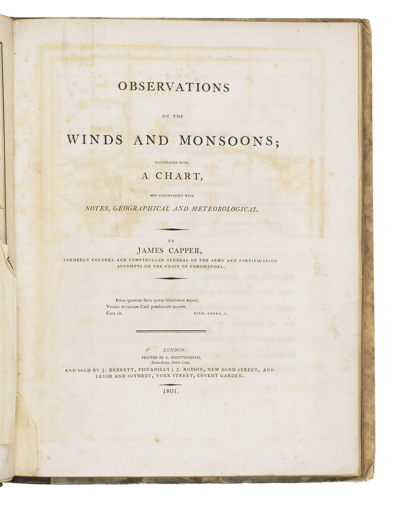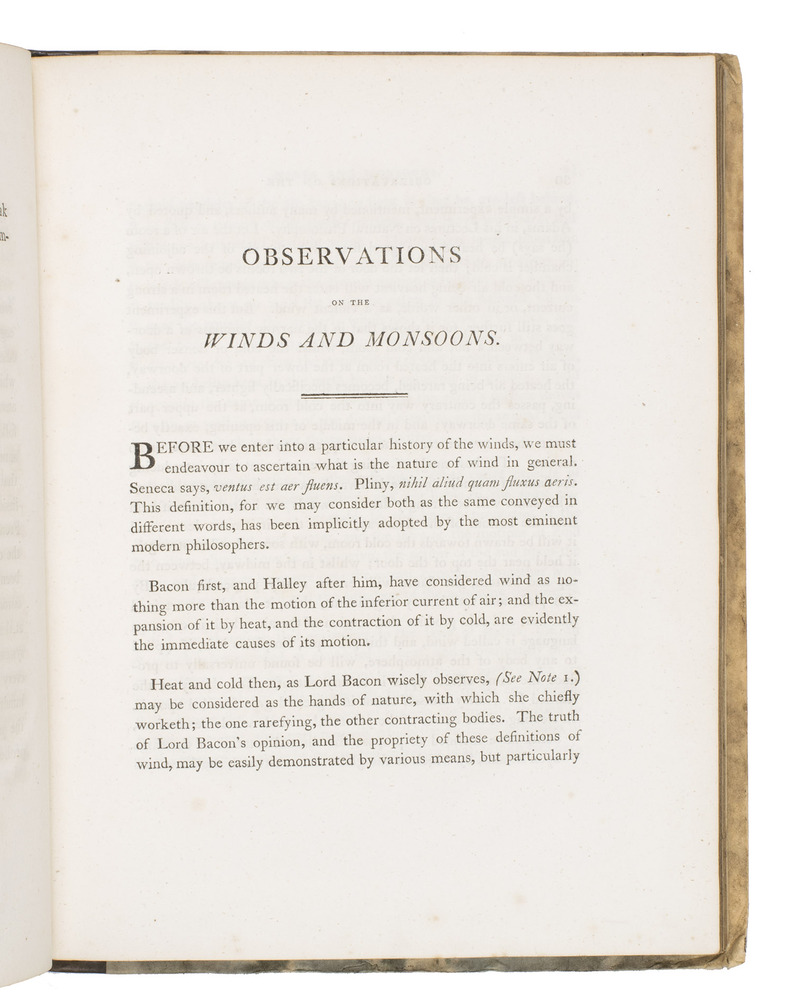 First edition of a rare geographical and meteorological treatise on the winds and weather in different places around the world, written by James Capper (1743-1825). Capper was a former colonel in the East India Company, but after his return to England, he devoted much of his time to meteorology. In his present Observations of the winds and monsoons, Capper especially concentrates on the winds and weather of the East Indies, the coast of India and the Arabian and Persian Gulf, using information he obtained by his own observations, some ships' logs and earlier publications. He also discusses the meteorology of the Mediterranean, including Greece and the climate between the Adriatic and the Archipelago. He describes in a very scholarly manner several kinds of winds, such as monsoons, hurricanes or the so-called "Sumyel", which is an east wind, and the "Harmattan", which is a land wind that also blows, according to Capper, in the Gulf of Guinea and along the other western coasts of Africa. He discusses their effect on the climate and the weather. Although he acknowledges in his preface that he borrows some information from other scholars, such as Bacon, Franklin, Bishop Watson, Kirwan "and other eminent philosophers", Capper also introduces a new hypothesis in this work, namely that hurricanes are a type of whirlwind. This makes Capper's Observations on the winds and monsoons not only a survey of what was already known about winds and weather in different parts of the world, supplemented with his own observations, but also an important original contribution - due to his own travels with the East India Company. Moreover, it gives a lively and extensive account of the direction of prevailing winds and the climate in different parts of the world, with particular detail for the Indian coasts and the Arabian and Persian Gulf.