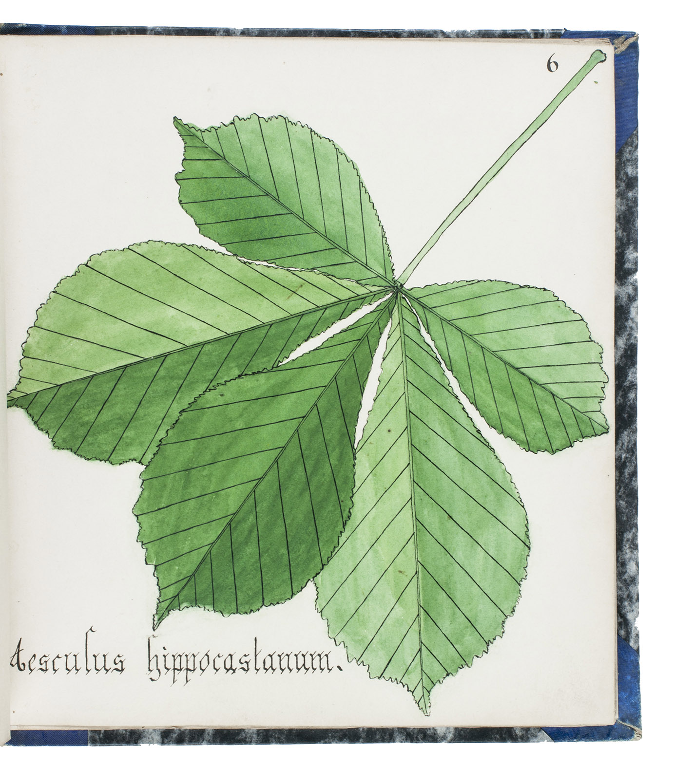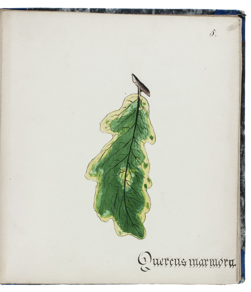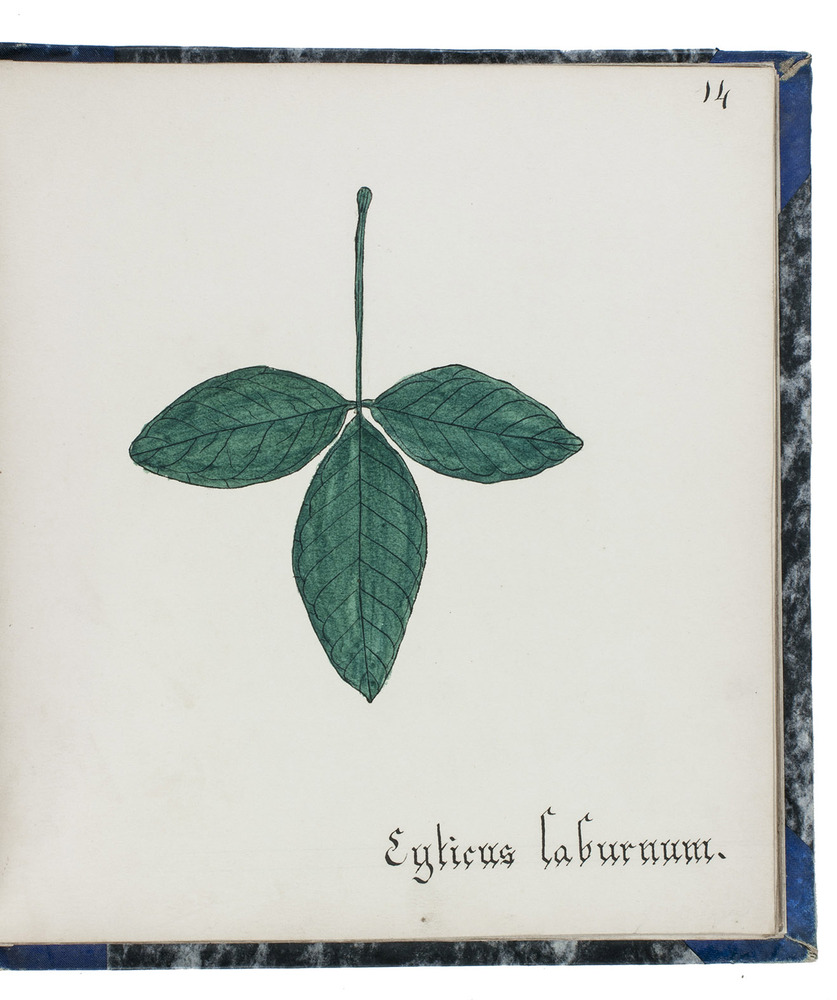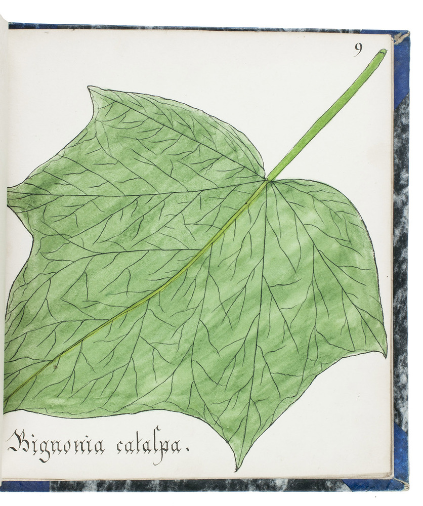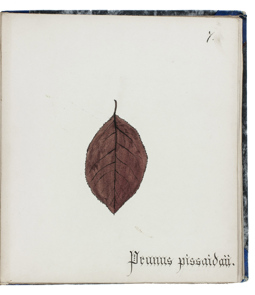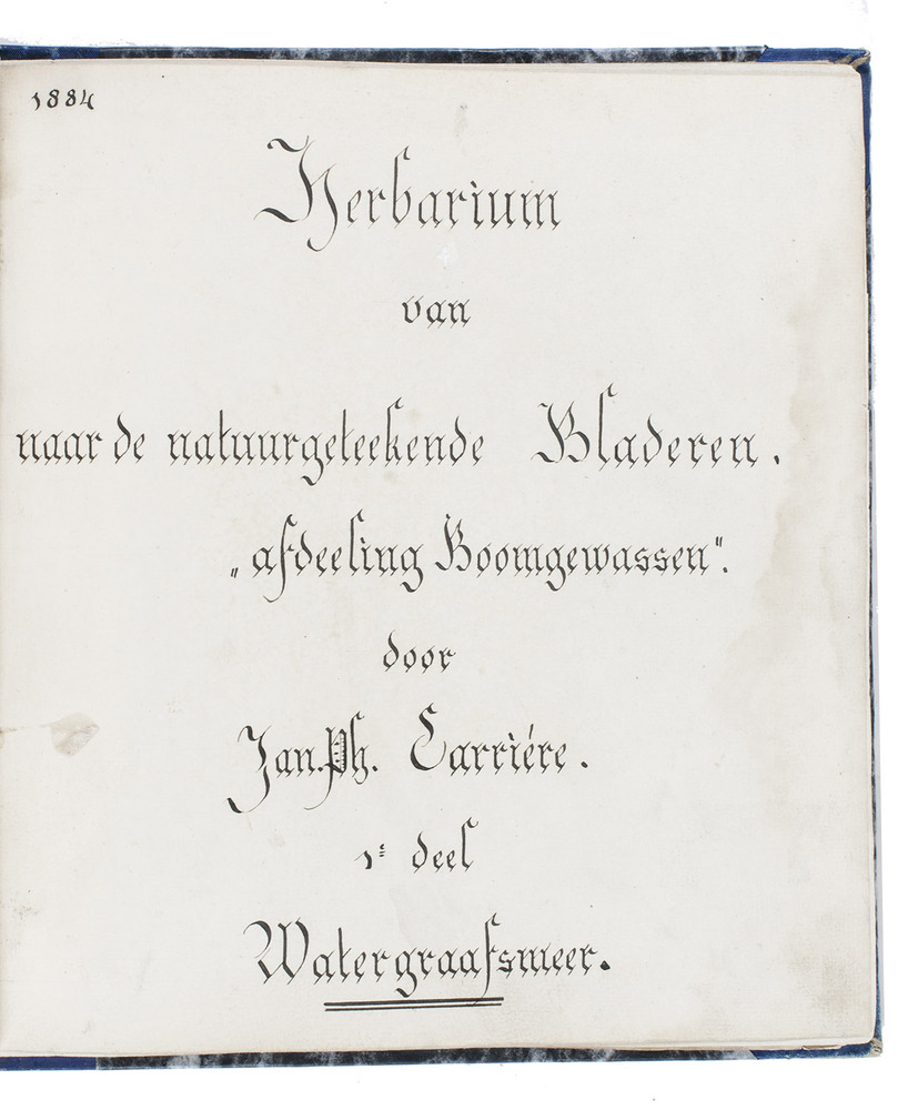 Watergraafsmeer, 1884. 3 volumes. Small folio (22.5×20.5 cm). With 90 drawings of tree leaves in watercolour and ink, with a description in Dutch on a separate leaf. The first two volumes each with a title-page, a table of contents (1 page) and an introduction (1 page), and the third volume without preliminaries. Contemporary blue (vols. 1-2) and black (vol. 3) half cloth. The third volume rebacked with original backstrip laid down.