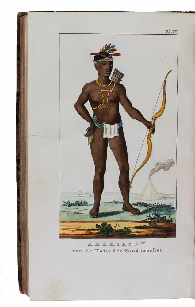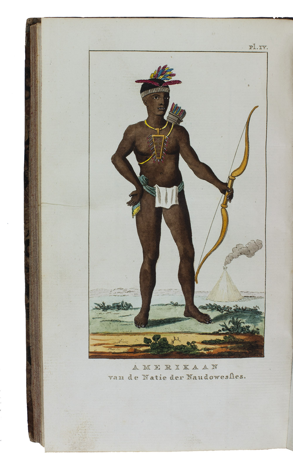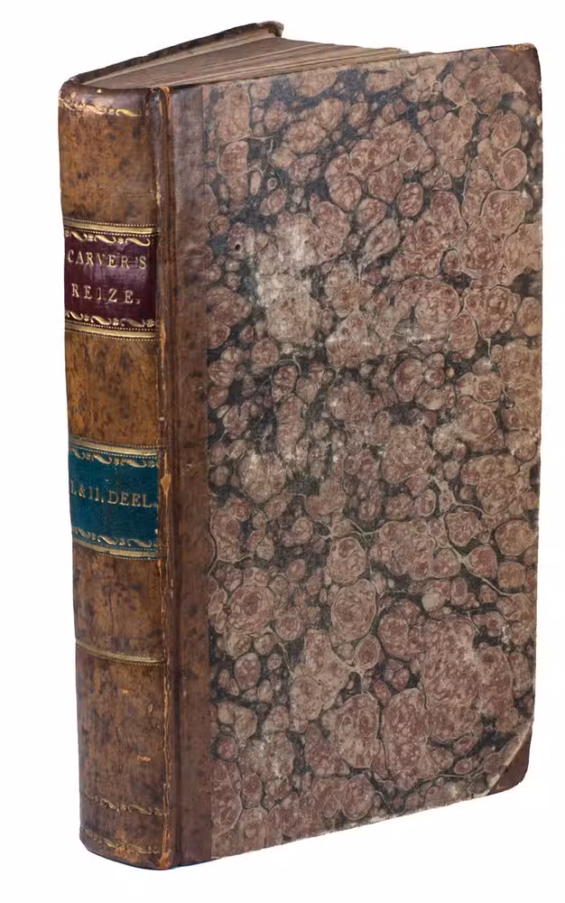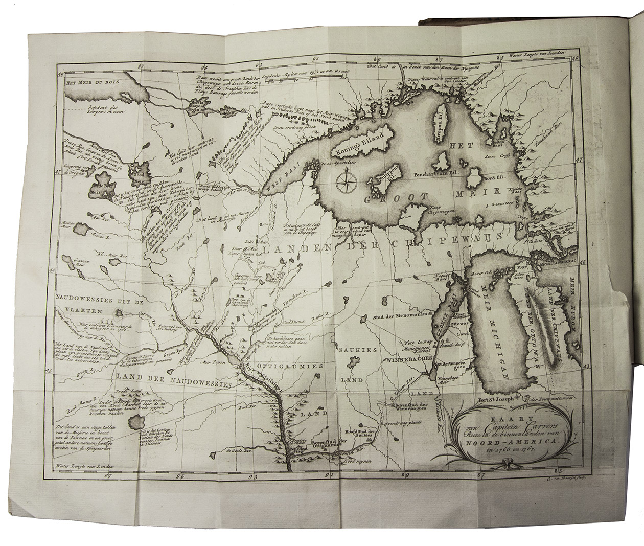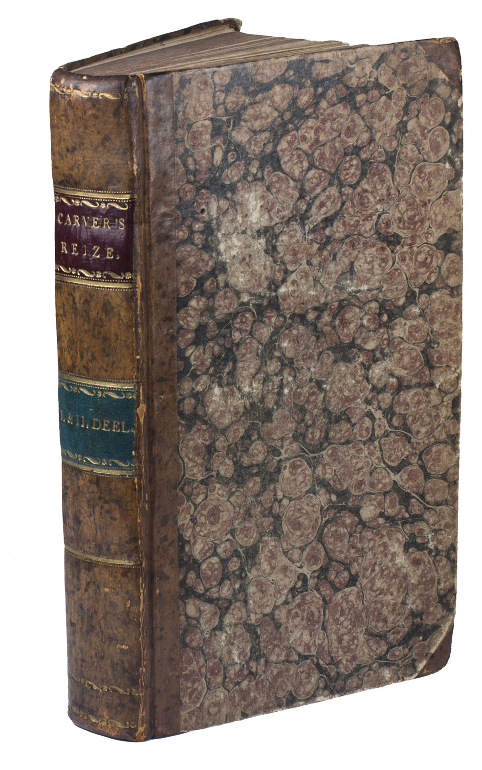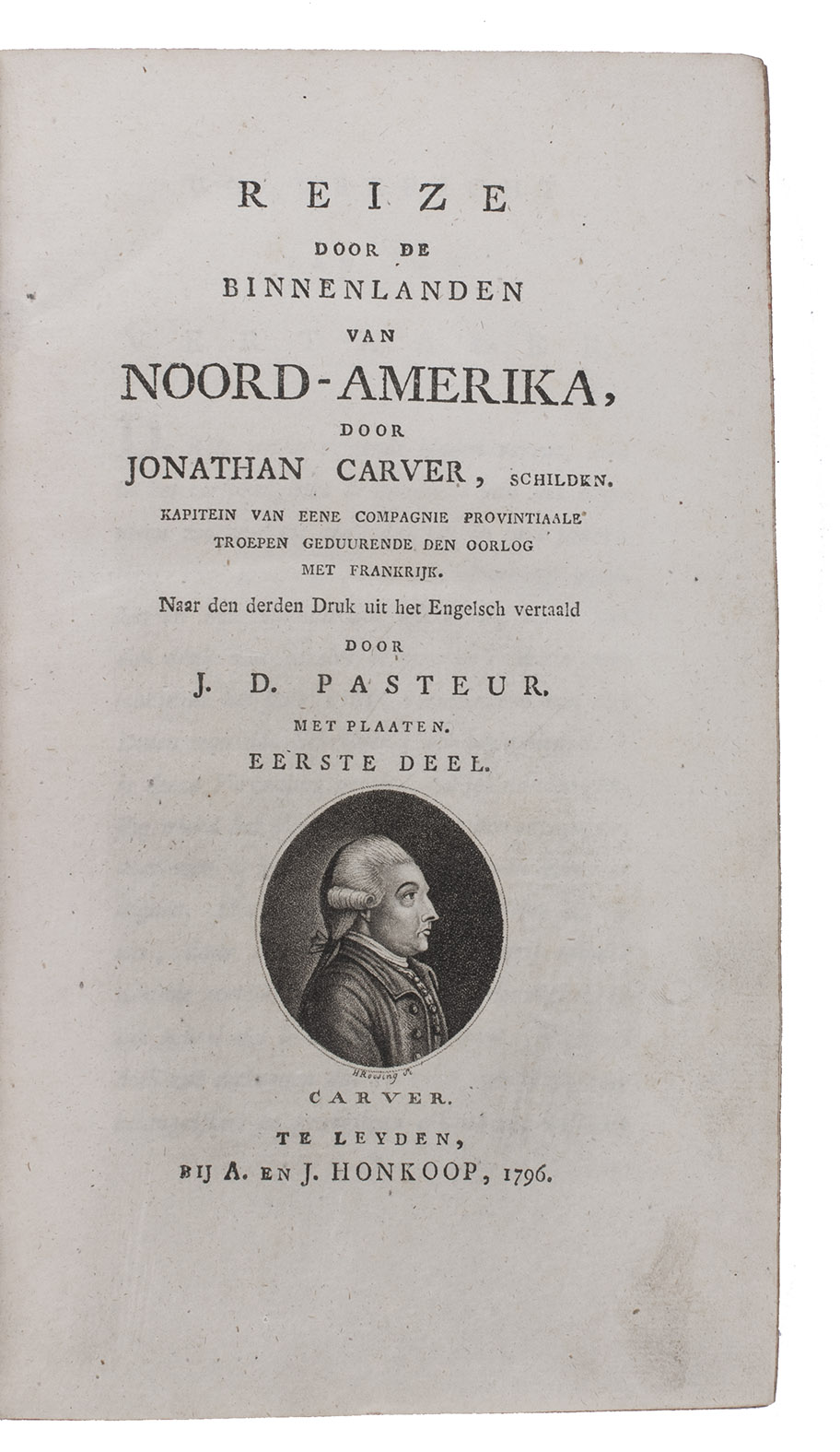 First edition of the Dutch translation of a travelogue of North America by the English-American colonial captain Jonathan Carver (1710-1780). "In 1766 Carver was employed ... to explore to the west of the Great Lake in an attempt to contact the Sioux Indians. ... After wintering with the Indians on the Ste Croix River, Carver set out to return to Mackinac, but at the mouth of the Wisconsin met Captain James Tute, in command of a party send out to explore a route to the Pacific Ocean" (Howgego). The folding map shows the midlands of North America, the folding plate the St. Anthony waterfall in the Mississippi River and the hand-coloured engravings show different native American Indians.