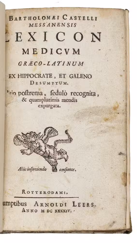 Rare first Netherlands edition (1644) of a medical dictionary first published in 1598 but expanded in later editions, giving a description and symptoms of various afflictions. "Many medical dictionaries were published in this period. The most remarkable were ... and the Greek and Latin lexica of Bartolommeo Castelli" (Garrison). Castelli (d. 1607) based much of his information on the works of Galen and Hippocrates. The main text is followed by a small dictionary translating some Arabic words into Greek and Latin, which can subsequently be looked up in the main text. Altogether an important and influential medical dictionary, functioning as main entry for doing research upon various diseases.