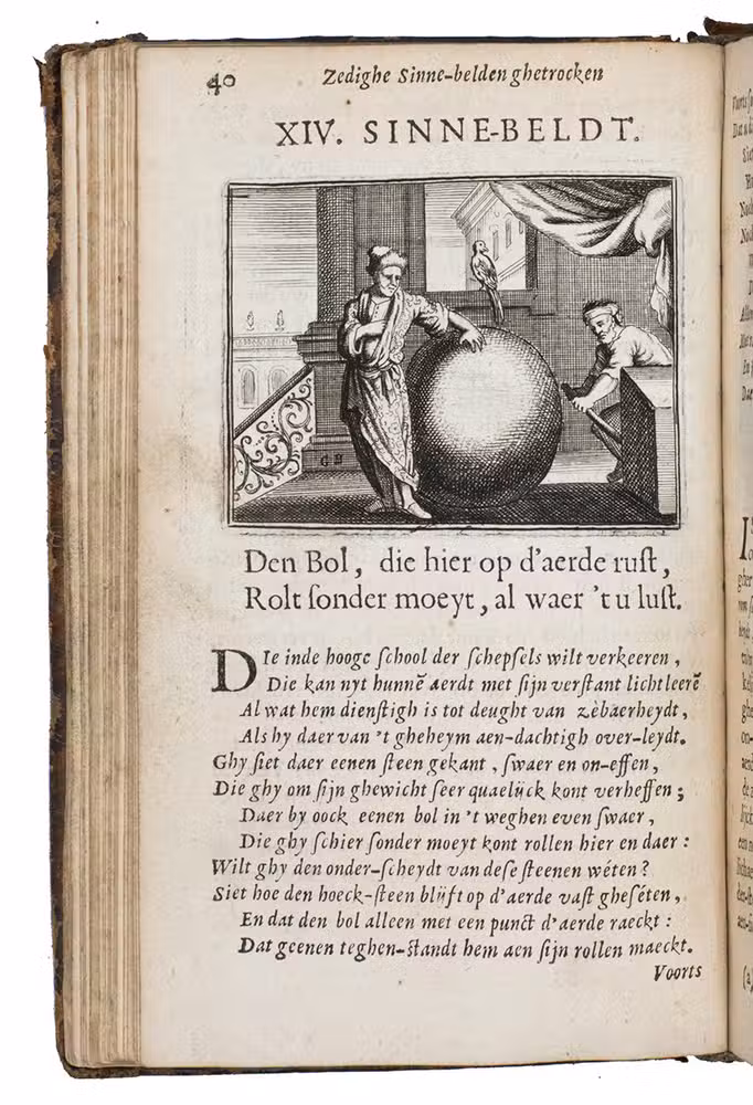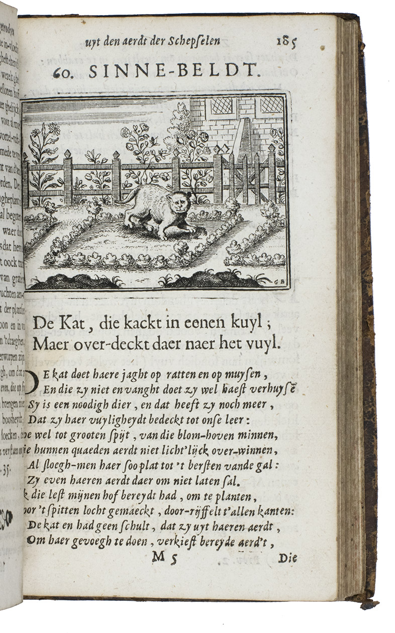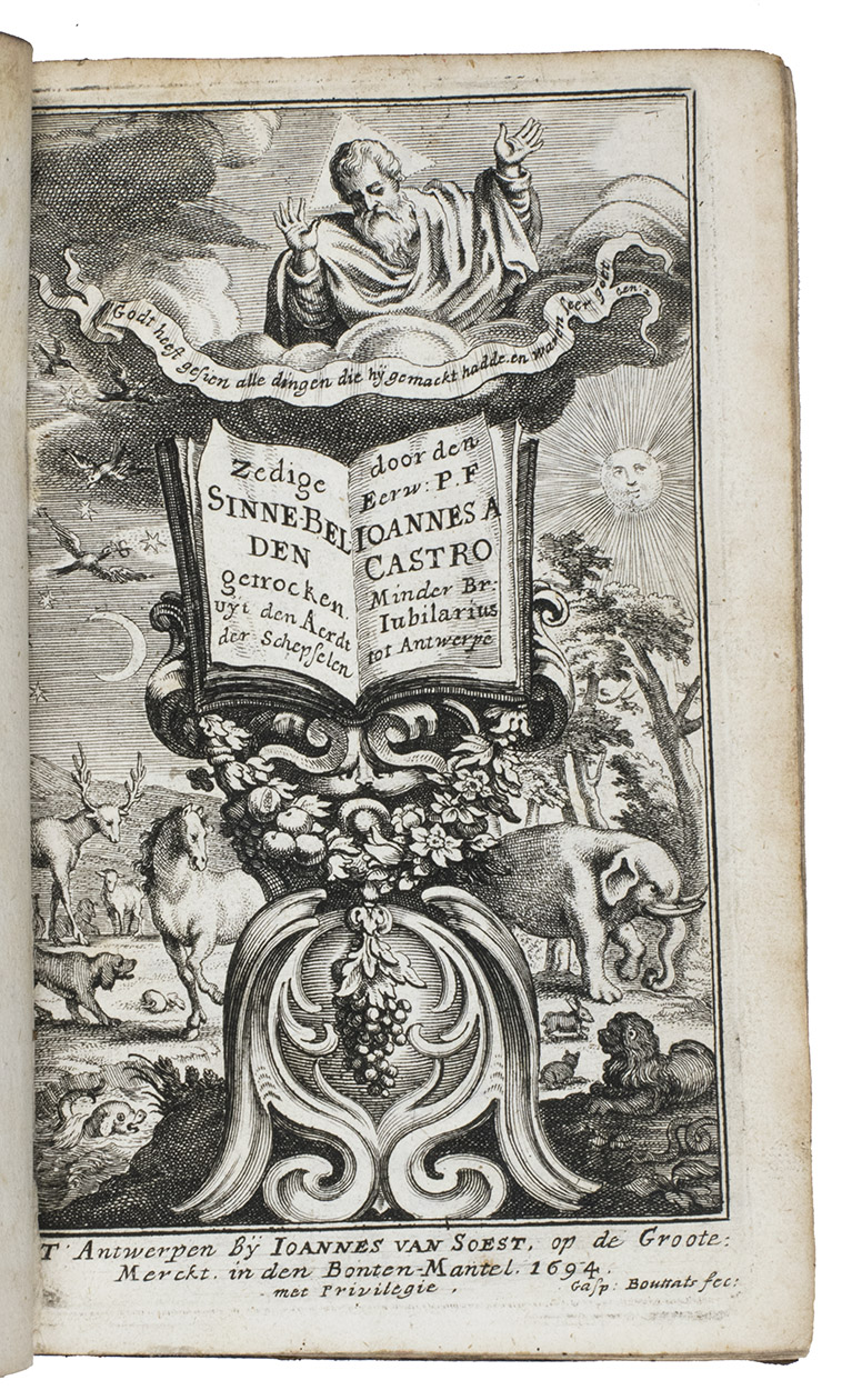 First and only edition of an educational emblem book by Johannes à Castro, or Jean van der Borcht, poet and Franciscan at Antwerp. According to the preface our author was 73 years old when he wrote the present work. He also states that he based all his emblems on nature as the teacher of men, and he claimed that even illiterate people could enjoy the book. But he clearly meant "nature" to include the human race, since many emblems are about men (and women) as well. Thus, several emblems have a merchant as the main figure, like the one with the motto: "Die ver'rijst met sijn wissel-brief, vindt buyten 'slands oock sijn gerief" (Who travels with his letter of exchange, will also find his comfort abroad), and another emblem warns against moths in the closet. He probably knew the emblems of Jacob Cats well. The printer, Joannes van Soest, set the two-page dedication to God the Father, the Son and the Holy Ghost, in about eight different types (roman, italic and textura), changing from line to line. All the emblems have a motto in the form of a distich and are accompanied by a long poem set in italic and an extensive prose explication set in roman type, with notes at the end giving the references to the scriptures. In addition to their religious and moral aspects, and their views of animals (most often in their contacts with people), the emblems show a wide variety of objects, activities and professions in scenes of daily life in 1694, including bloodletting and blacksmithing. They also show the rising interest in exotic lands, for example with two south Asian men attempting to capture an elephant, which seems to be capturing one of them. Although the text is nominally divided into two parts (emblems 1-57 in the first and 58-100 in the second), the second begins with only a drop-title on L7r, so the book could not reasonably be bound in two volumes. Gaspar Bouttats (1625-1695), a famous Antwerp engraver, provided the frontispiece (showing God the father looking down onto a landscape with a wide variety of animals, including an elephant) and all the emblems. An index of all mottoes is given at the end.