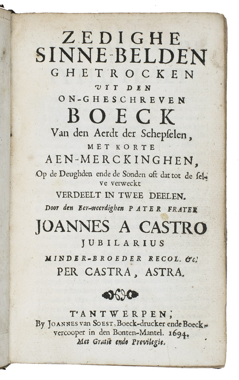Zedighe sinne-belden ghetrocken uit den on-gheschreven boeck van den aerdt der schepselen, met korte aen-merckinghen, op de deughden ende de sonden oft dat tot de selve verweckt, verdeelt in twee deelen.