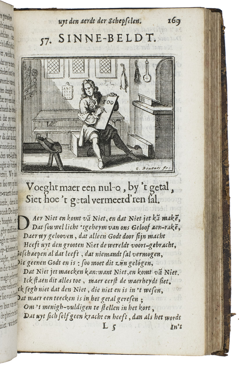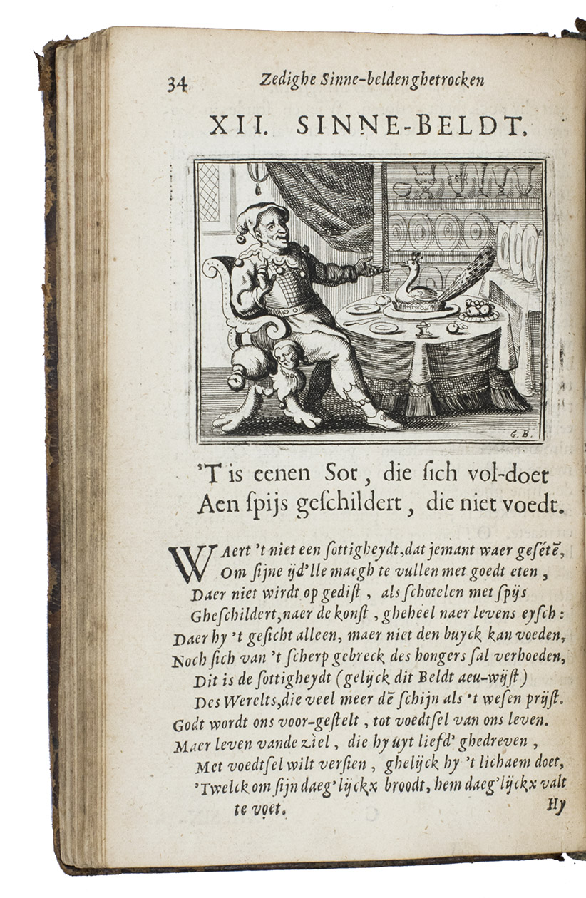 Antwerp, Joannes van Soest, 1694. 8vo. With richly engraved allegorical frontispiece and 100 finely engraved half-page emblems, all by Gaspar Bouttats. Further with 3 woodcut tailpieces, three woodcur decorated initials (1 series) and an occasional decoration built up from typographic ornaments Contemporary mottled tanned sheepskin. [24], 316, [10], [2 blank] pp.