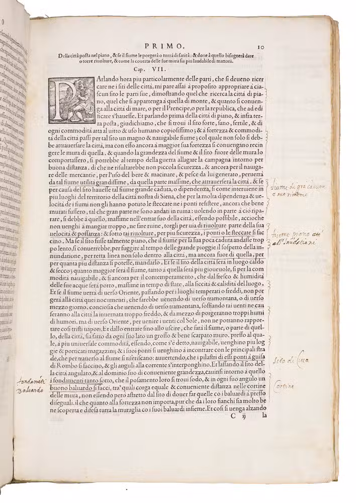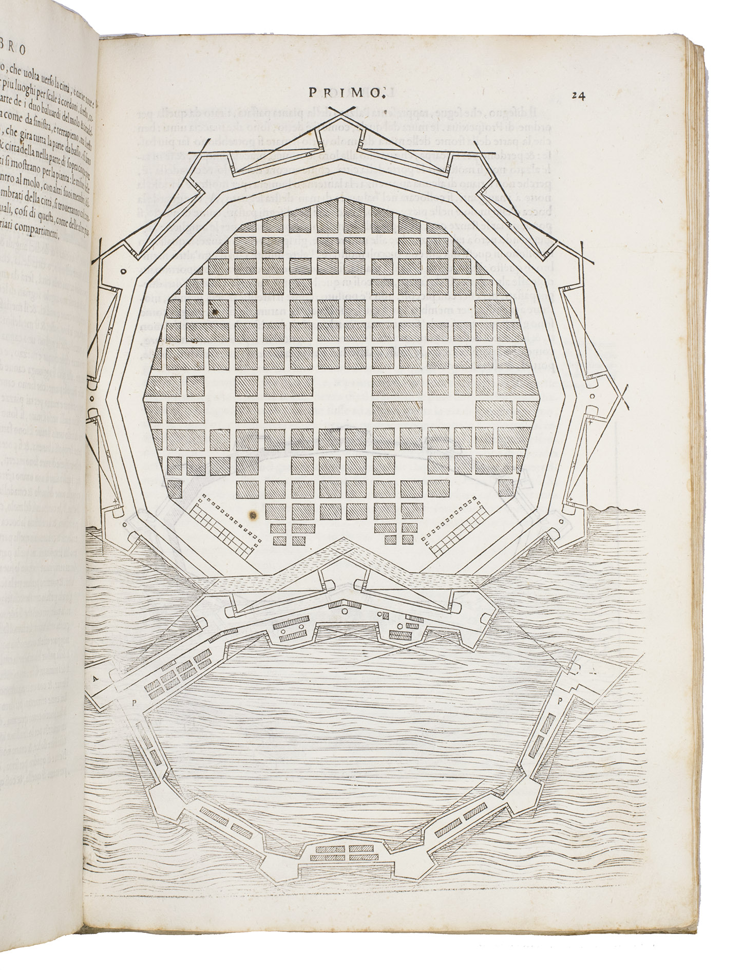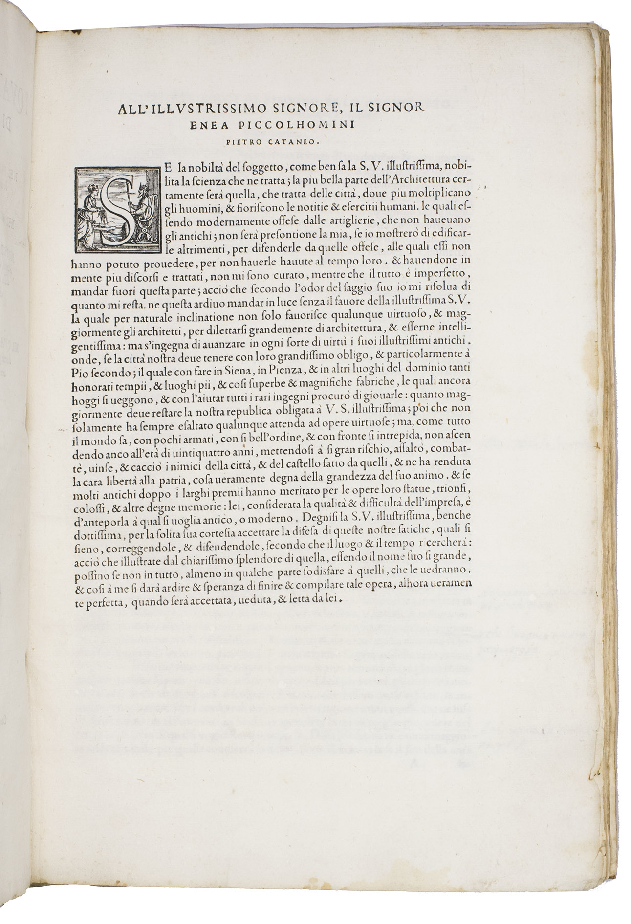 Rare first edition of a beautiful Renaissance woodcut book on architecture and perspectival design by Pietro Cataneo (died 1569), architect in Siena, where he built the Palazzo Franceschini and other important buildings in the Republic of Siena.