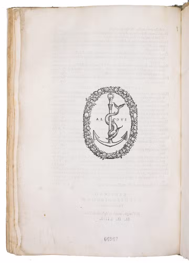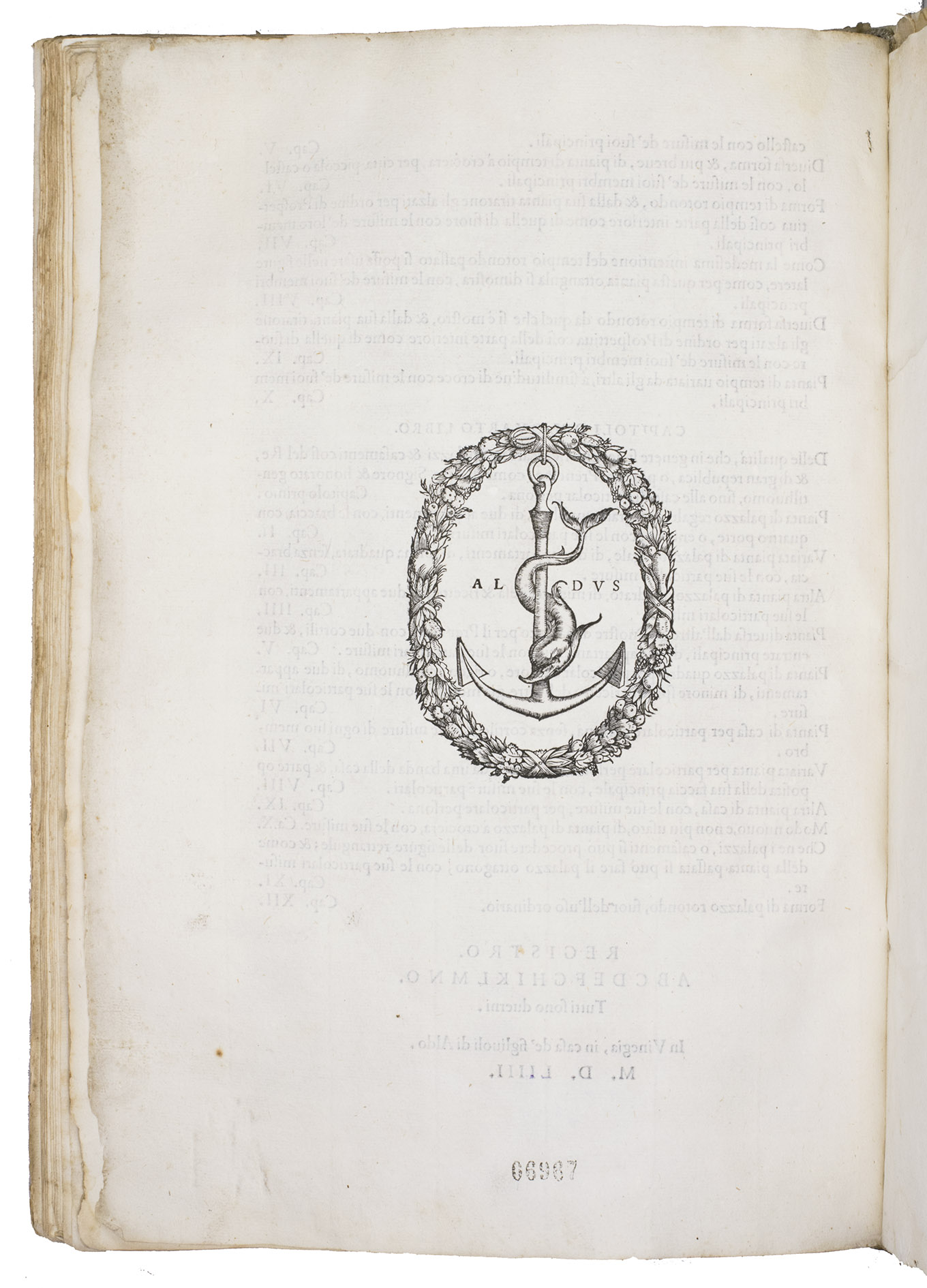 Venice, Aldus (sons of Aldo Manuzio), 1554. Folio. Woodcut printer's device of Aldus on title and on verso of last leaf, 43 woodcuts in text, of which 8 full-page. Contemp. limp vellum. [2], 54, [2] pp.