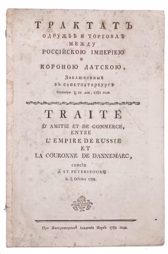 Very rare first edition, in Russian and French, of a treaty for friendship and commerce concluded at St Petersburg, negotiated between Tsarina Catherine the Great of Russia and King Christian VII of Denmark. The relationship between the two countries had become hostile after Peter III became the Russian Tsar in 1762. His descent from Holstein-Gottorf led to territorial conflicts between the two powers and even to a threat of war. When Catherina II took the throne their relation stabilized. In 1765 they made an alliance and in the 1773 Treaty of Tsarskoe Selo Russia returned Schleswig-Holstein to Denmark in exchange for Russian control over the Duchy of Oldenburg. The present treaty emphasizes the "peace" and "eternal friendship" between Russia and Denmark and gives specific conditions for trade.