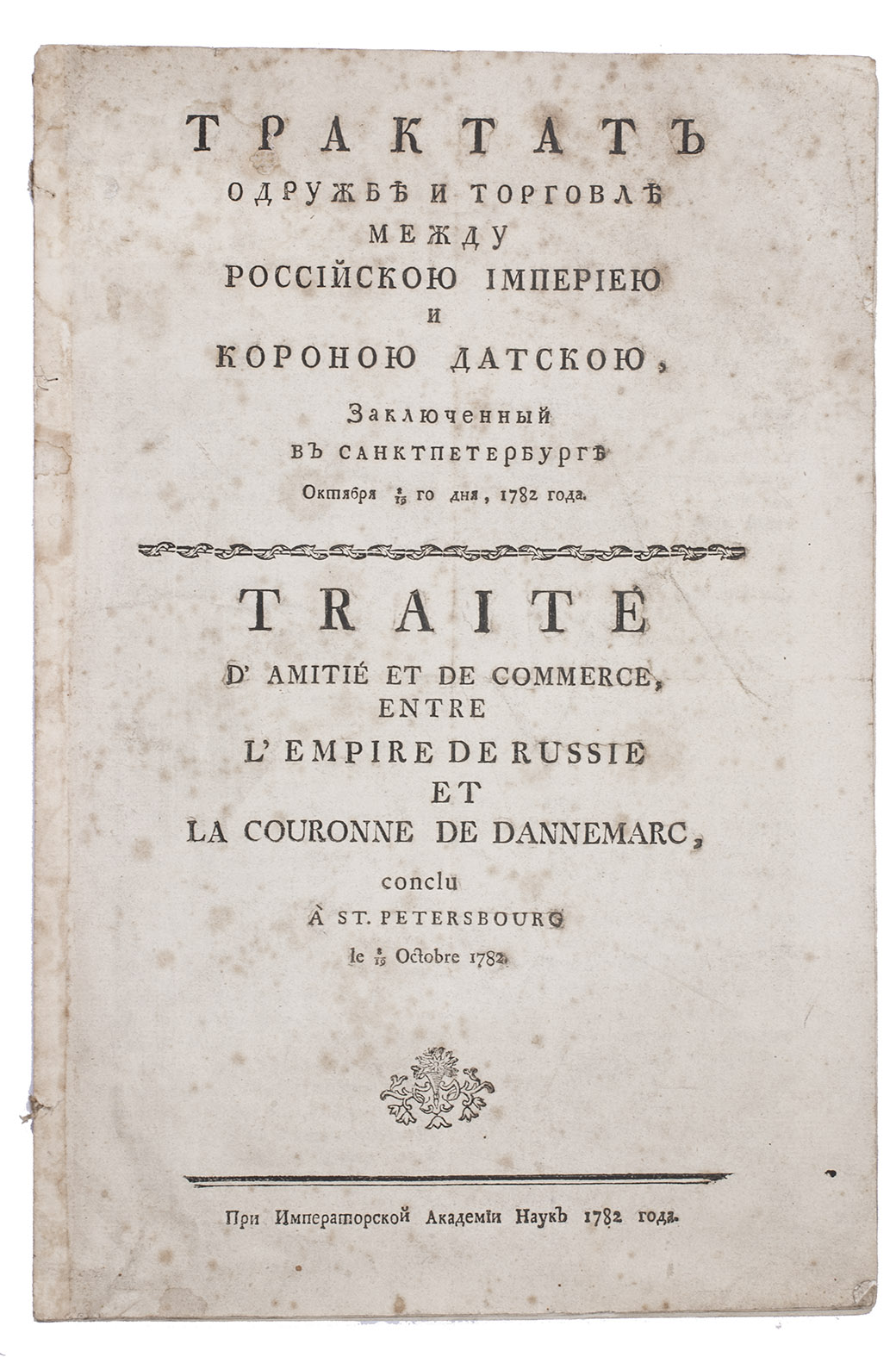 [Title in Russian followed on the same page by:] Traité d'amitié et de commerce, entre l'Empire de Russie et la couronne de Dannemarc, conclu à St. Petersbourg le 8-19 Octobre 1782.