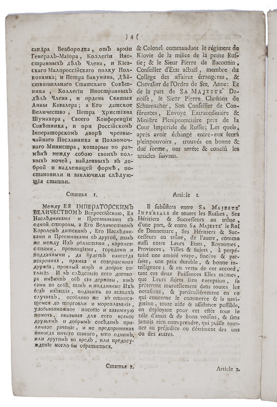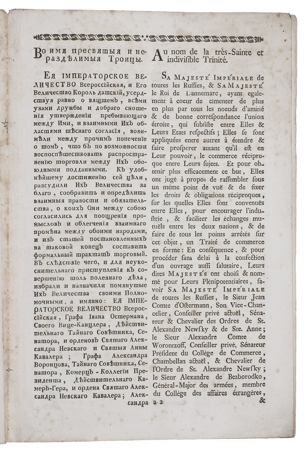 [St. Petersburg], Imperial Academy of Sciences, 1782. Small folio (29.5 x 19.5 cm). Treaty between Russia and Denmark in Russian and French in 2 parallel columns in cyrillic (left) and roman (right) types. Disbound. 22 pp.